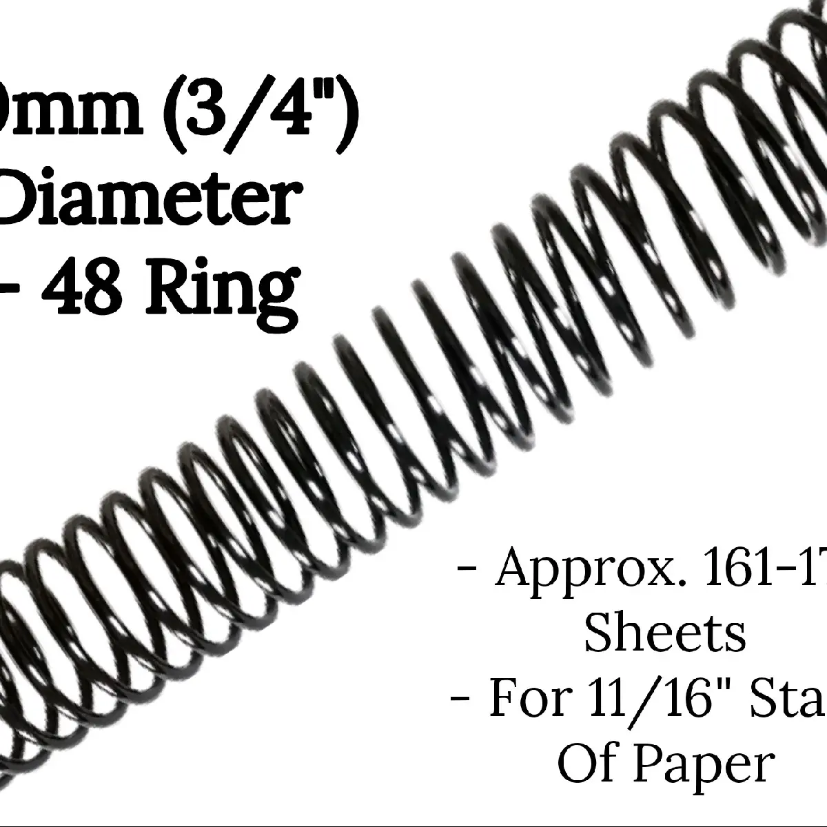 These 3/4” binding spirals are a great way to bind documents, reports, presentations, and more. They are made of durable black plastic and have a 48-ring design that can hold up to 170 sheets of paper. The spirals are 12 inches long and 3/4 inch in diameter, so they are perfect for standard letter-sized paper or smaller.