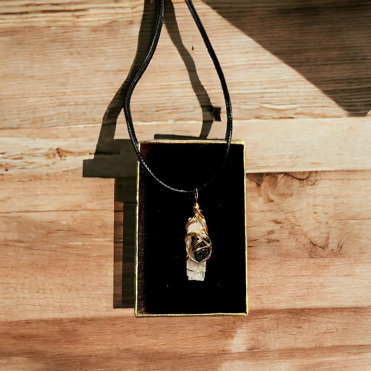 White Selenite and Black Tourmaline Necklace, Selenite with tourmaline for protection, cleansing, motivation, healing, wire wrapped gemstone necklace, Wire wrapped crystals, combination necklace