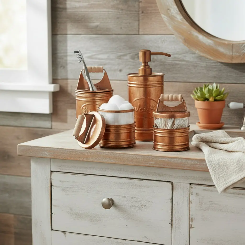 Pair this copper farmhouse bathroom set with our matching copper wastebaskets and toilet brushes to complete the look.