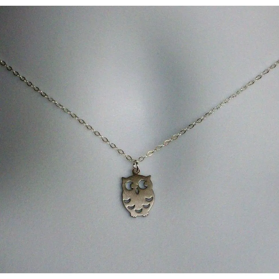 This Sterling Silver Owl Necklace is a Rhodium Plated Owl Pendant hanging from Sterling Silver Chain. The Findings and Spring Ring Clasp are also Sterling Silver.