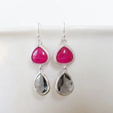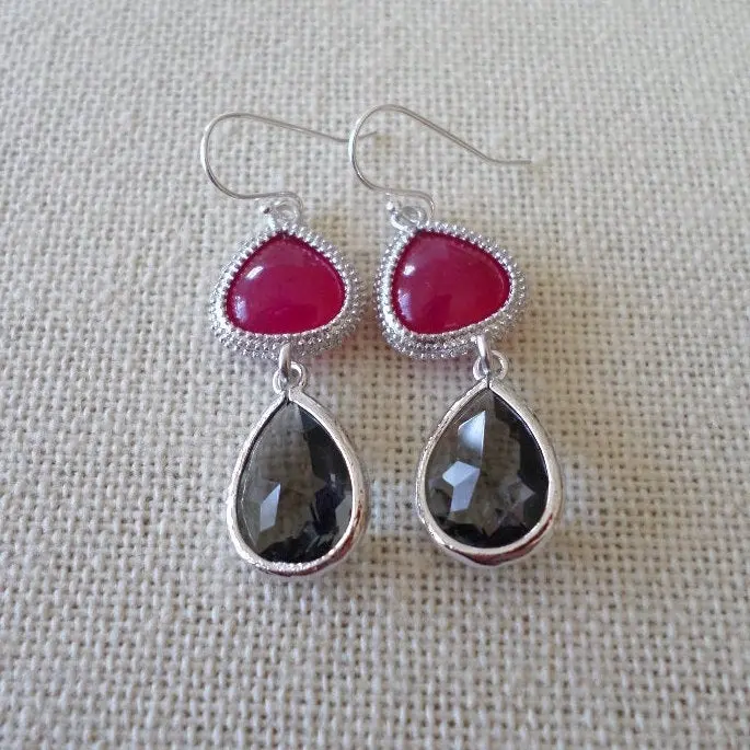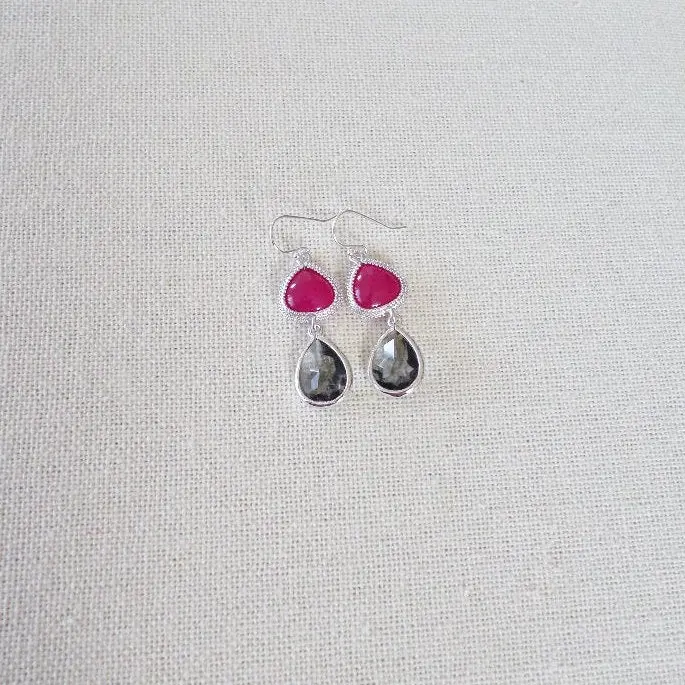 Pink and Grey Earrings - Fuschia and Charcoal Earrings - Silver Earrings - Gray Earrings - Weddings - Bridal - Mothers Day Gift