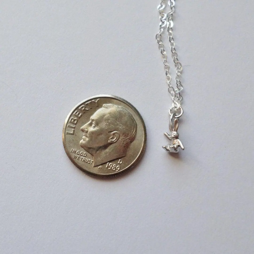 This Sterling Silver Teeny Tiny Rabbit Necklace is a Rhodium Plated Really Tiny 3d Rabbit Pendant hanging from Sterling Silver Chain. The Findings and Spring Ring Clasp are also Sterling Silver.