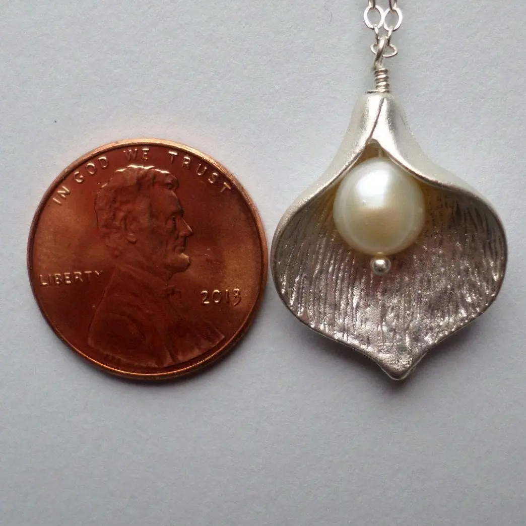 This Sterling Silver Calla Lily and Freshwater Pearl Necklace is a 6 - 8 mm Cream Freshwater Pearl wrapped and used as the seed of a rhodium plated calla lily pendant. The pendant is hanging on Sterling Silver chain. The Findings and Spring Ring Clasp are also Sterling Silver.