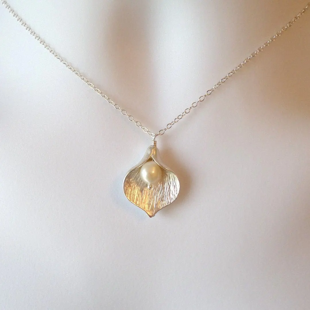 Calla Lily Necklace - Silver Calla Lily and Freshwater Pearl Necklace - Cream Pearl Necklace - Flower Necklace - Christmas Gift - Natural Jewelry - Birthstone Jewelry
