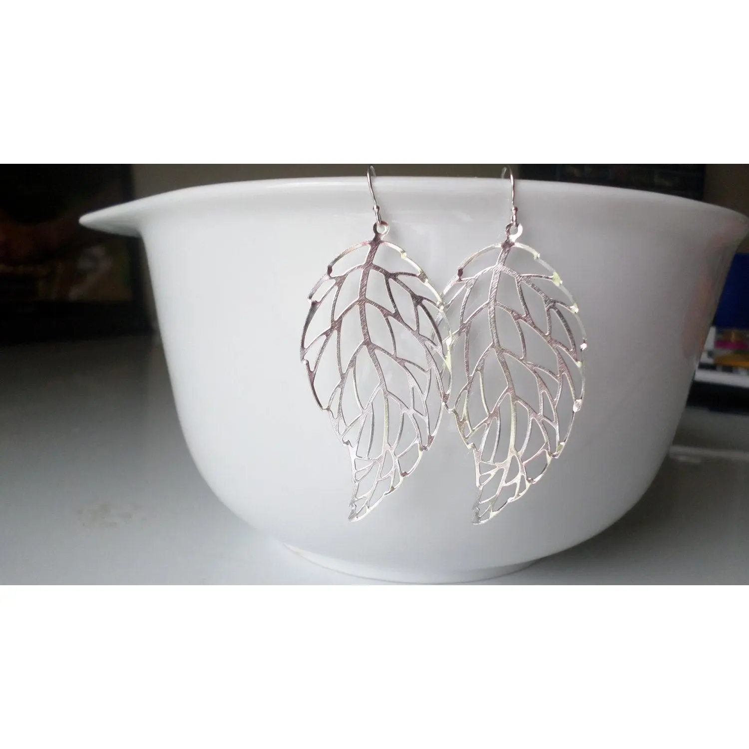 These earrings are silver rhodium plated leaves on sterling French ear wires. They measure 2 3/4 inches long and 1 inch wide from top to bottom.