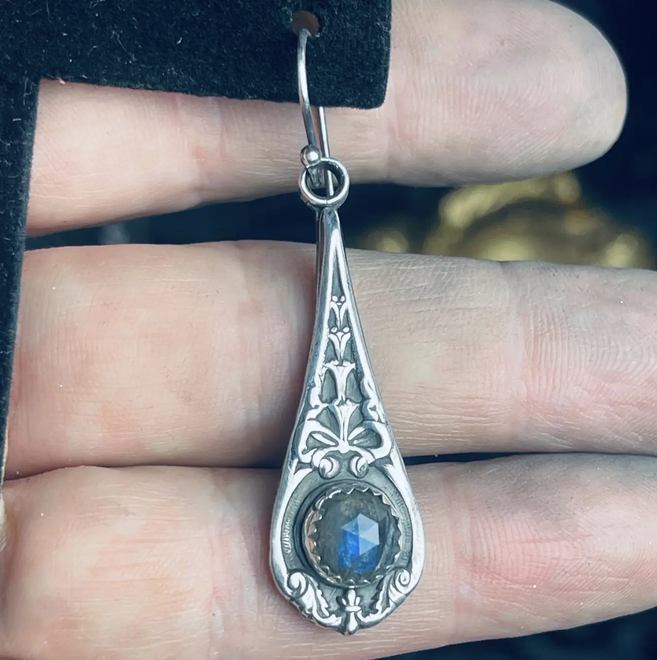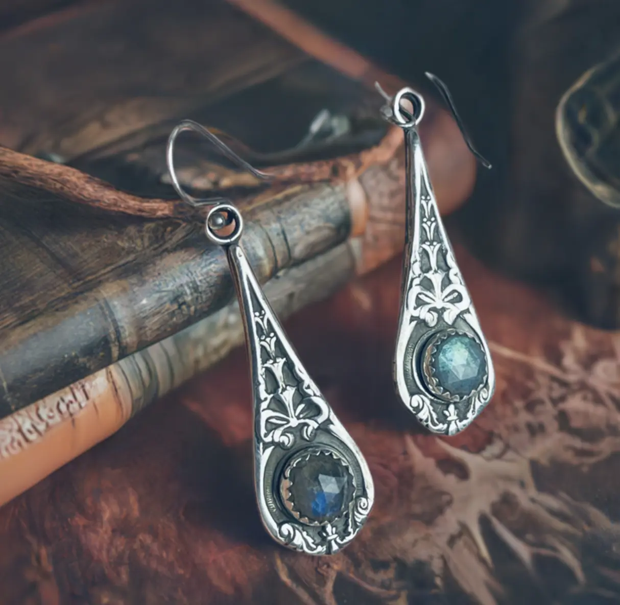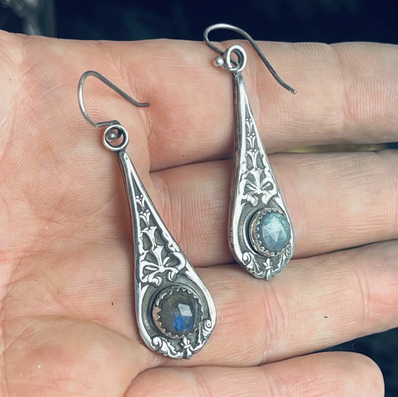 Loved To Death handmade sterling silver Victorian filigree and little bow earrings, sterling and labradorite. These intricately crafted earrings features a delicate filigree flowers and bow design, adorned with a bright blue green labradorite at its center, measuring approximately 1 1/4”inch long. Suspended from sterling silver earwires this unique accessory seamlessly blends elegance with a touch of the extraordinary. Elevate your style with these stunning Victorian earrings – a true embodiment of craftsmanship and artistry made using tools from long ago.