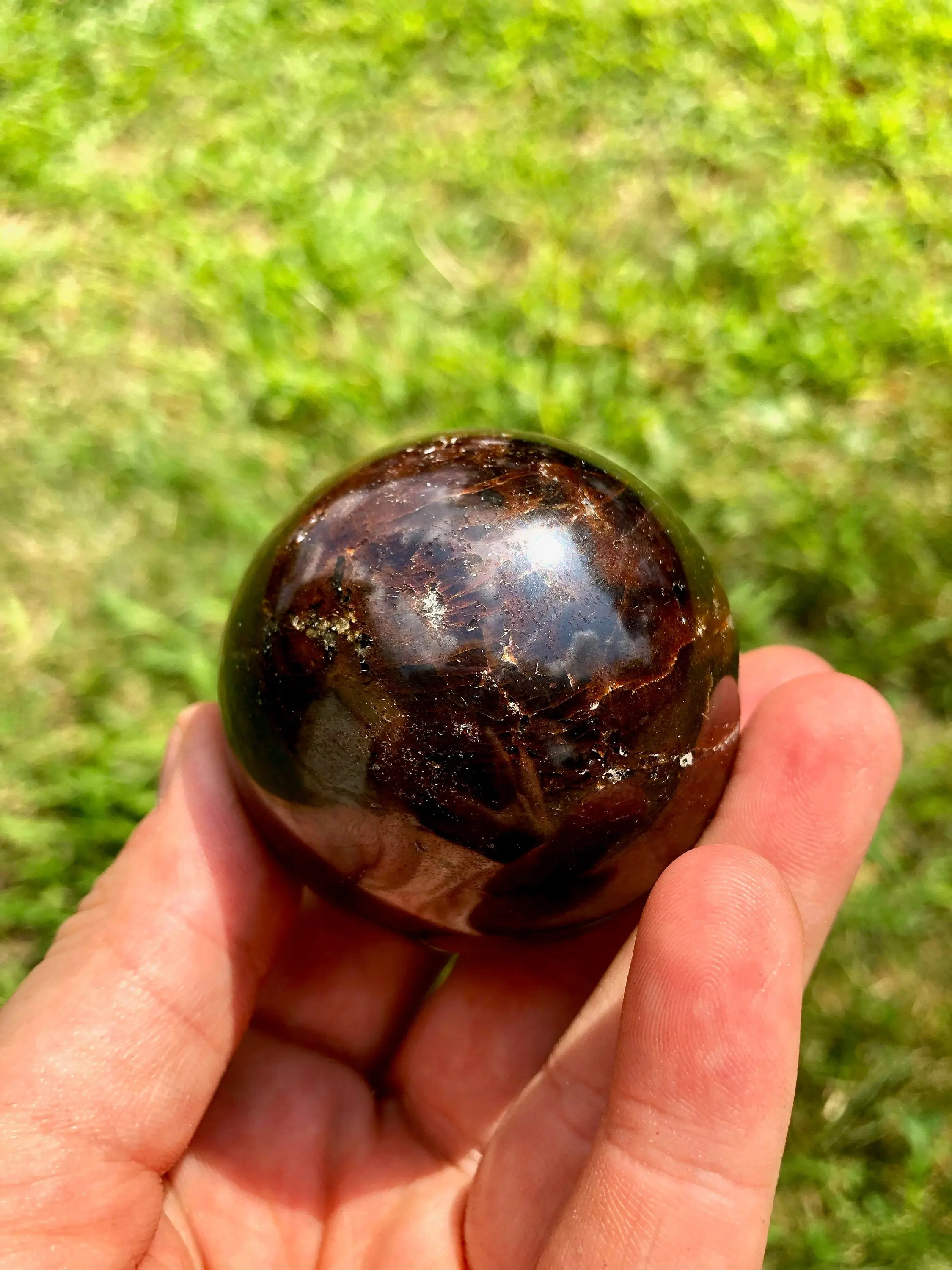 PRODUCT DETAILS: This listing is for a single Garnet Sphere - Polished Stone. Please note that these are stock photos of a few of the pieces that we have available. These are natural Crystals & Gemstones, so each stone will be unique and have variations in natural characteristics such as Size, Shape, Inclusions, and Color.