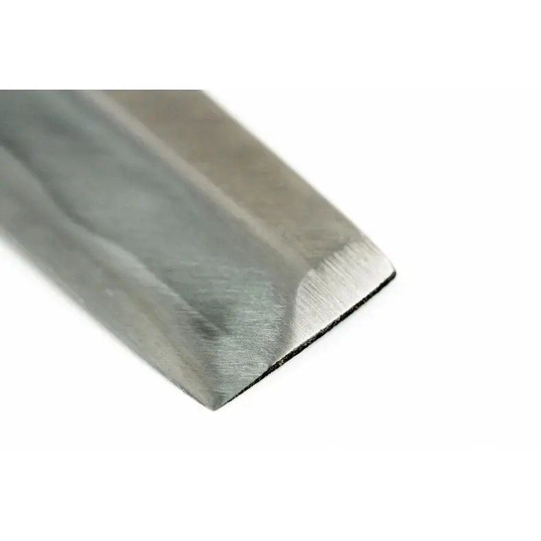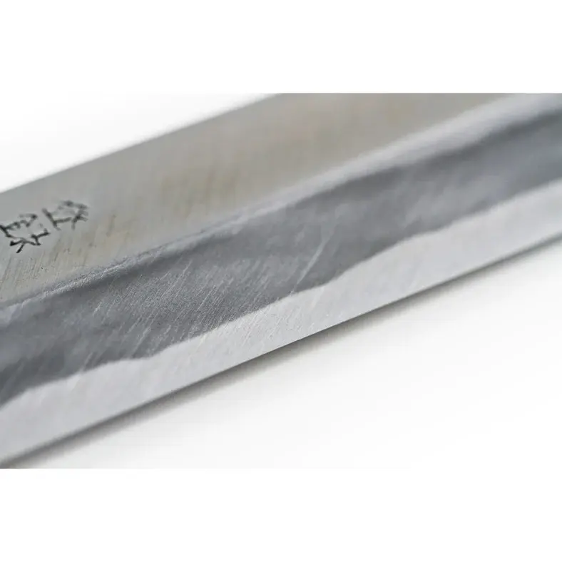 One unique feature of this knife is the deeper urasuki, or concave surface on the backside of the blade. This design maximizes its effect by facilitating clean food separation from the knife's edge - much like hollowed or perforated knives. Additionally, this urasuki allows for "uraoshi," which involves sharpening the backside of a single bevel knife to keep outer edges levelled.