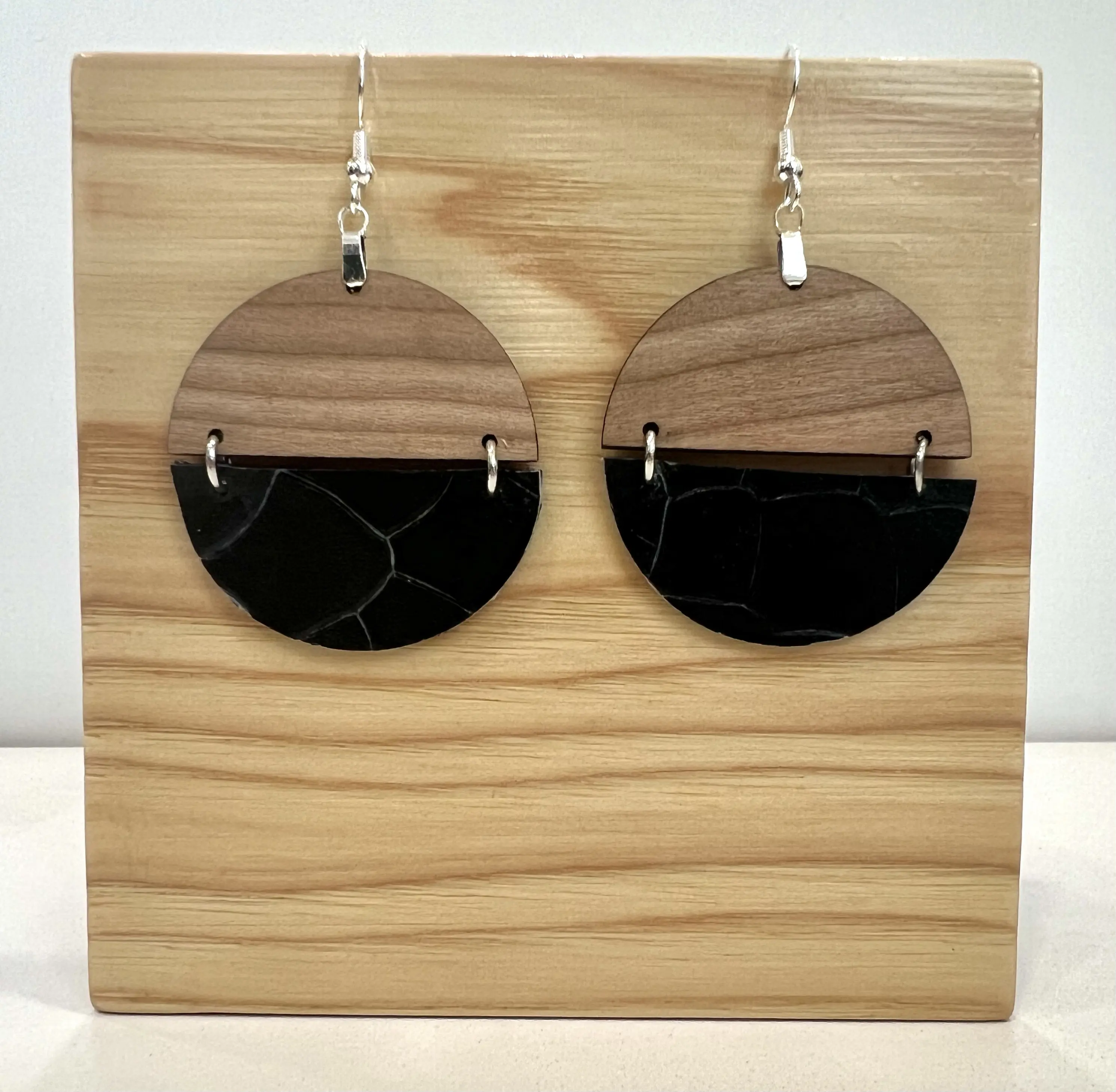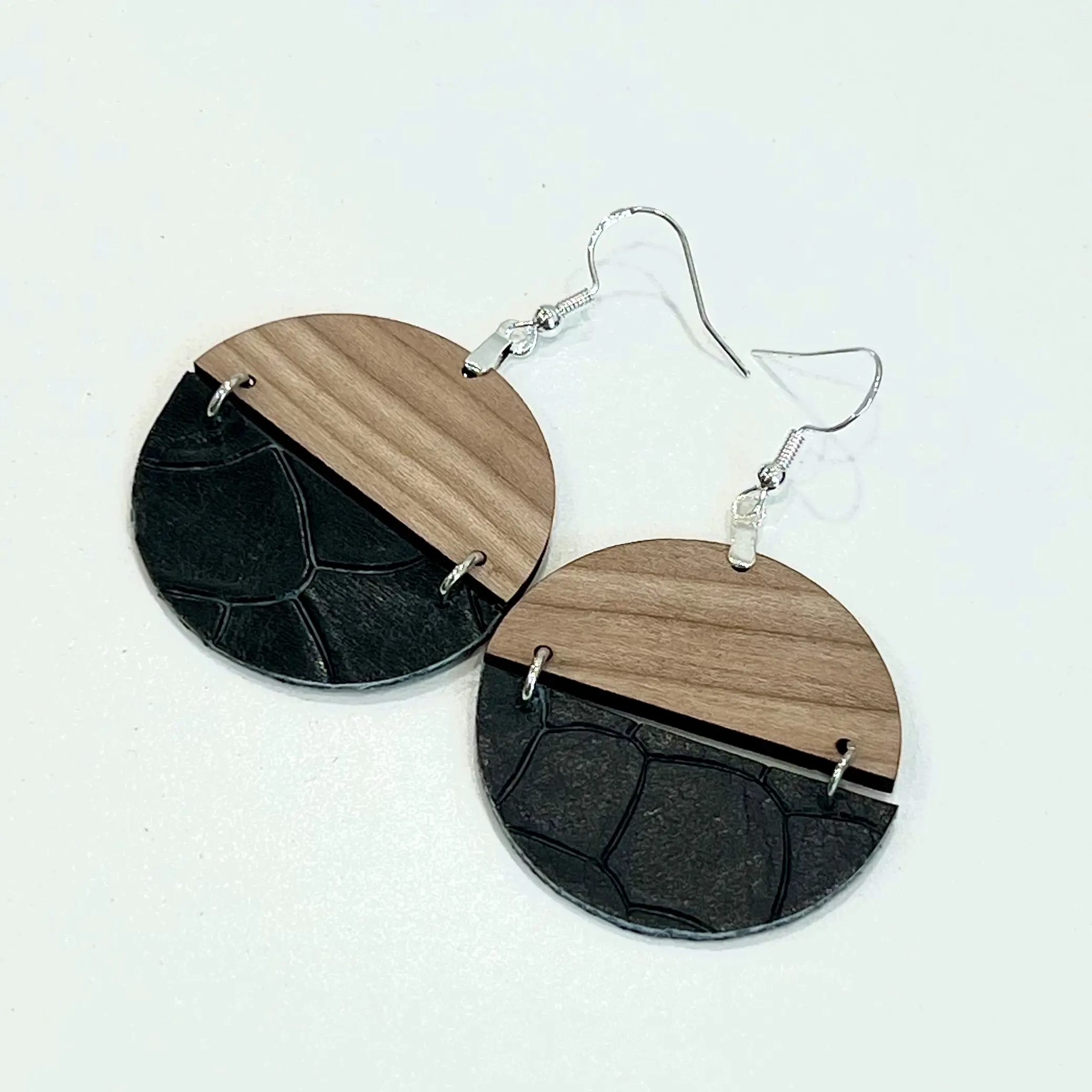 Measuring 1.25" (3.18cm) in diameter, these laser cut Cherry wood and dragon scale genuine leather earrings make a statement all their own, perfect for outfit and date night.