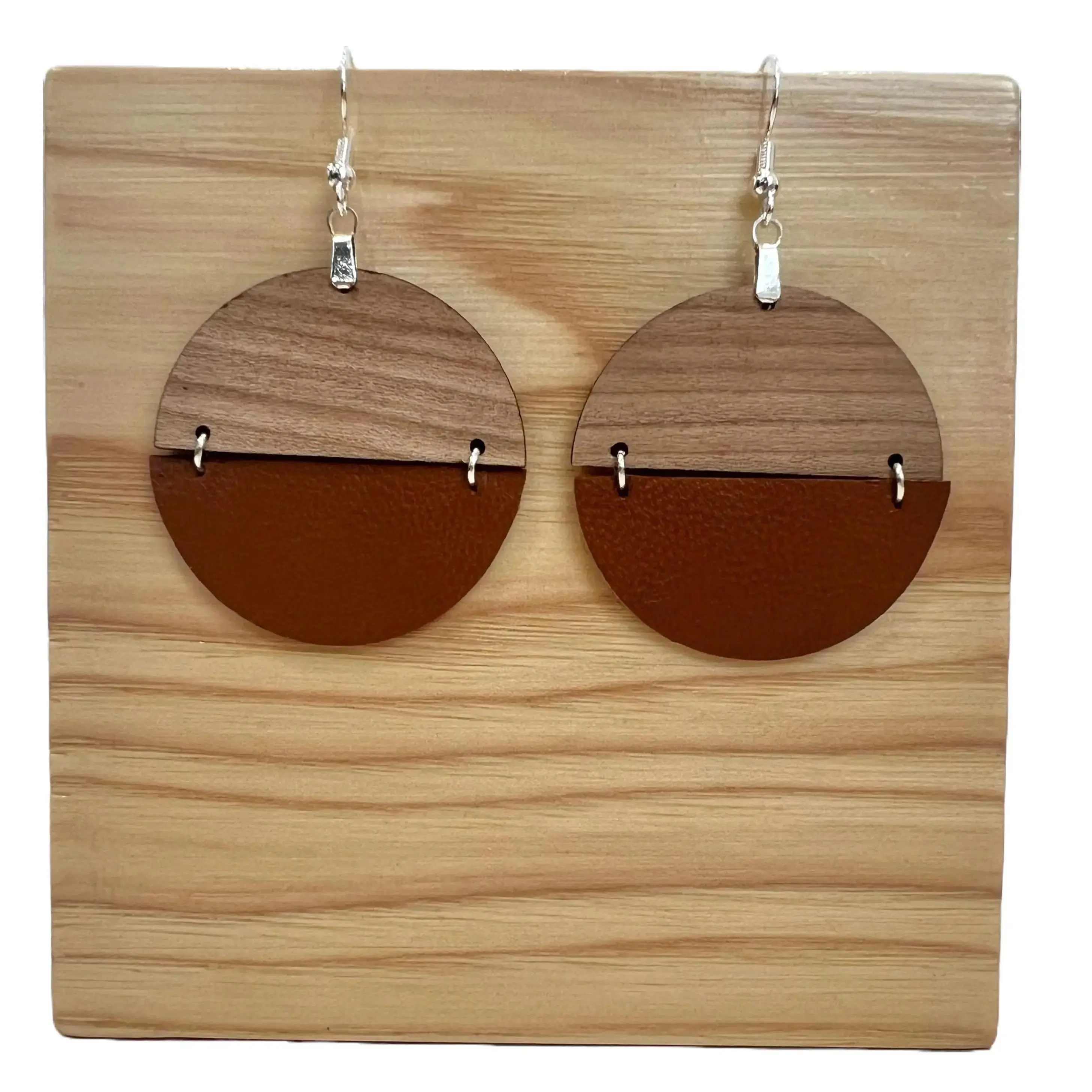Measuring 1.25" (3.18cm) in diameter, these laser cut Cherry wood and cognac genuine leather earrings make a statement all their own, perfect for any outfit or date night.