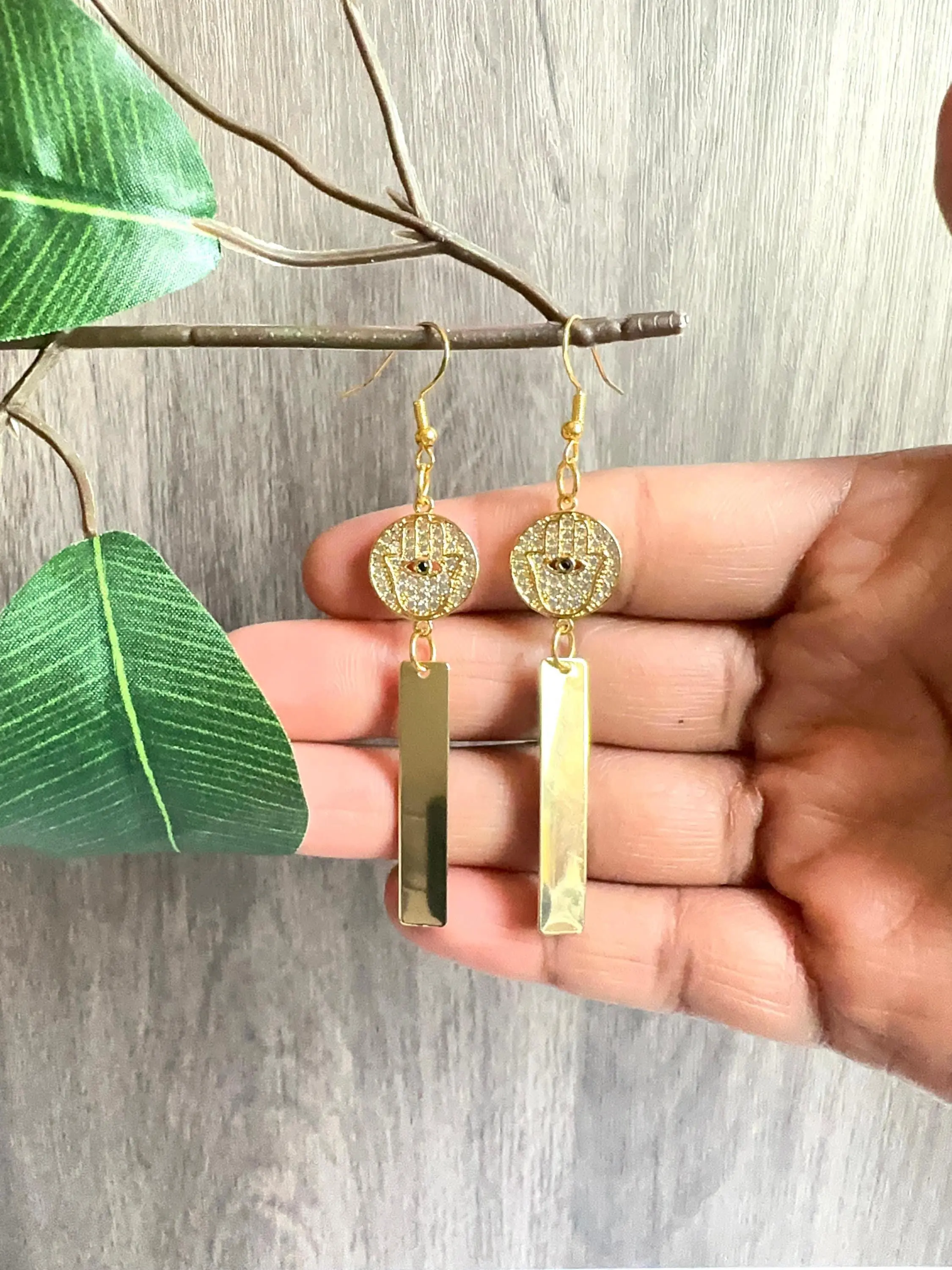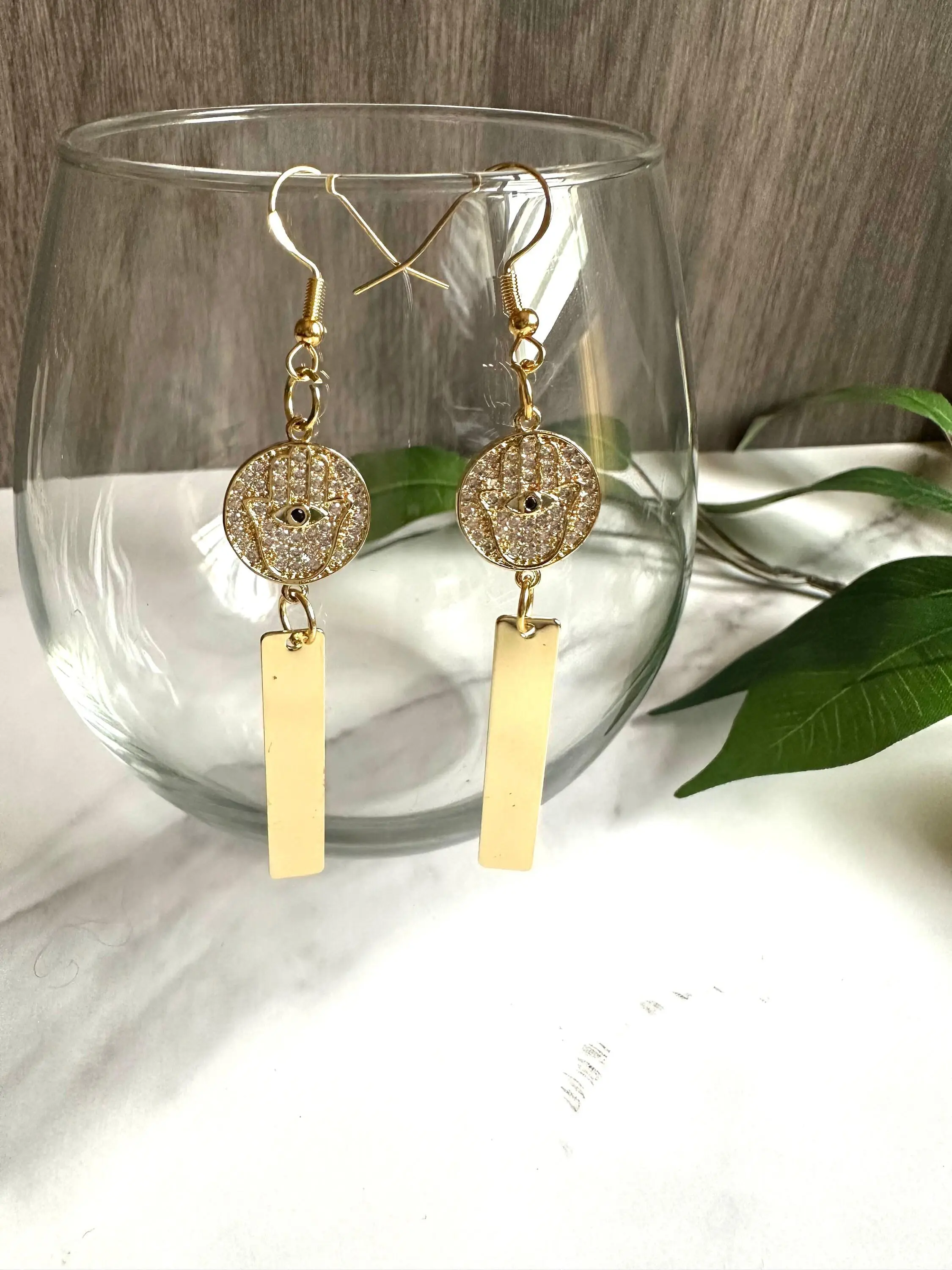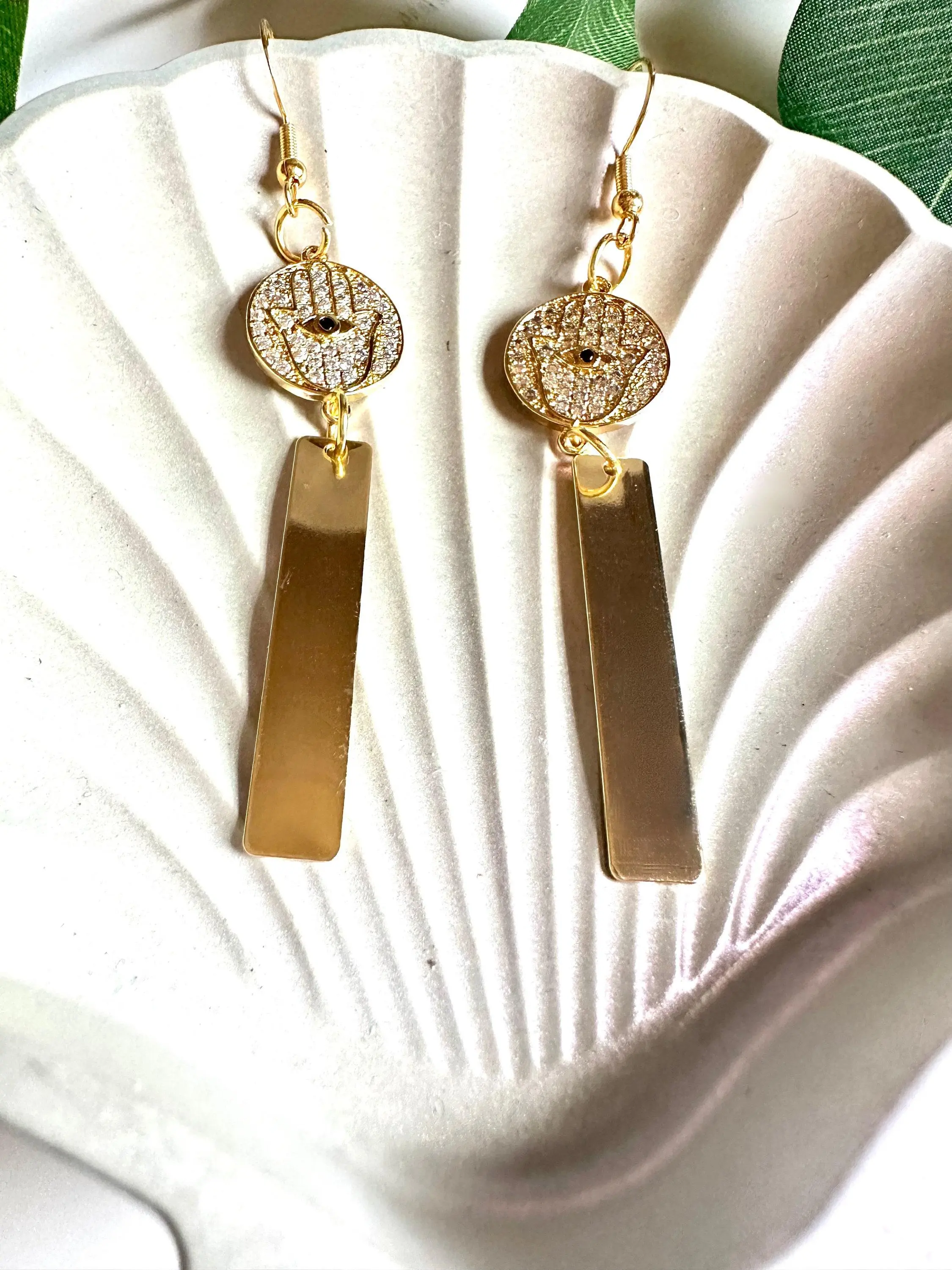 Gold Buddhist Hamsa Hand Earrings with Crystals, Buddha Jewelry, Spiritual Gift, Gold Bar Attachment