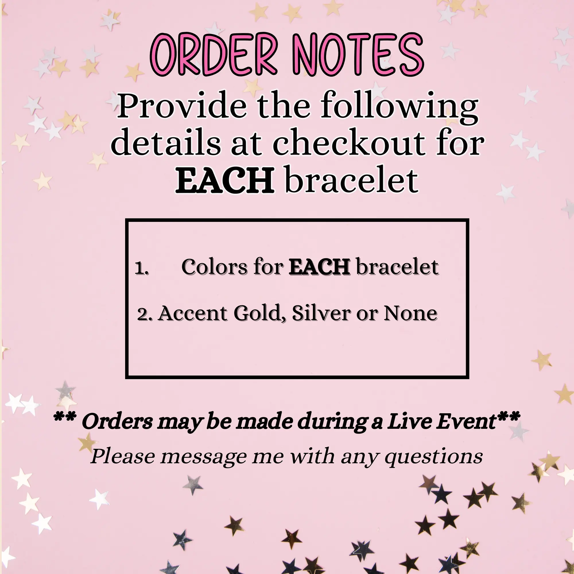 Must provide the following details for EACH bracelet in the Order Notes section during check out: Color(s) of Each bracelet with desired pattern if more than 1 color and if you would like an accent of either gold, silver or none.