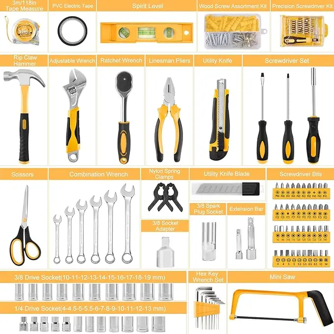 ·[Complete Variety] The 257 PCs basic tool kit contains: Wrench Set, Metric Socket Set, Screwdriver Set, Screw Kit, Measuring Tools etc. Perfect for Handyman, Repairman, Construction Worker, Mechanic, Car Repairman, Houseowner. The home tool kit is also a good choice for family, friends and partners.