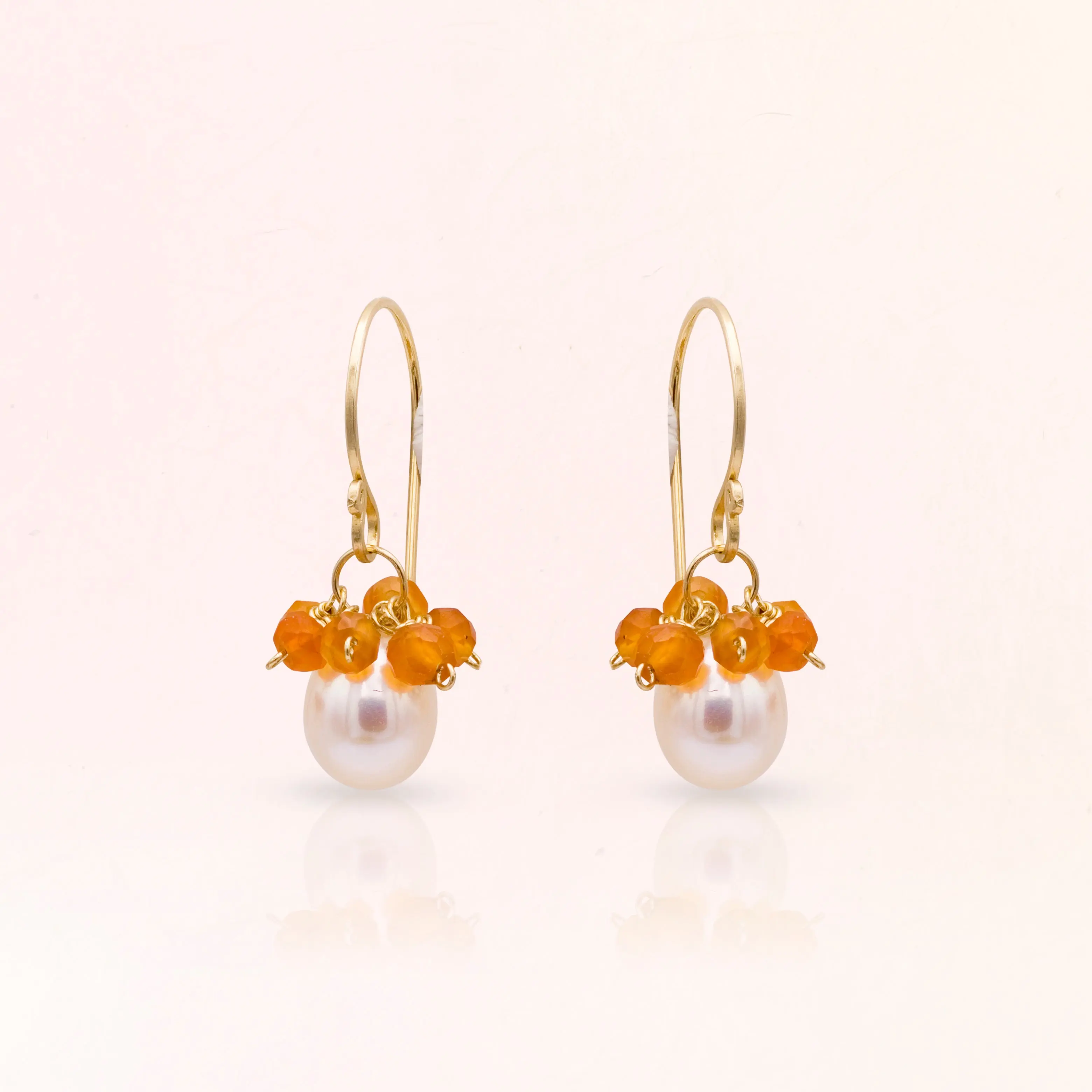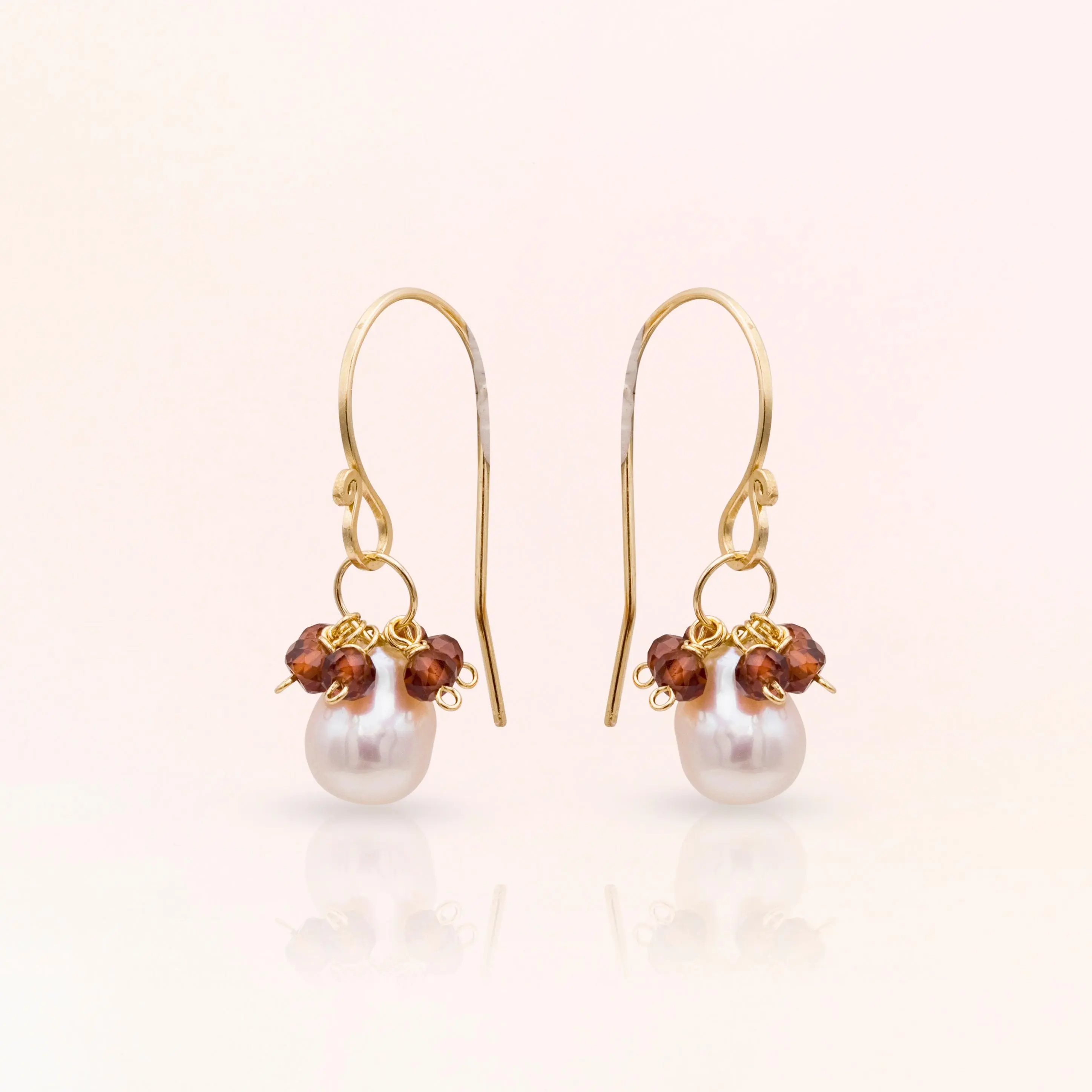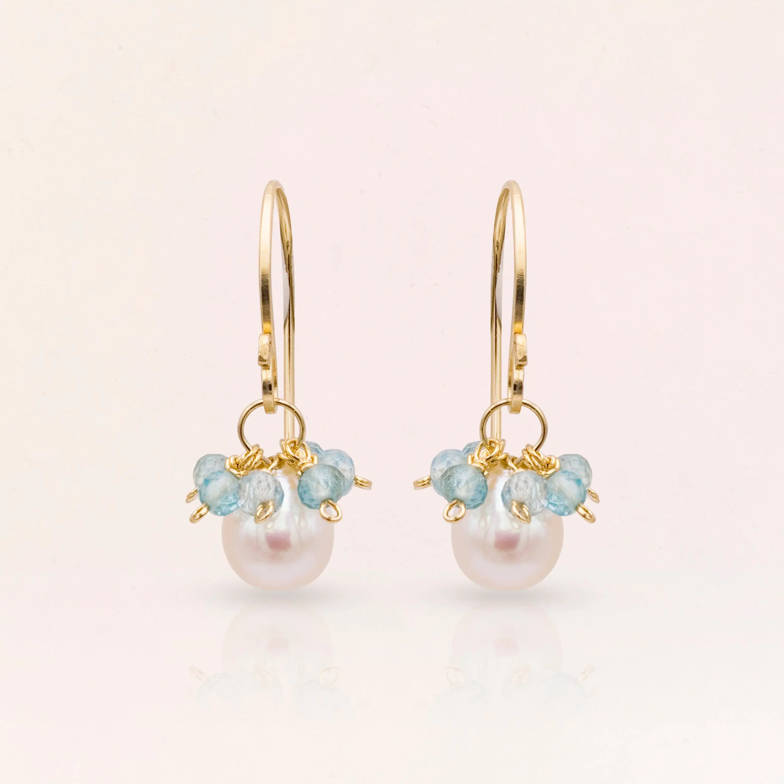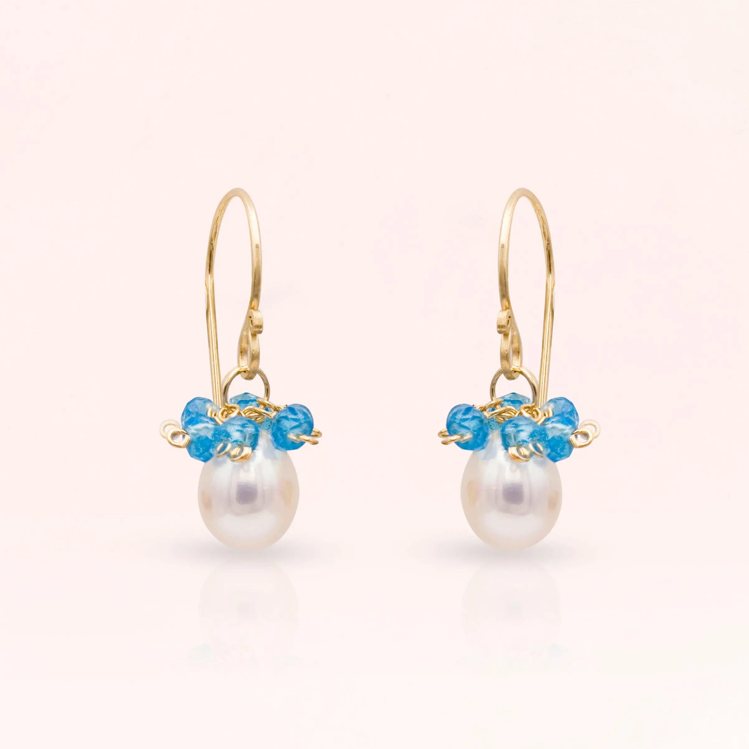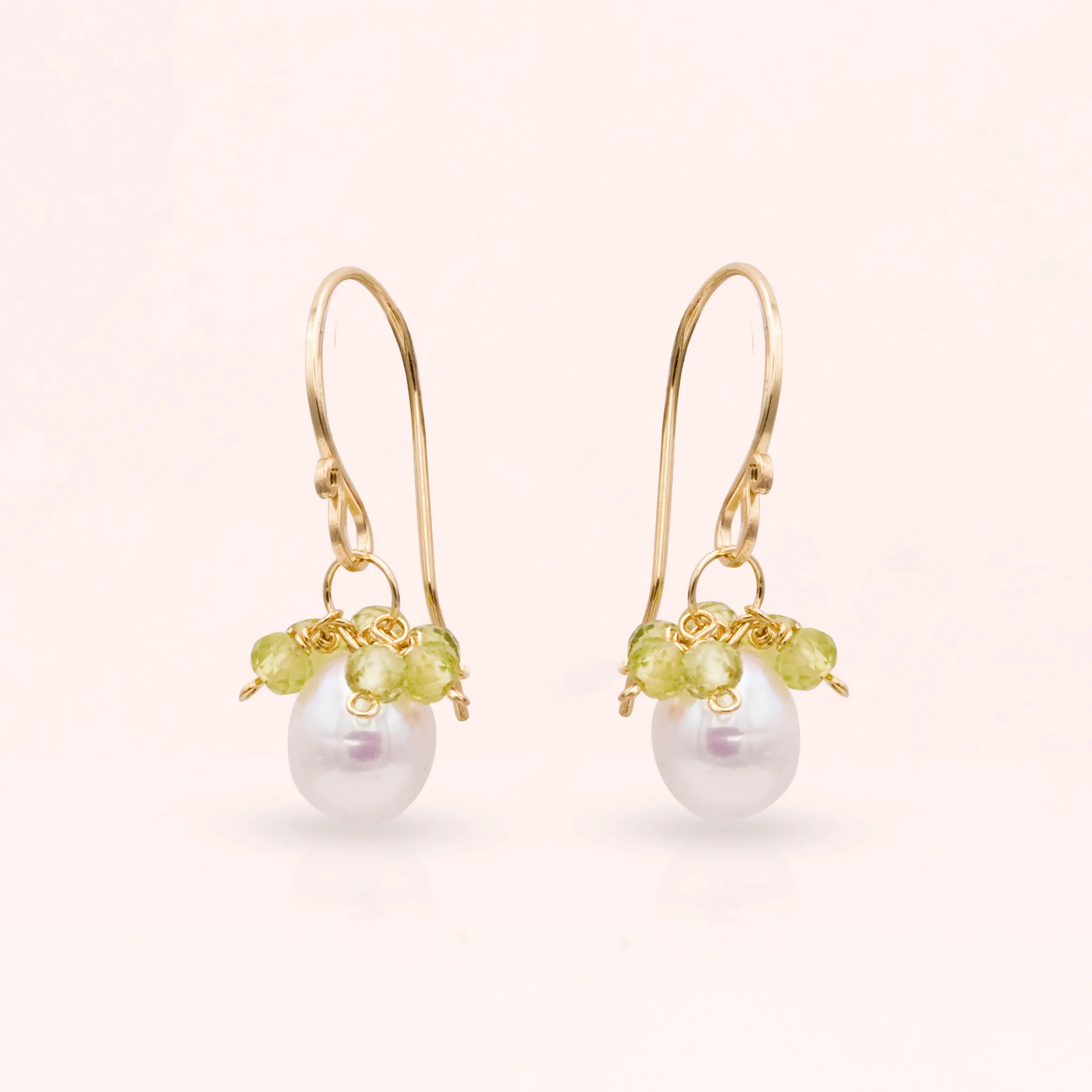Pearls from South China with the unique green luster are complimented by high quality crystal clusters. Held together by 14k gold fill wire and chain. Perfect for those that love dainty jewelry, it makes a great addition to the pearl jewelry collection. 1.2 inches long.