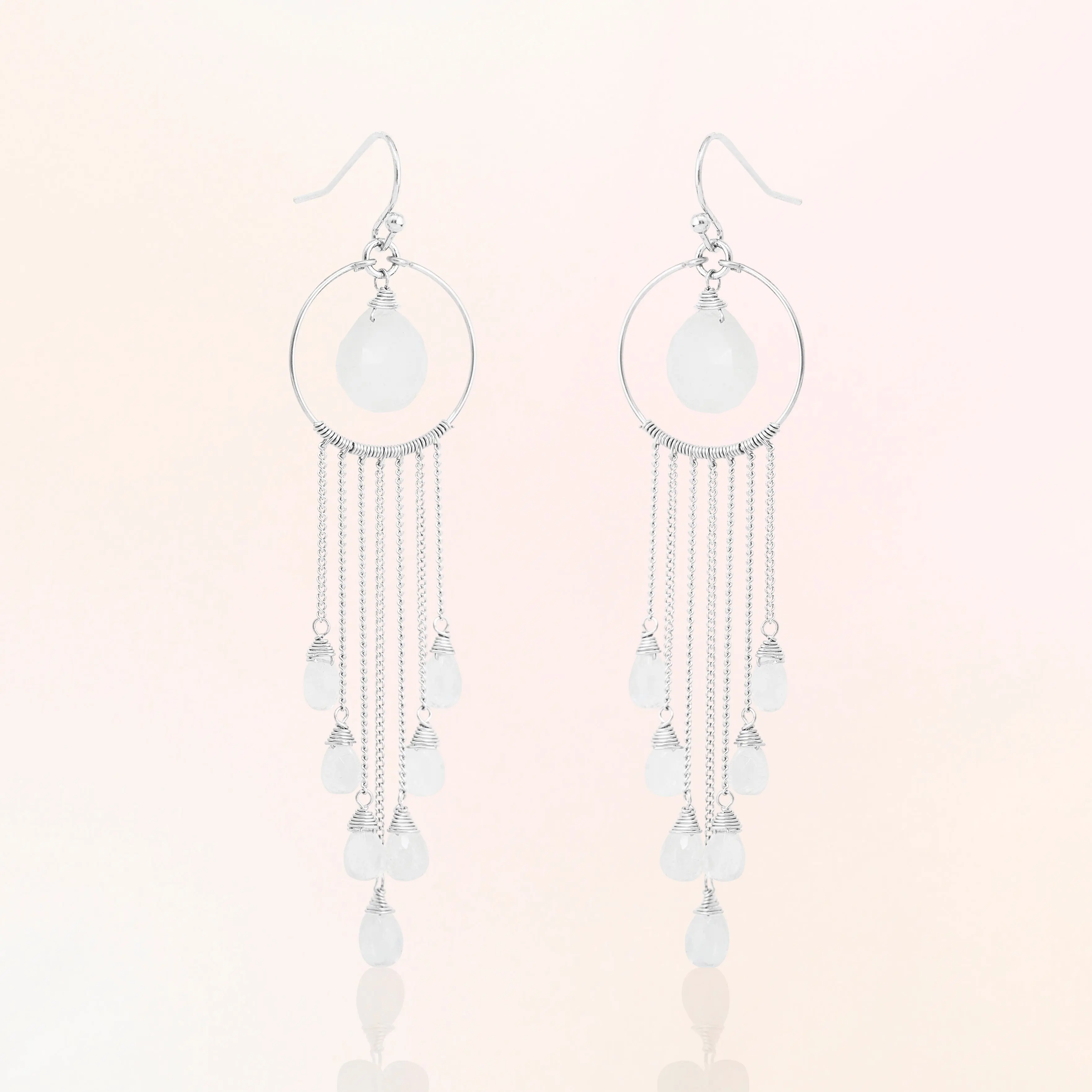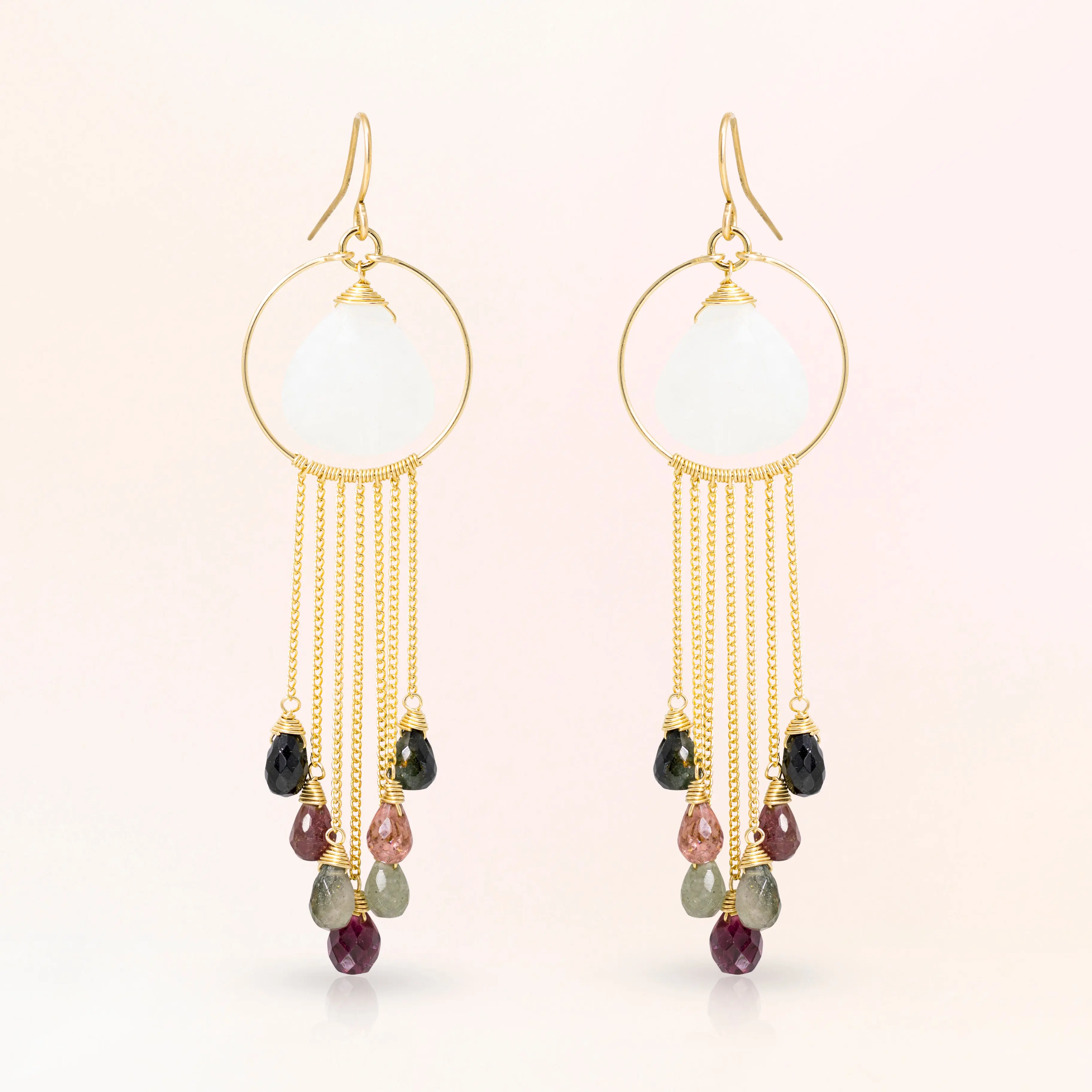 Design includes moonstone among 14-karat gold filled chain and wire, holding a cluster of tourmaline. Inspired by the dreamcatcher, this piece is a great discussion piece and can be worn with hair down or up. Sometimes the differences found in natural stones may result in color not being exactly the same as it appears in the photo.