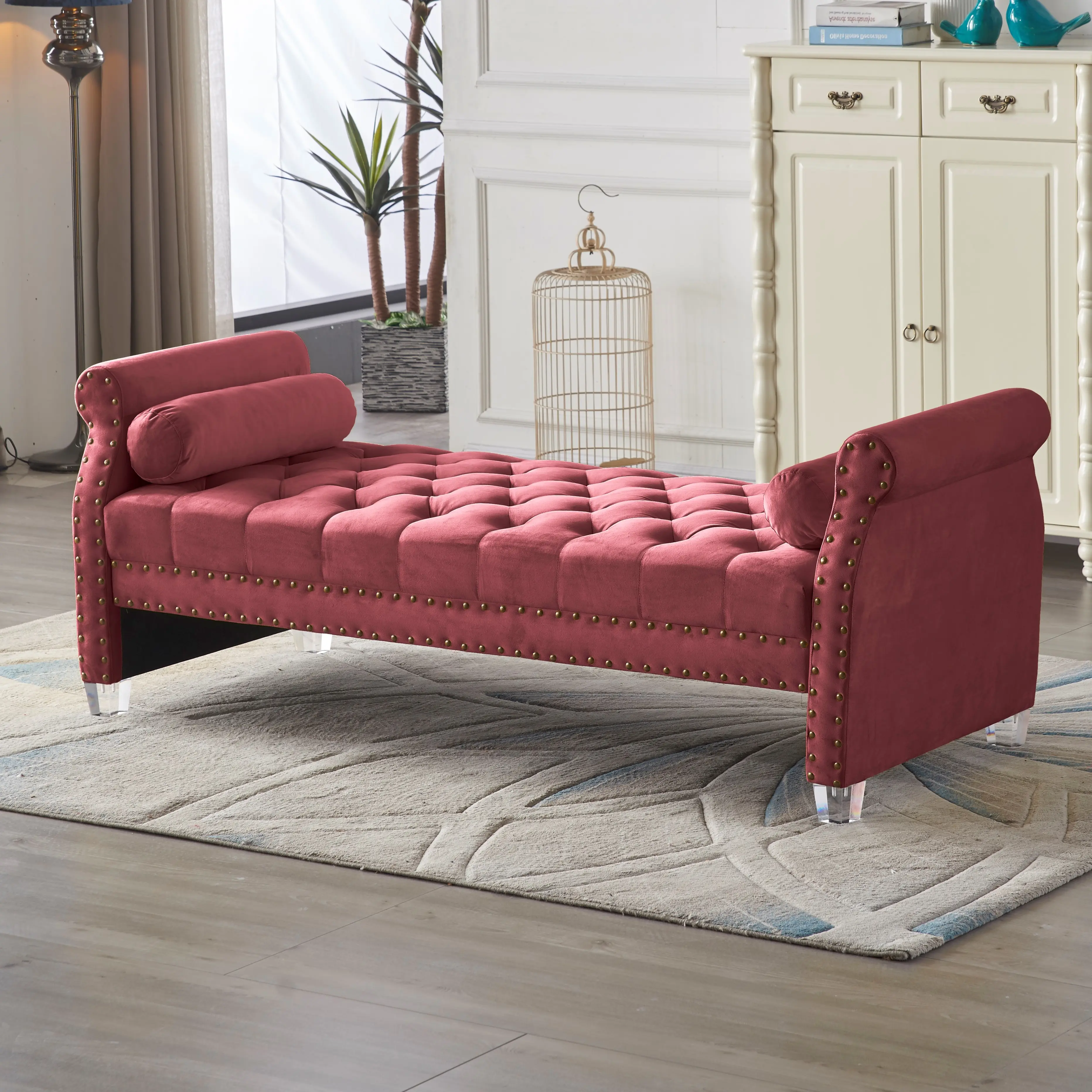 Premium 70in Velvet Tufted Upholstered Bed Bench, Rolled Arm Deep Seat Chaise Lounge with Nail Head Trim, End of Bed Long Ottoman Couch for Window and Bedroom