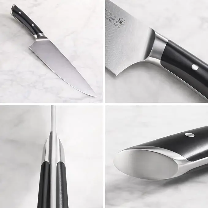 Our semi-bolster design provides a lightweight feel for chopping, slicing, and dicing while still maintaining its strength.