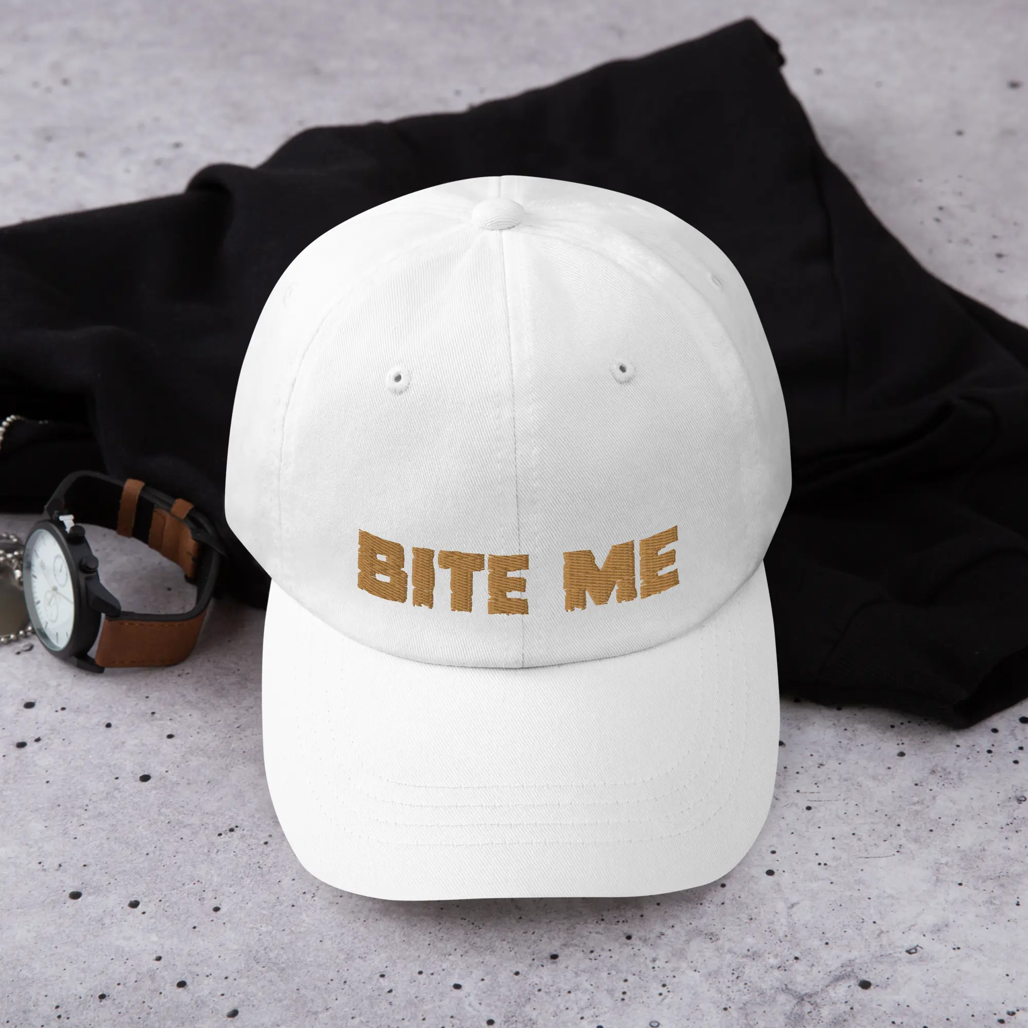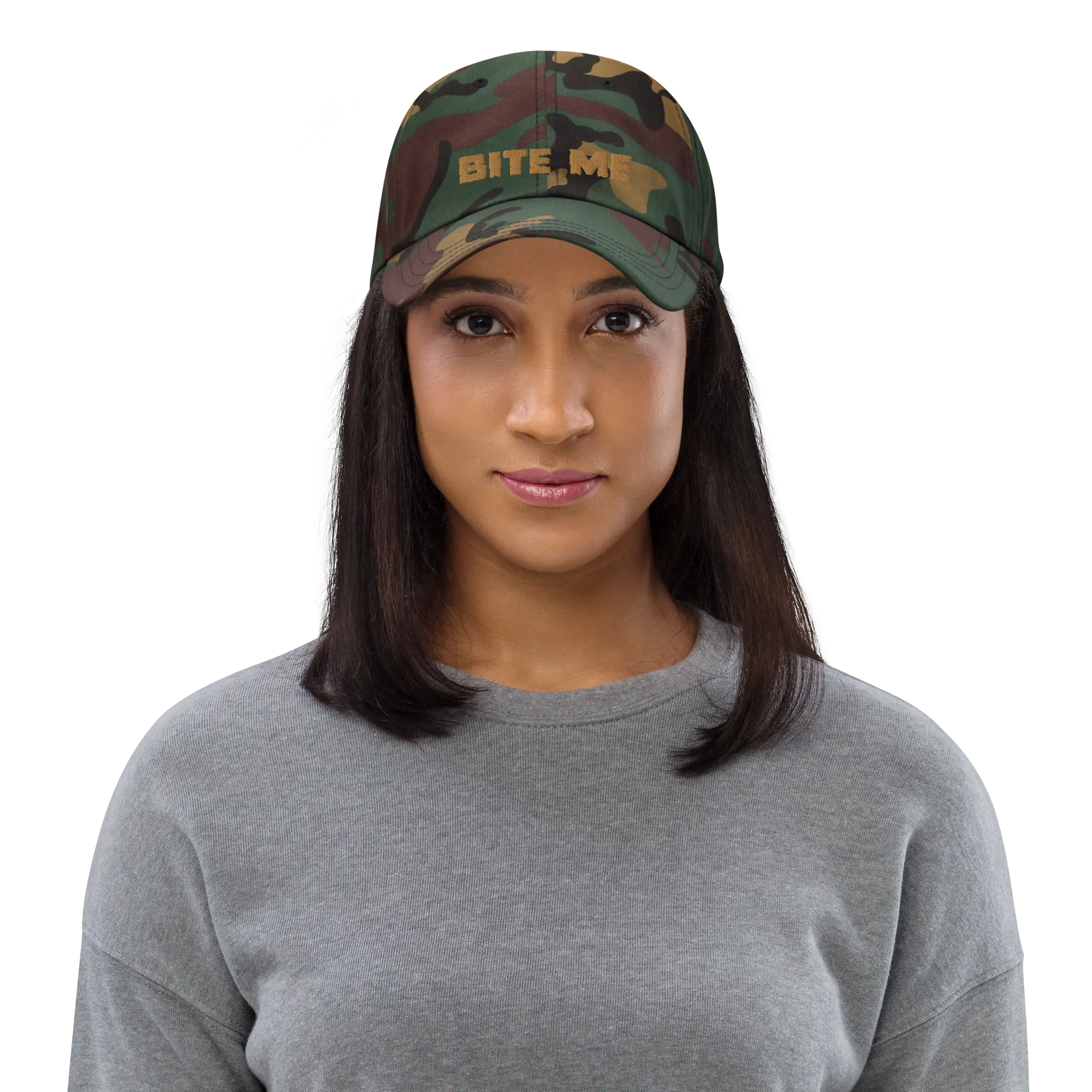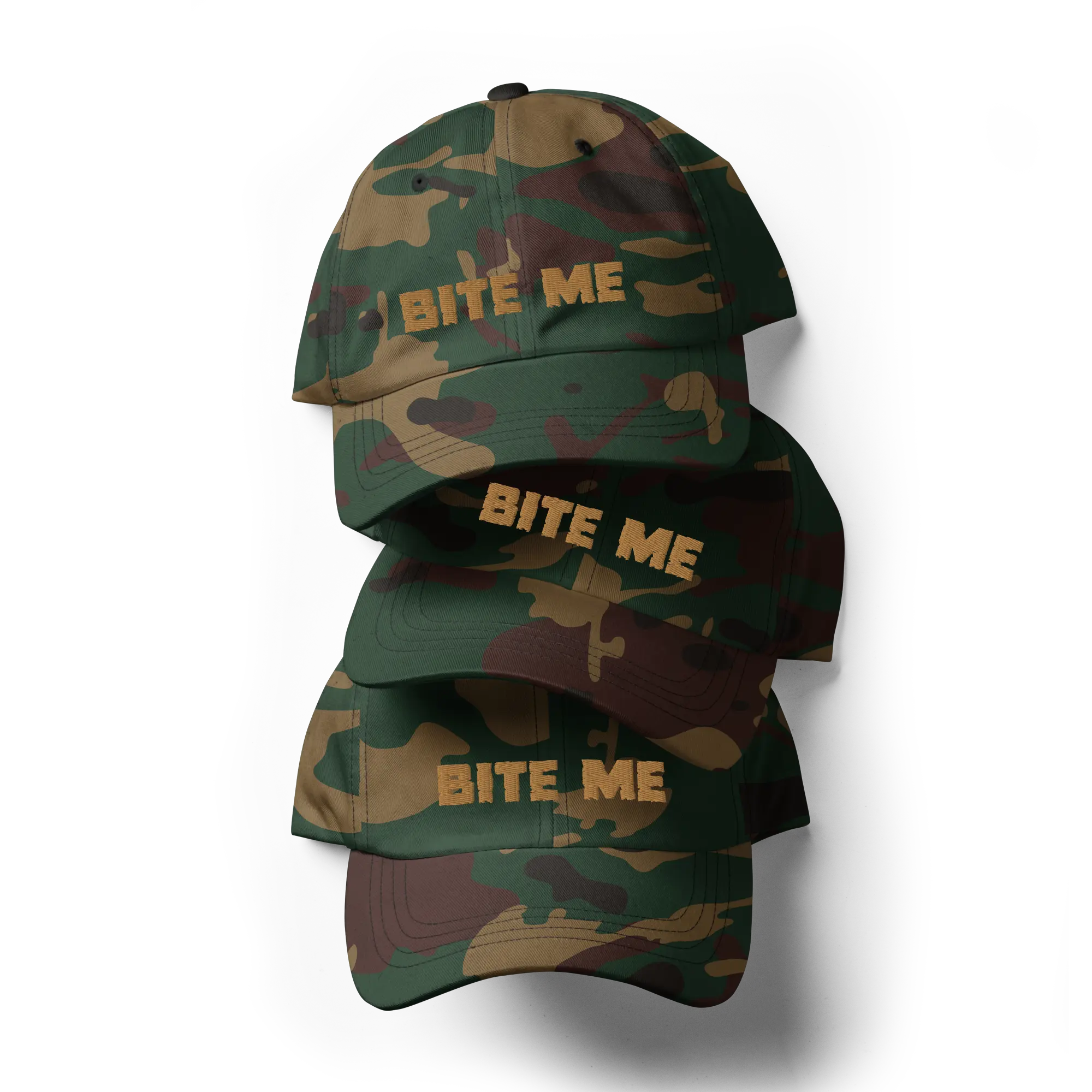 Bite Me Dad Hat - Camo, Black, or White & Gold with Adjustable Strap and Curved Visor