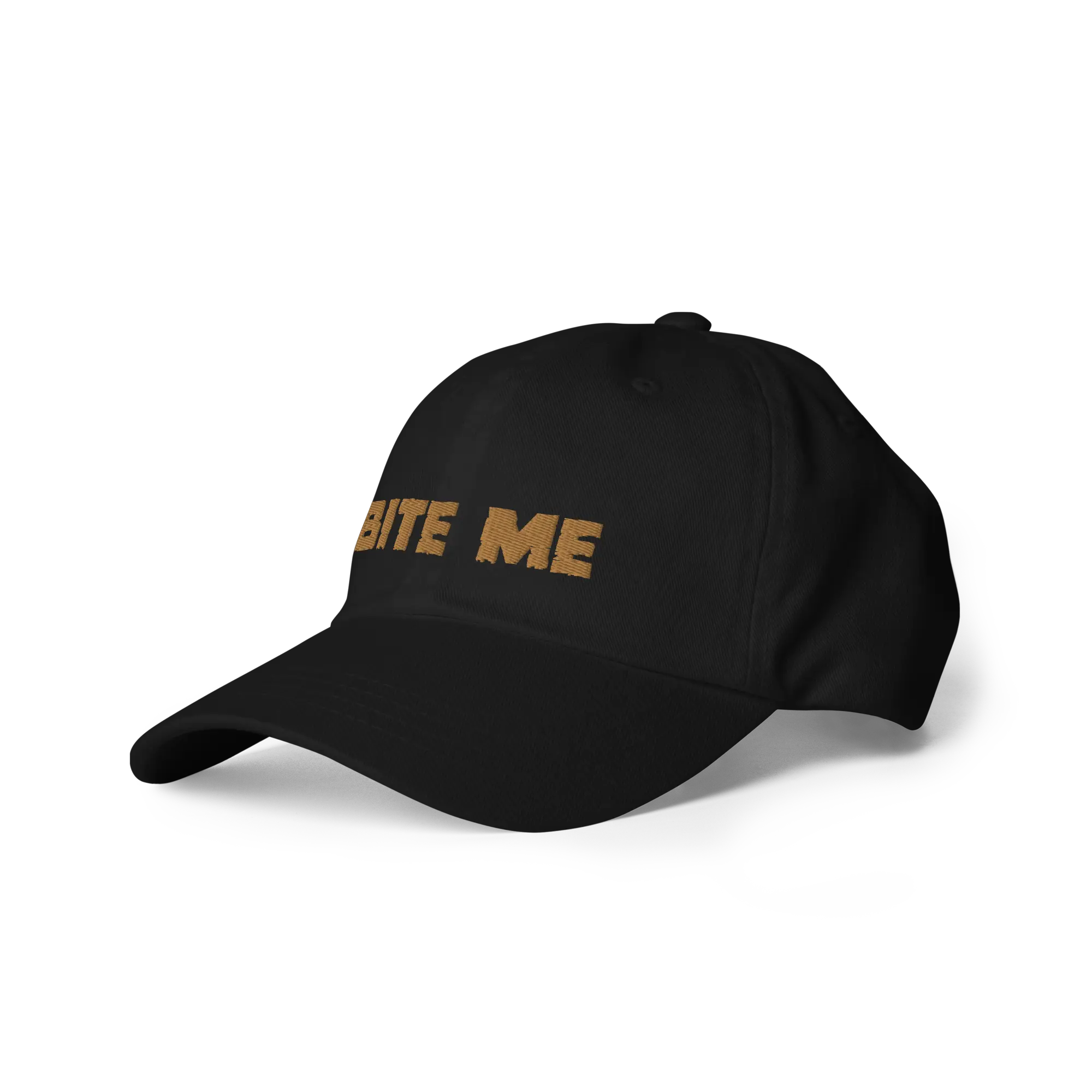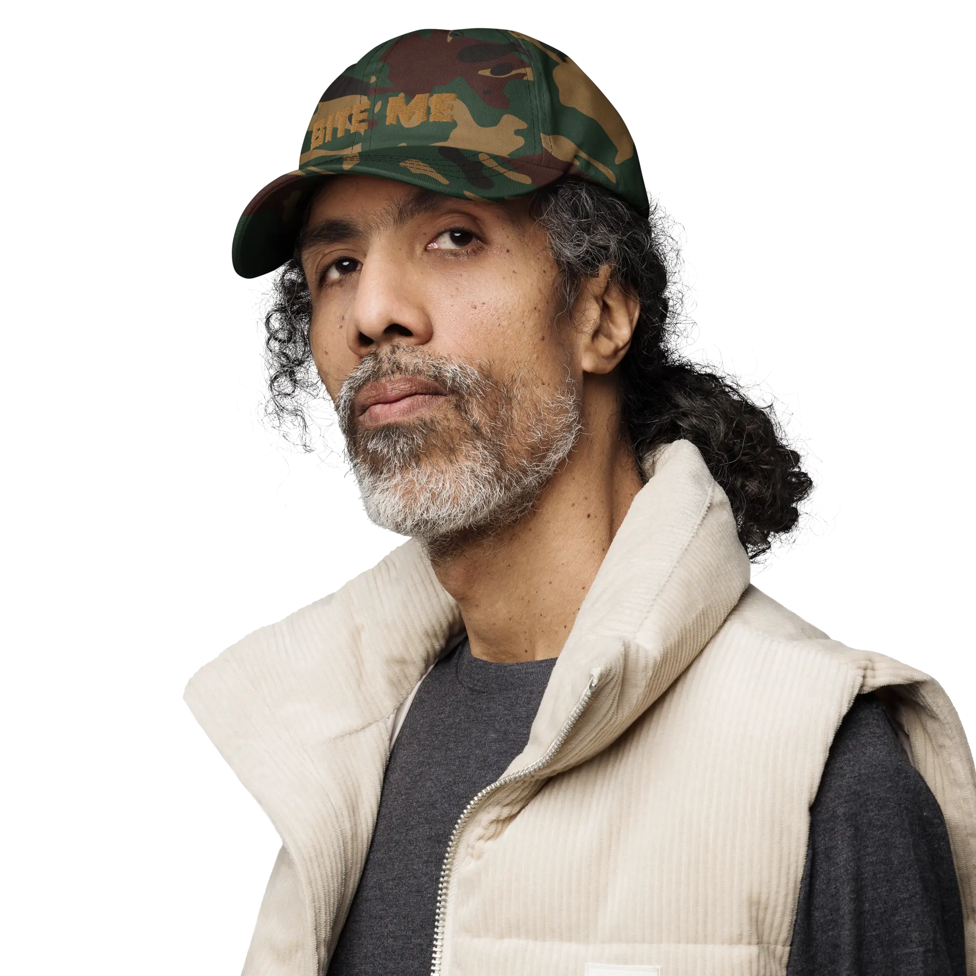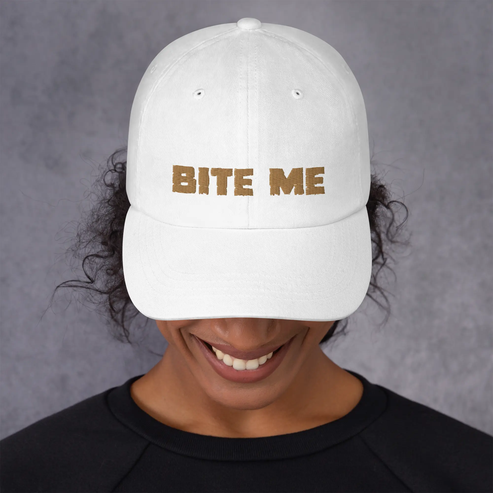 Bite Me Dad Hat - Camo, Black, or White & Gold with Adjustable Strap and Curved Visor