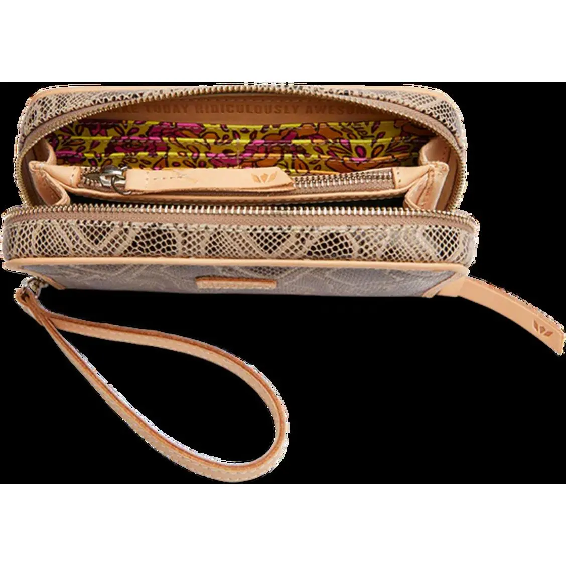 Dazzle and amaze with the Consuela Wristlet Wallet in a unique brown snakeskin pattern. Keep all your essentials close at hand in this playful and practical accessory. No need to take yourself too seriously with this Dizzy design.