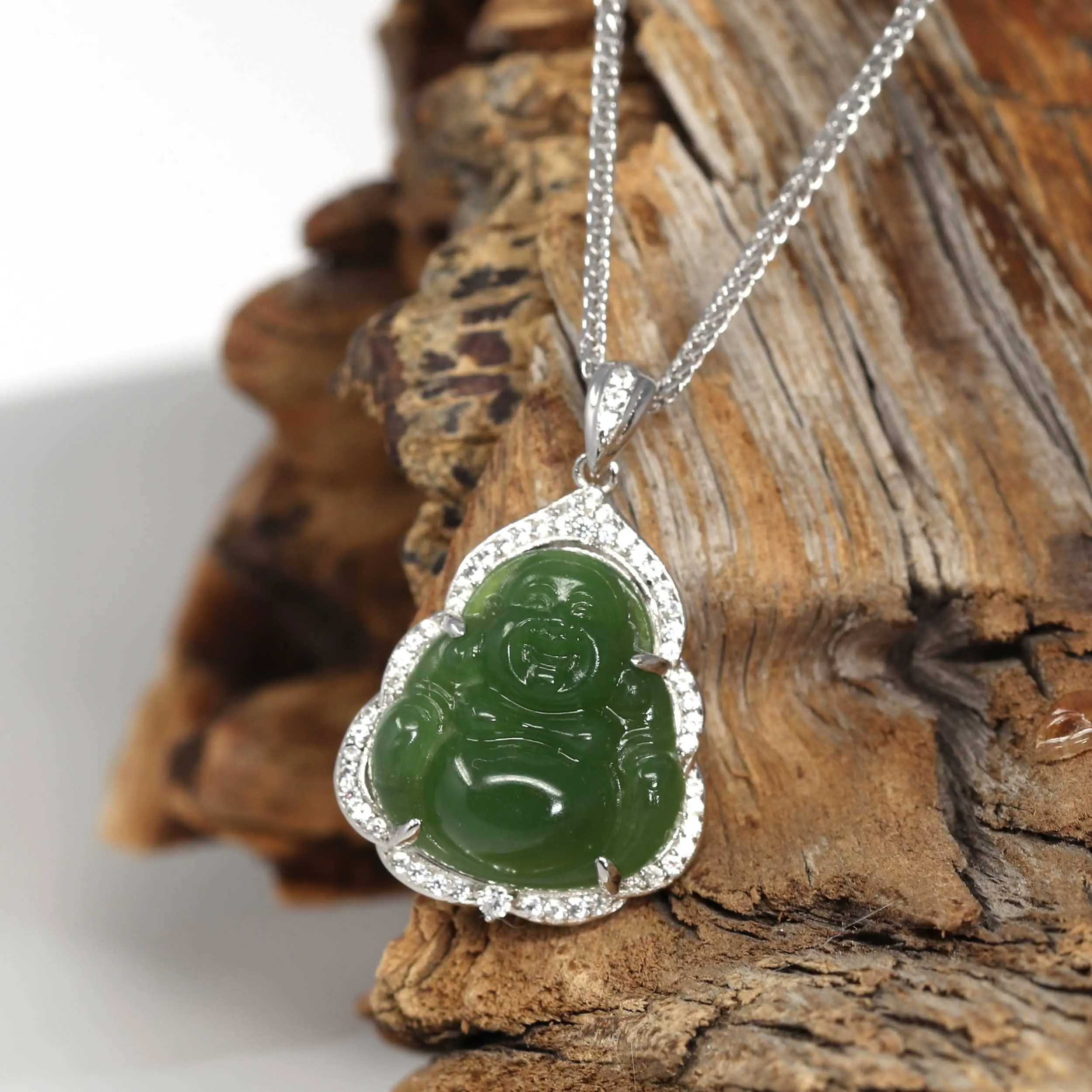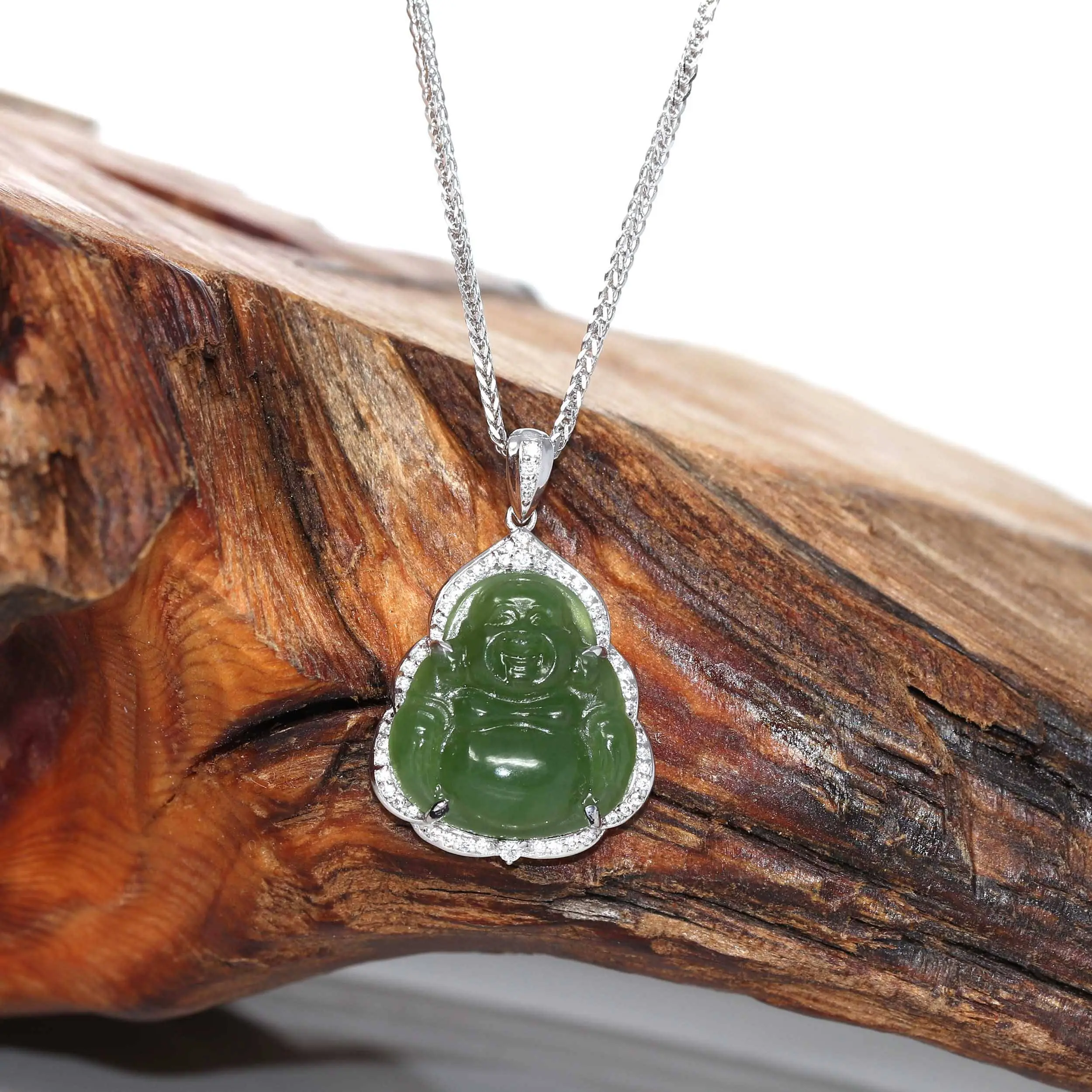 RealJade Co. Natural Green Nephrite Jade Buddha Necklace In Sterling Silver With Moissanites Auspicious