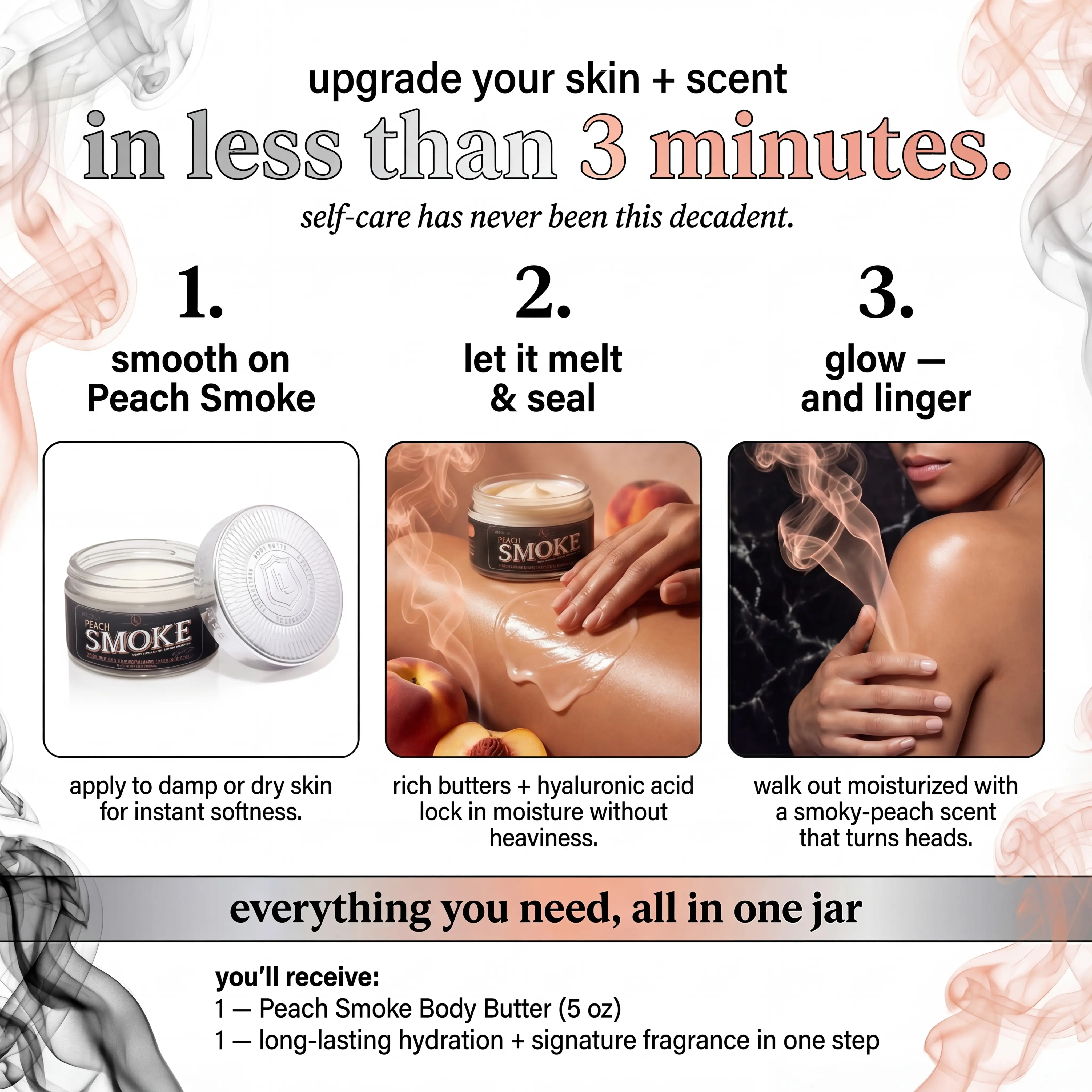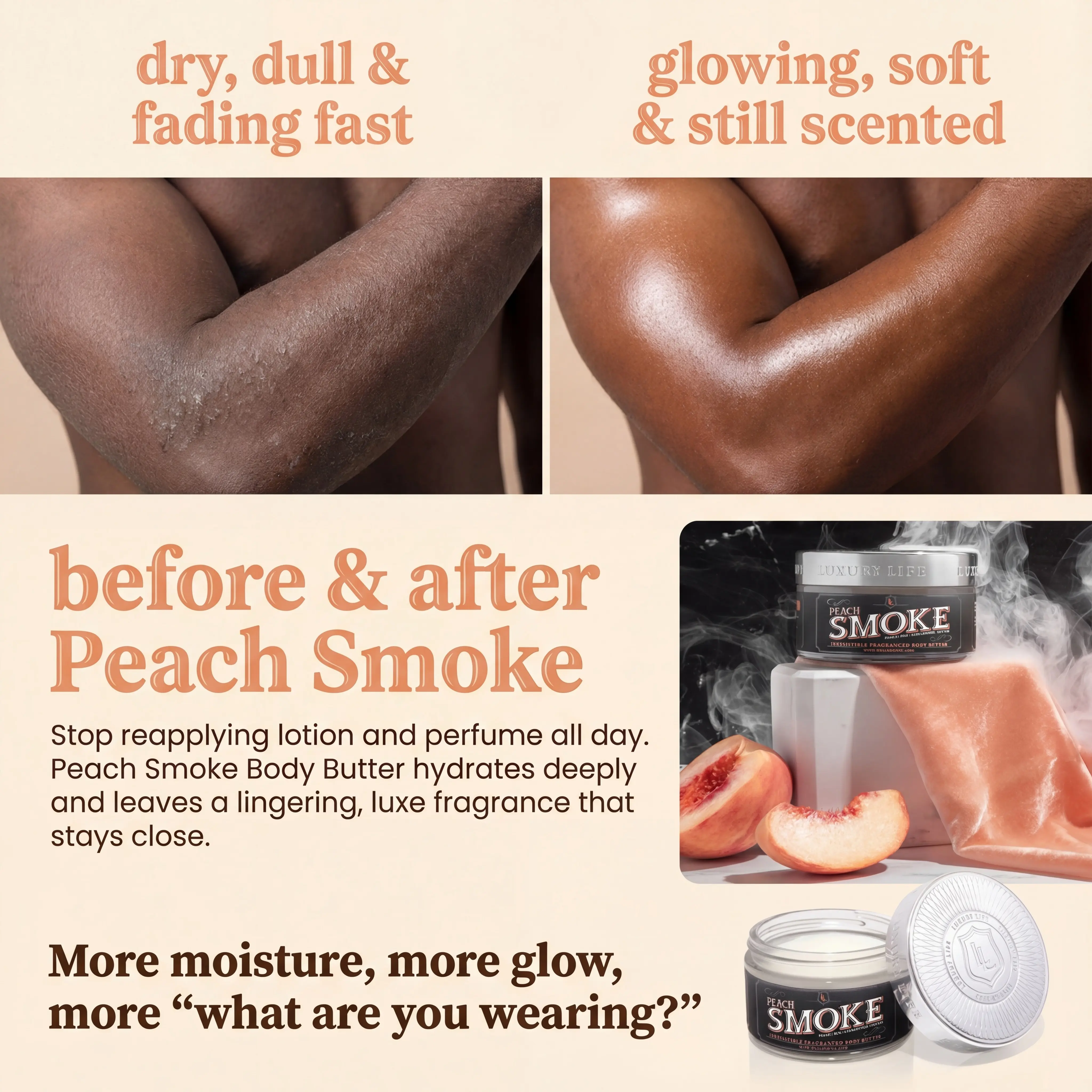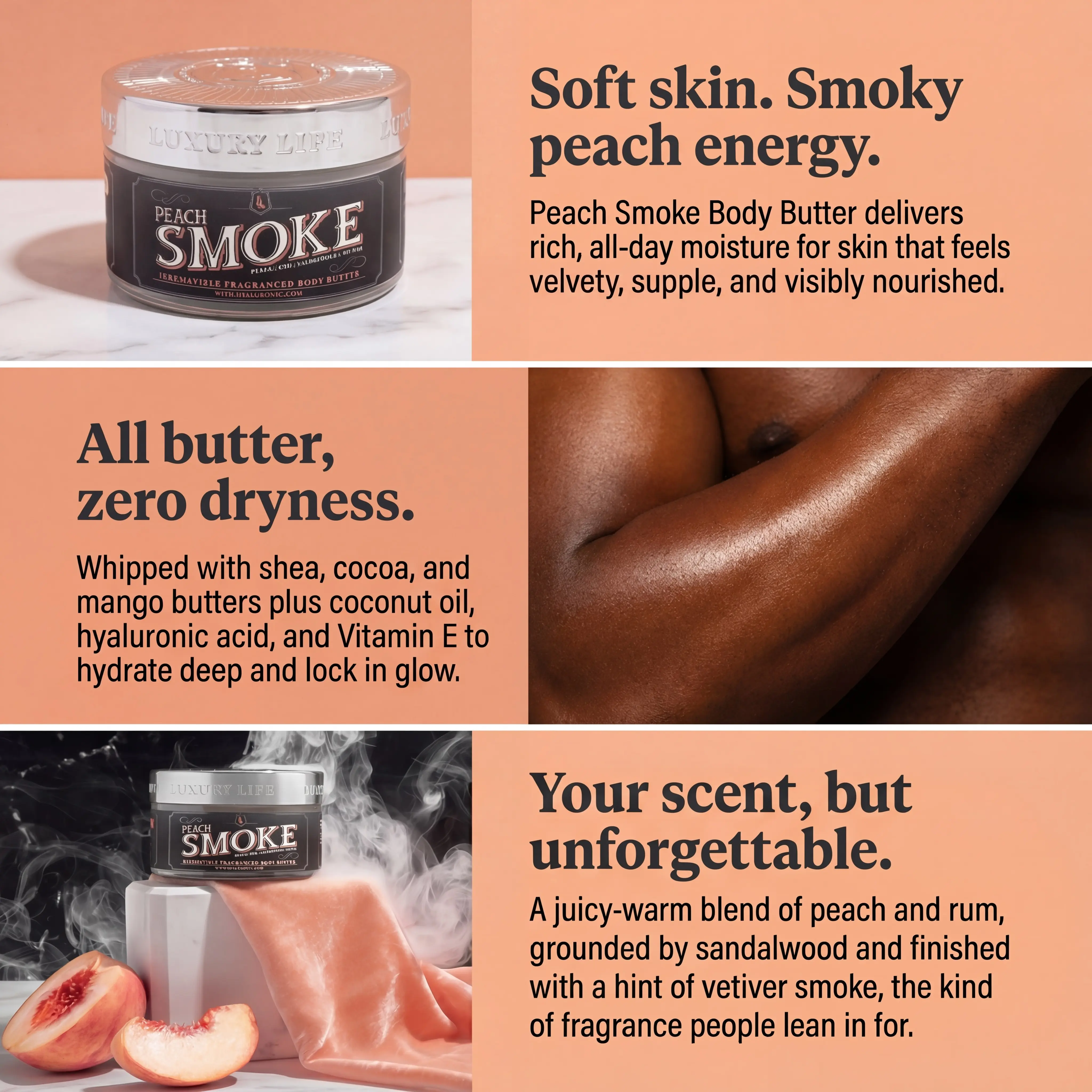 Everytime I put on Peach Smoke, the compliments and head turns rolls in, it always grabs attention. I like to layer it with one of my fav colognes for that extra kick… double trouble every time. A must-have in the rotation! Also, by the way; I just order the signature trio, I need them all now!