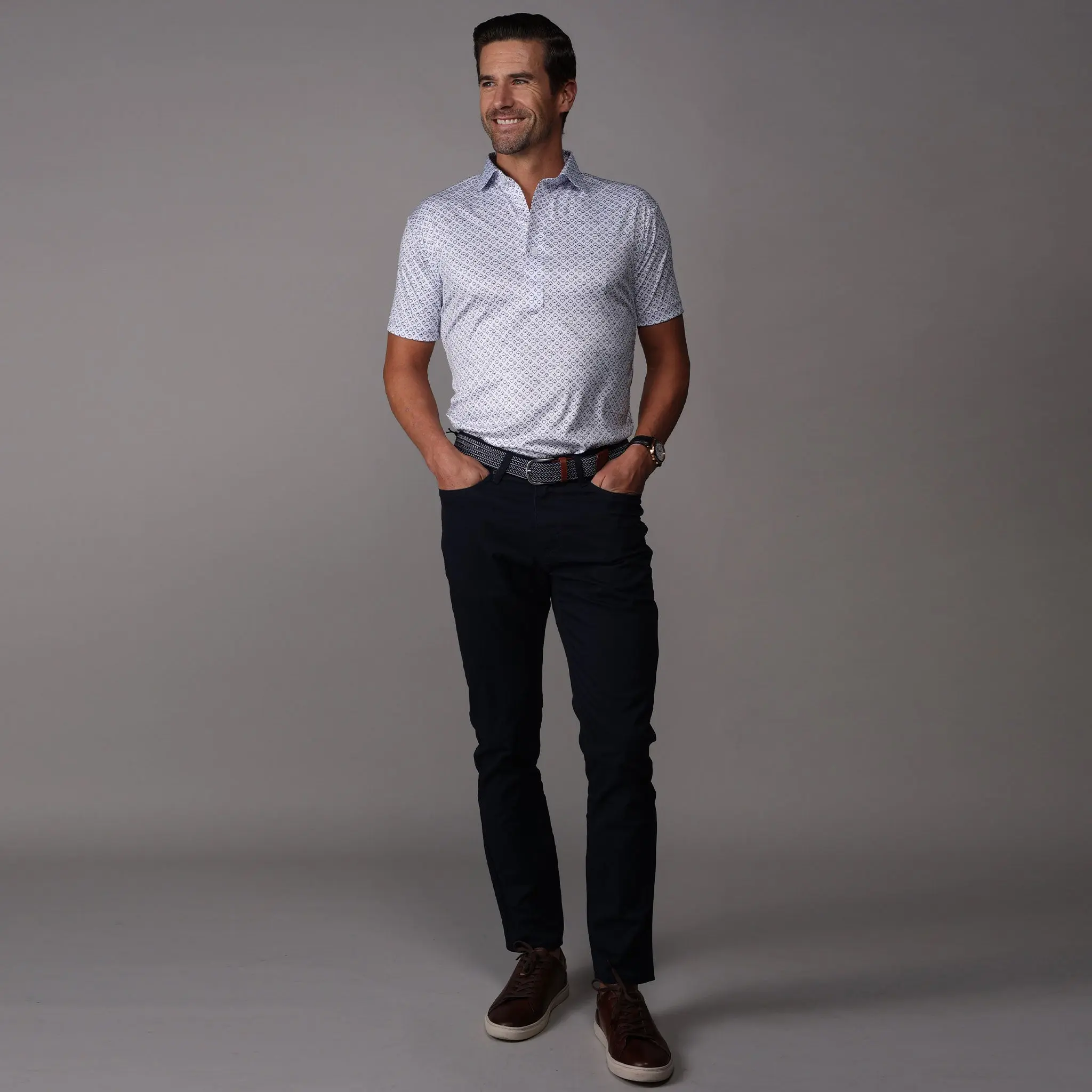 The versatile Semi-Spread Collar Polo. Woven for comfort and designed for style. This shirt pairs a formal semi spread dress collar with an extra comfortable, 4-way stretch, short-sleeved polo. The semi-spread collar has all the benefits of our ever popular English spread collar with a streamlined size and built to accommodate a larger tie knot