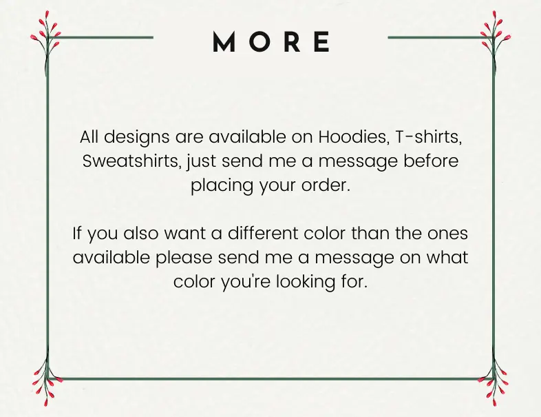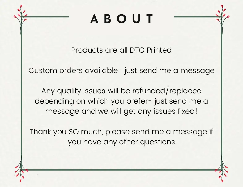 - For more information on processing times, shipping details, bulk orders, garment care, and more, feel free to message us.