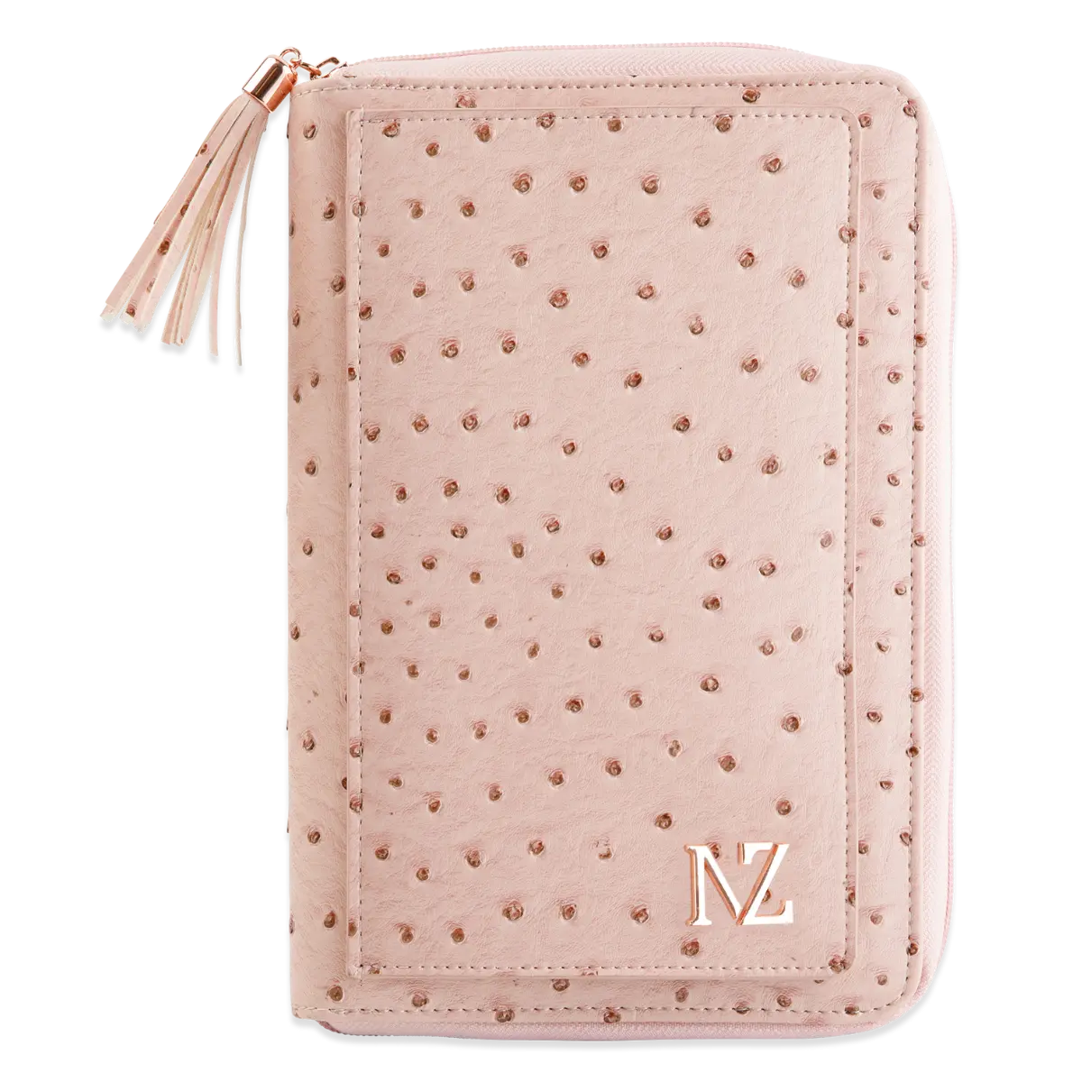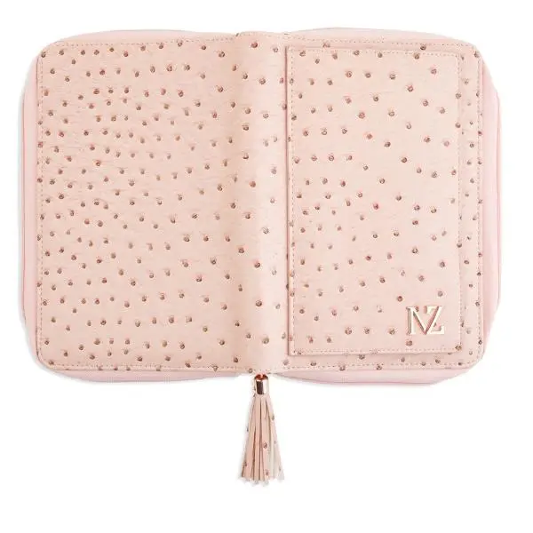 Crafted from cruelty-free vegan ostrich leather with a soft vegan lining inside, the cover feels as good as it looks. The delicate pink zipper, rose gold hardware, and signature transparent pocket showcase attention to every detail. With thoughtful compartments for cards, notes, pens, and more, it's a planner cover that makes organization effortless—and stylish.
