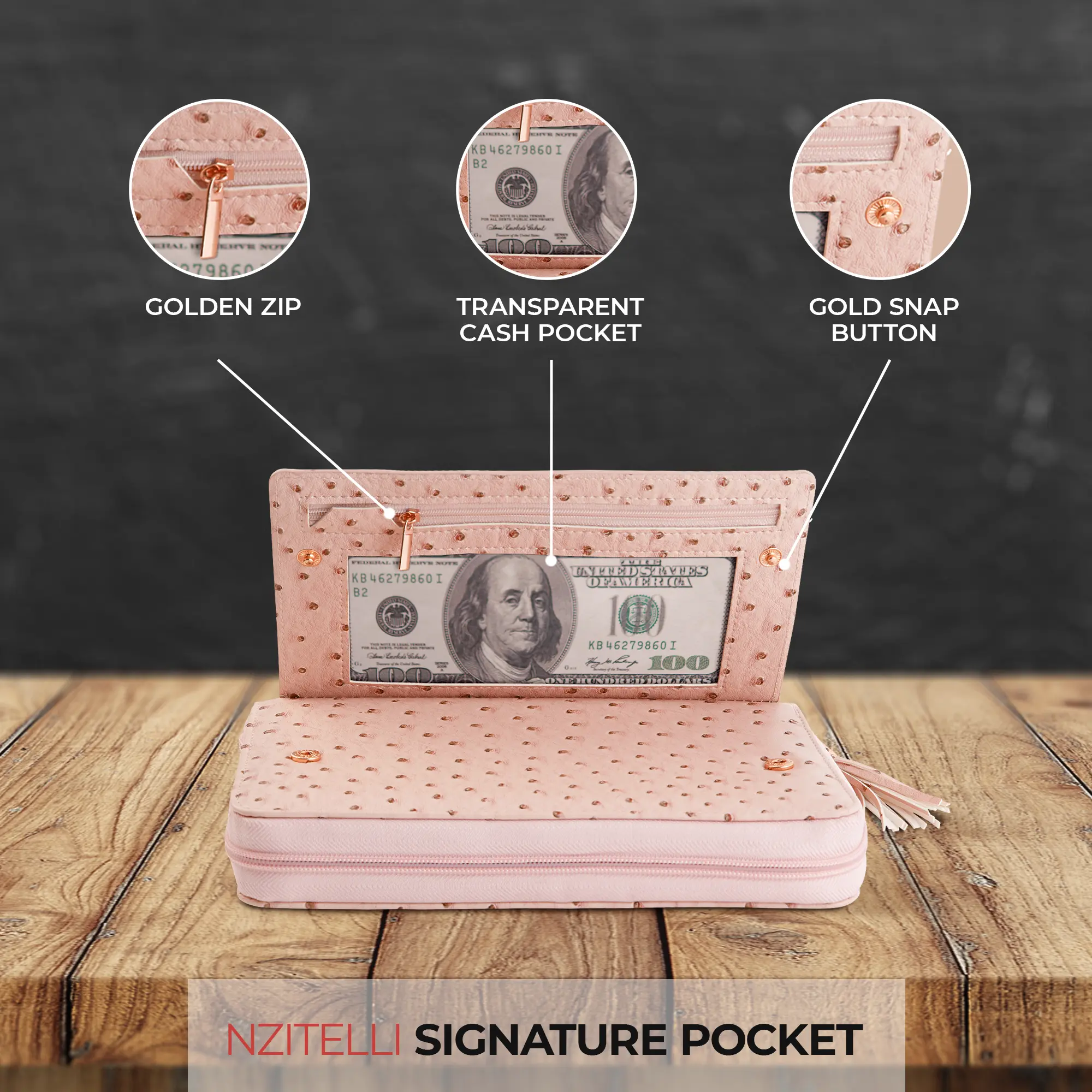·Pink zipper & pink tassel with rose gold finish for a feminine touch
