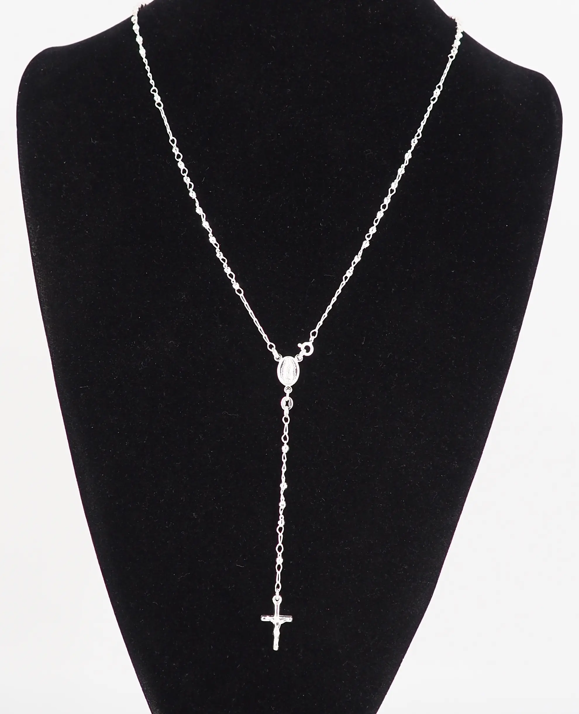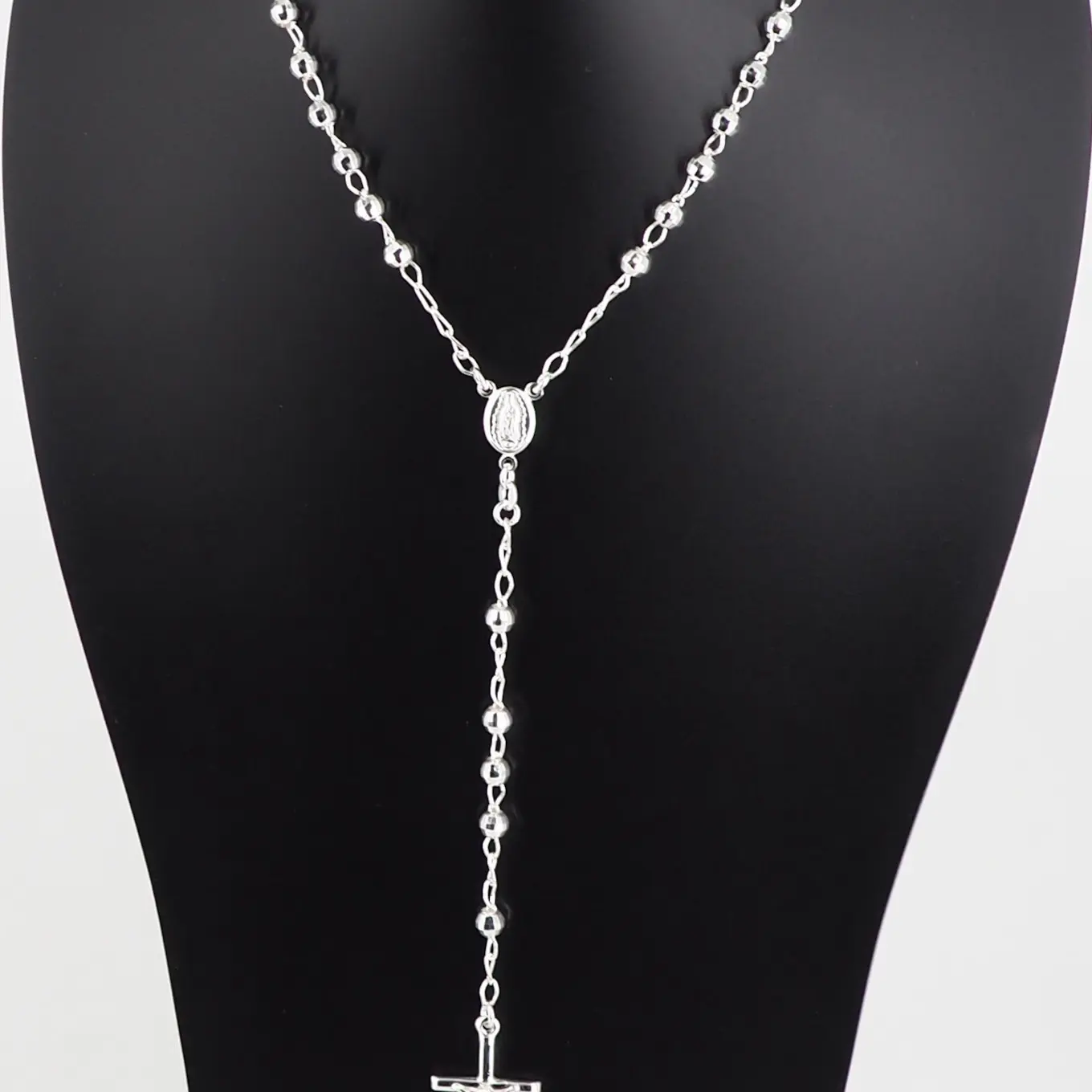 This meaningful necklace features 925 sterling silver rosary beads, capturing delicate beauty in an iconic religious design. The 4mm beads are diamond cut, with a Virgin Mary Guadalupe centerpiece. A tube cross hangs beautifully from the chain. Perfect for women and men, it weighs approximately 11 grams. High polished for a super shiny and smooth finish. Wear alone or layer with your favorite pendant.
