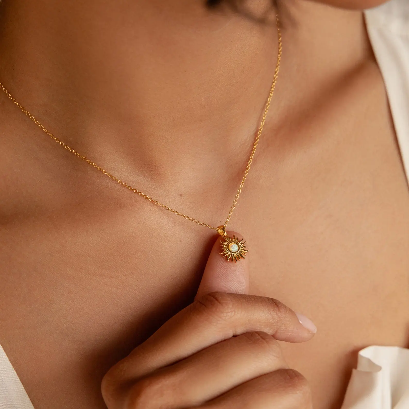 Bohemian and dreamy is our Opal Sun Necklace. With a prismatic Opal gemstone in the middle of a detailed sun pendant, this dainty necklace is a perfect jewelry gift for someone who brightens your day.