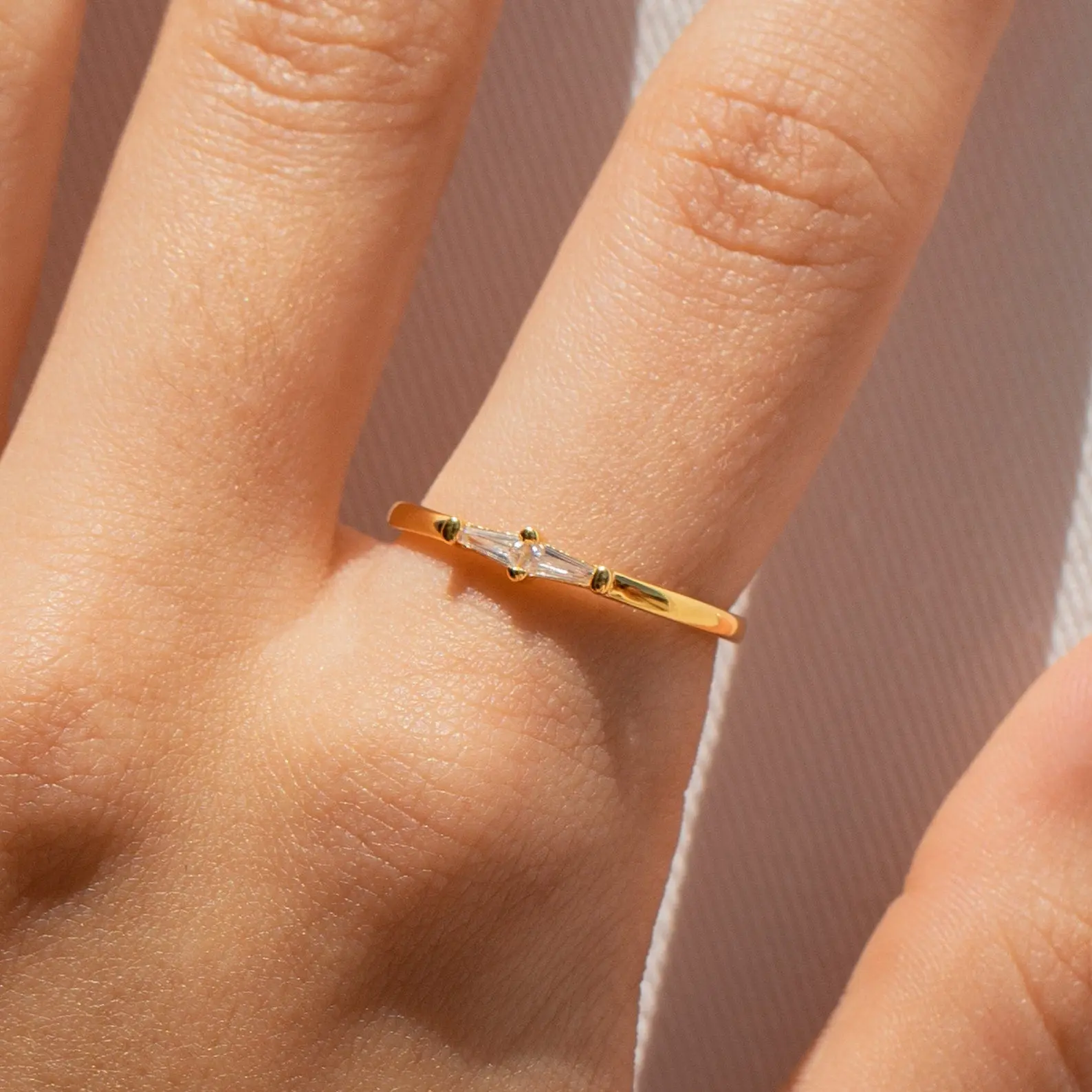 Looking to surprise your loved one with a little extra shine? Our Eleanor Ring is a classic dainty piece featuring a clear diamond crystal baguette, making it a timeless ring with the perfect amount of sparkle.