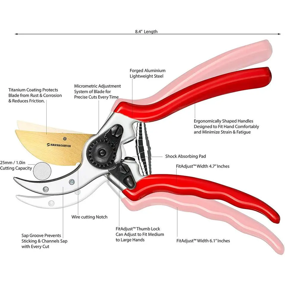 Our micrometric adjustable system allows manual adjustment and alignment play of the cutting blade for optimal precise clean cuts every time. The smooth effortless cutting actions make trimming an easy chore of rose stem floral plant shaping or ornamental flowers vines grape fruit tree limb branch shrub bush hedge lawn edging small trees without many efforts.