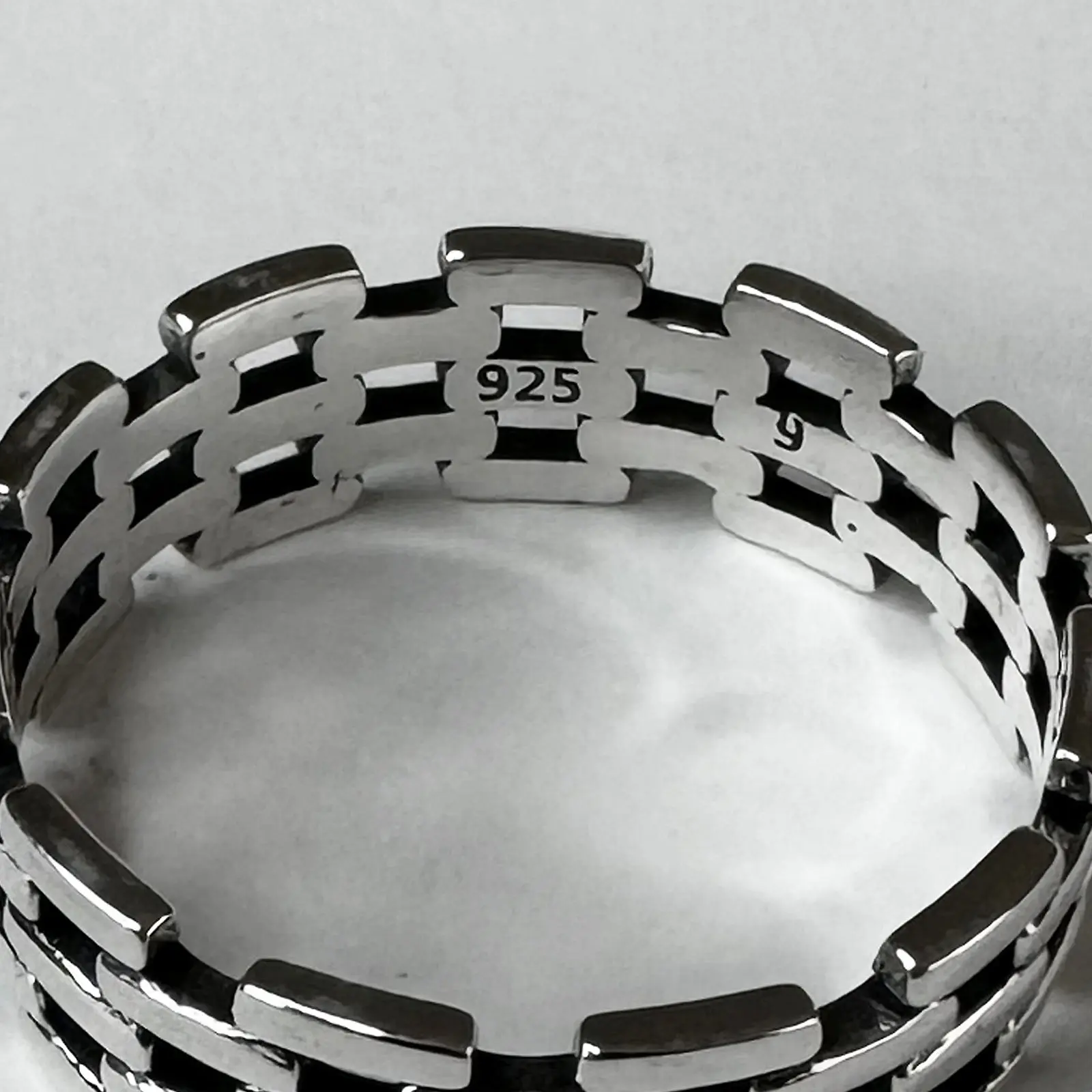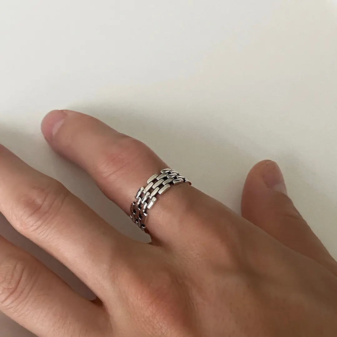 This beautifully hand-crafted ring features a brick-like stacked design that has pre-oxidized silver details on the insides of the ring, giving it more definition. It's a great ring to wear alone or when added to your ring stack. This ring is lightweight and has that sleek, classy appearance, making it such a great ring for any occasion dressed up or down.