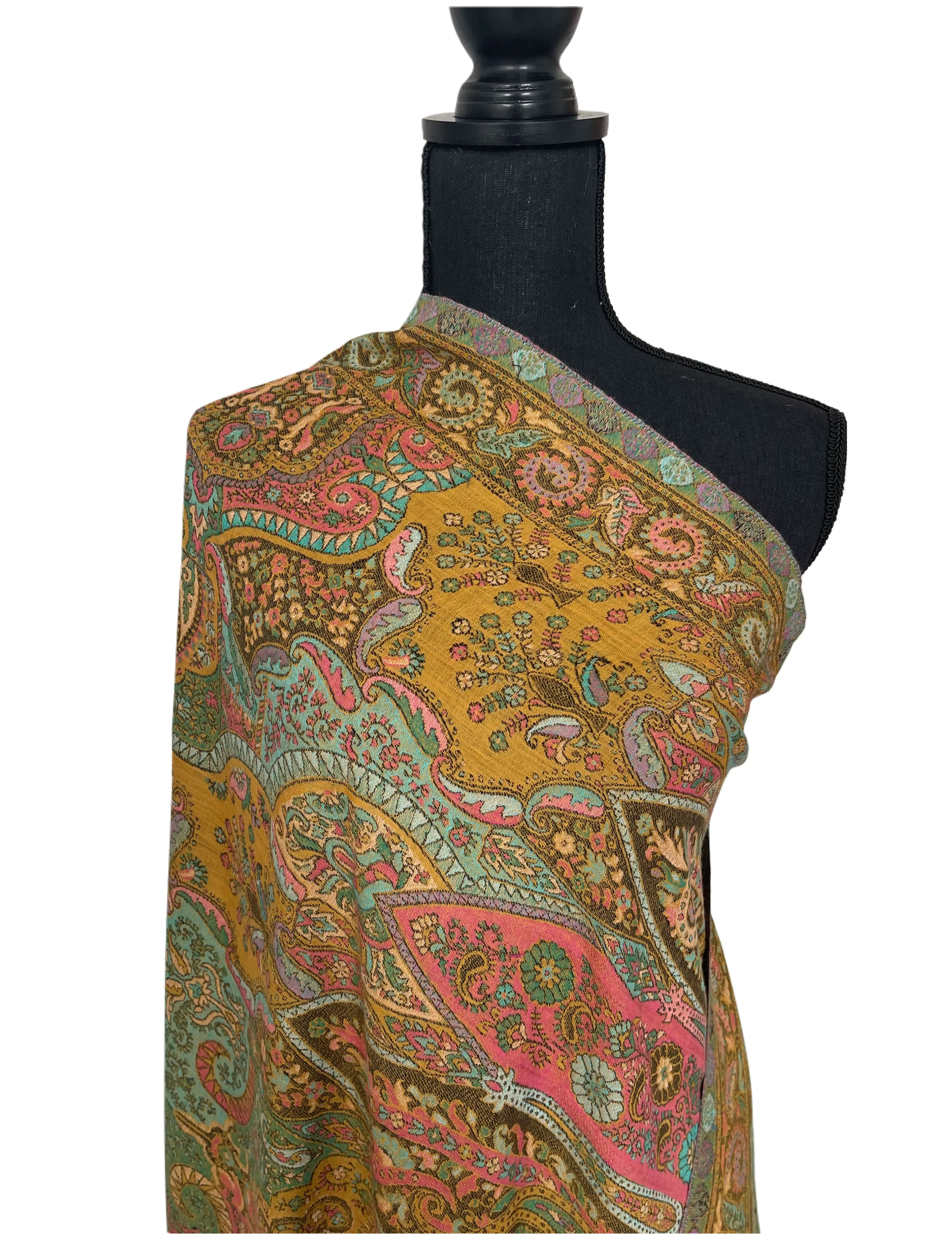 The beautiful Kaani Jaamawar is a traditional Kashmiri Shawl made from 100% Pure Merino Wool with fibres extremely thin and lightweight. The patterns are thoughtfully made out of vegetable/pastel colors.Â