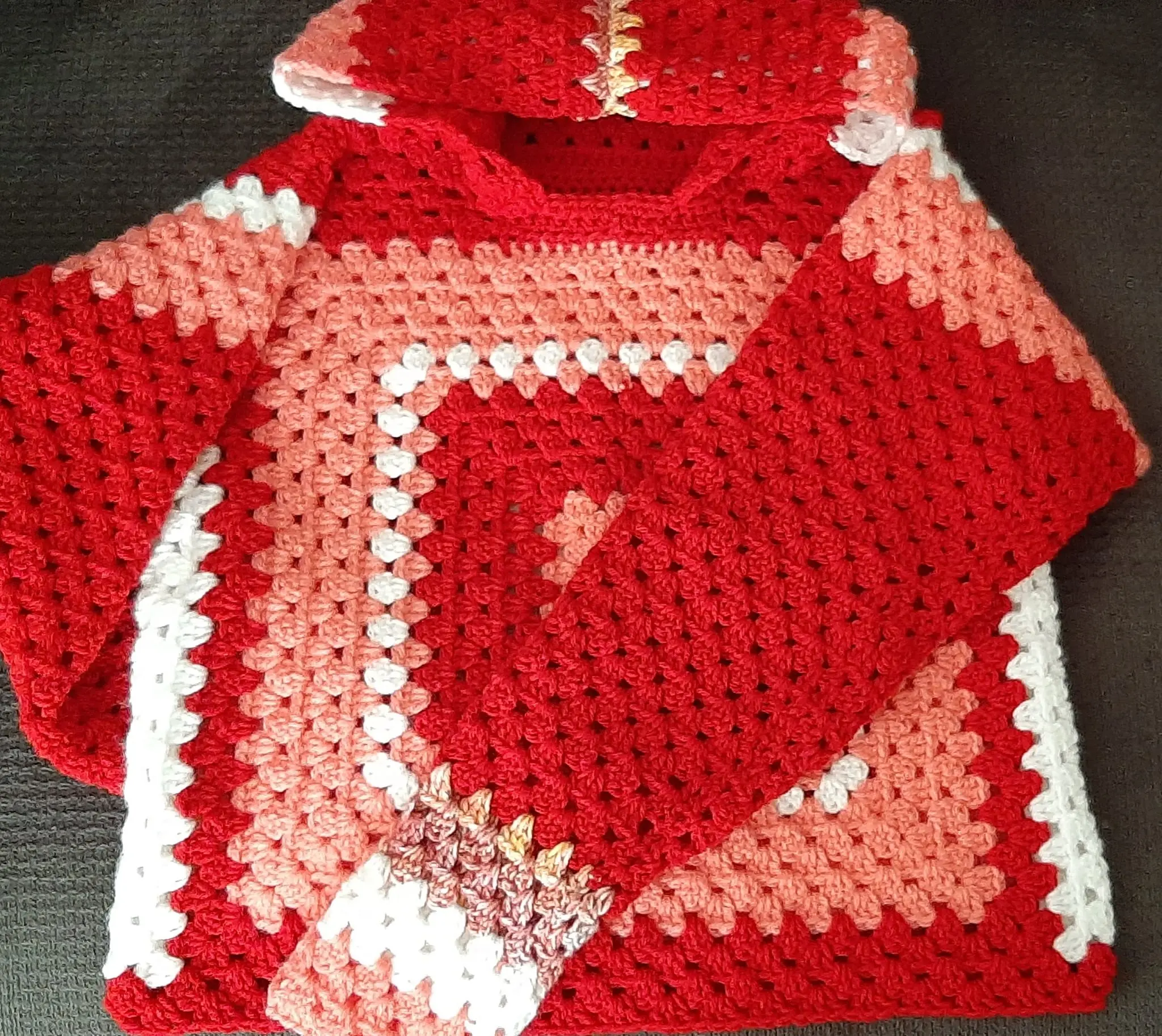This Crochet Hoodie is a unique addition to any woman's wardrobe. The hoodie is made with red, white, and pink acrylic yarn and features a multi-colored cotton yarn accent that adds a pop of color to the design.