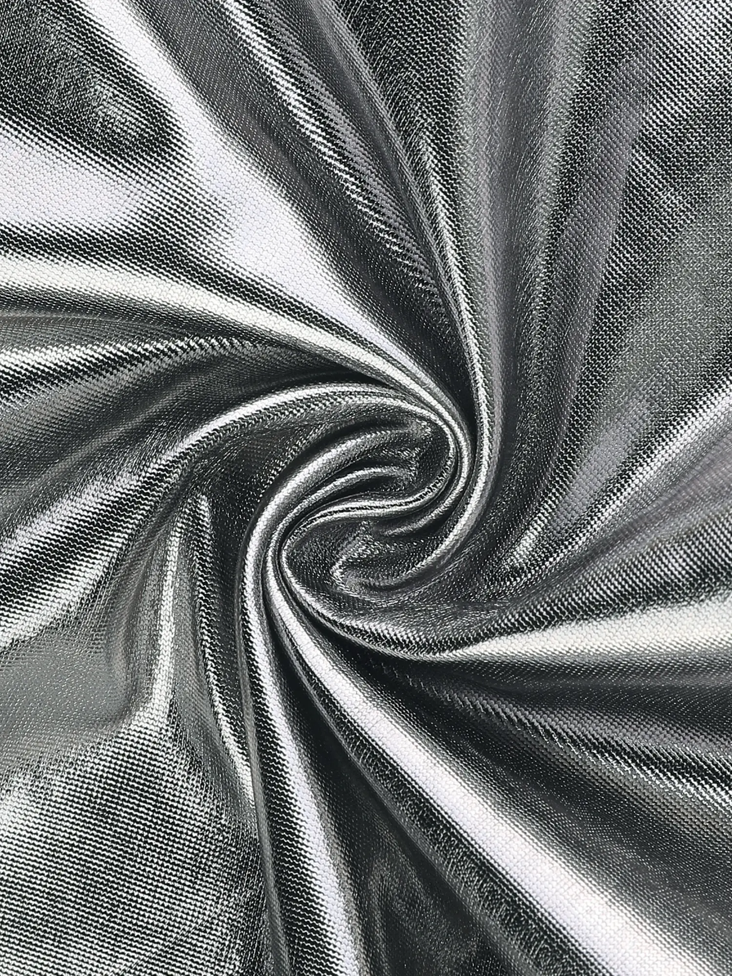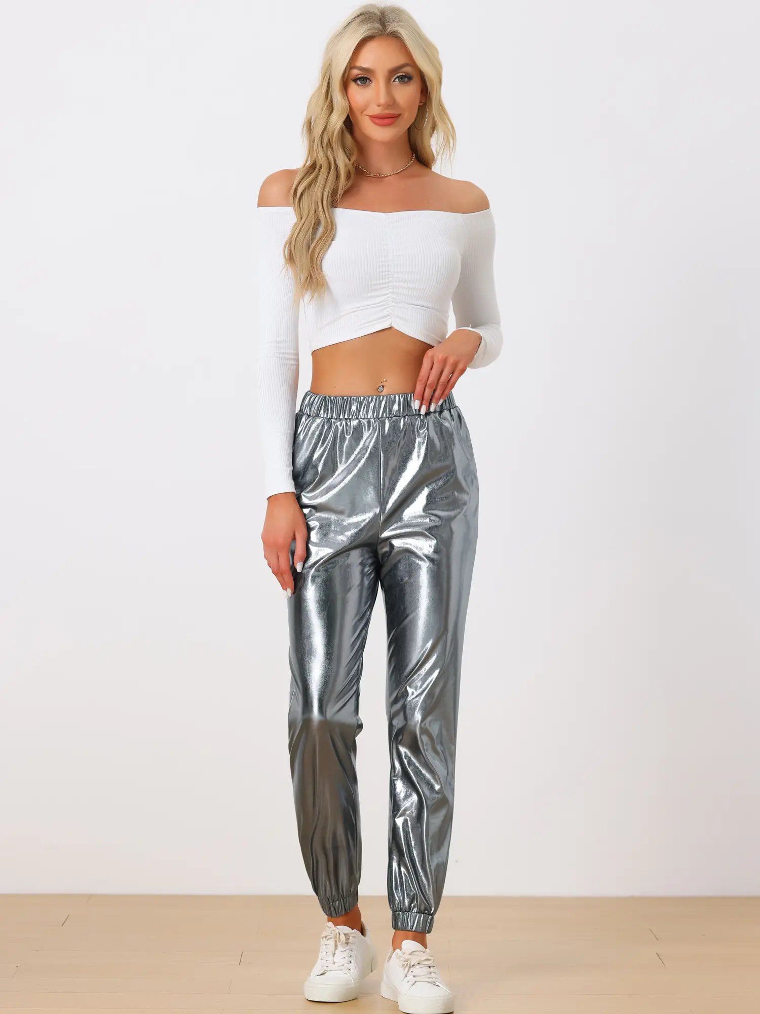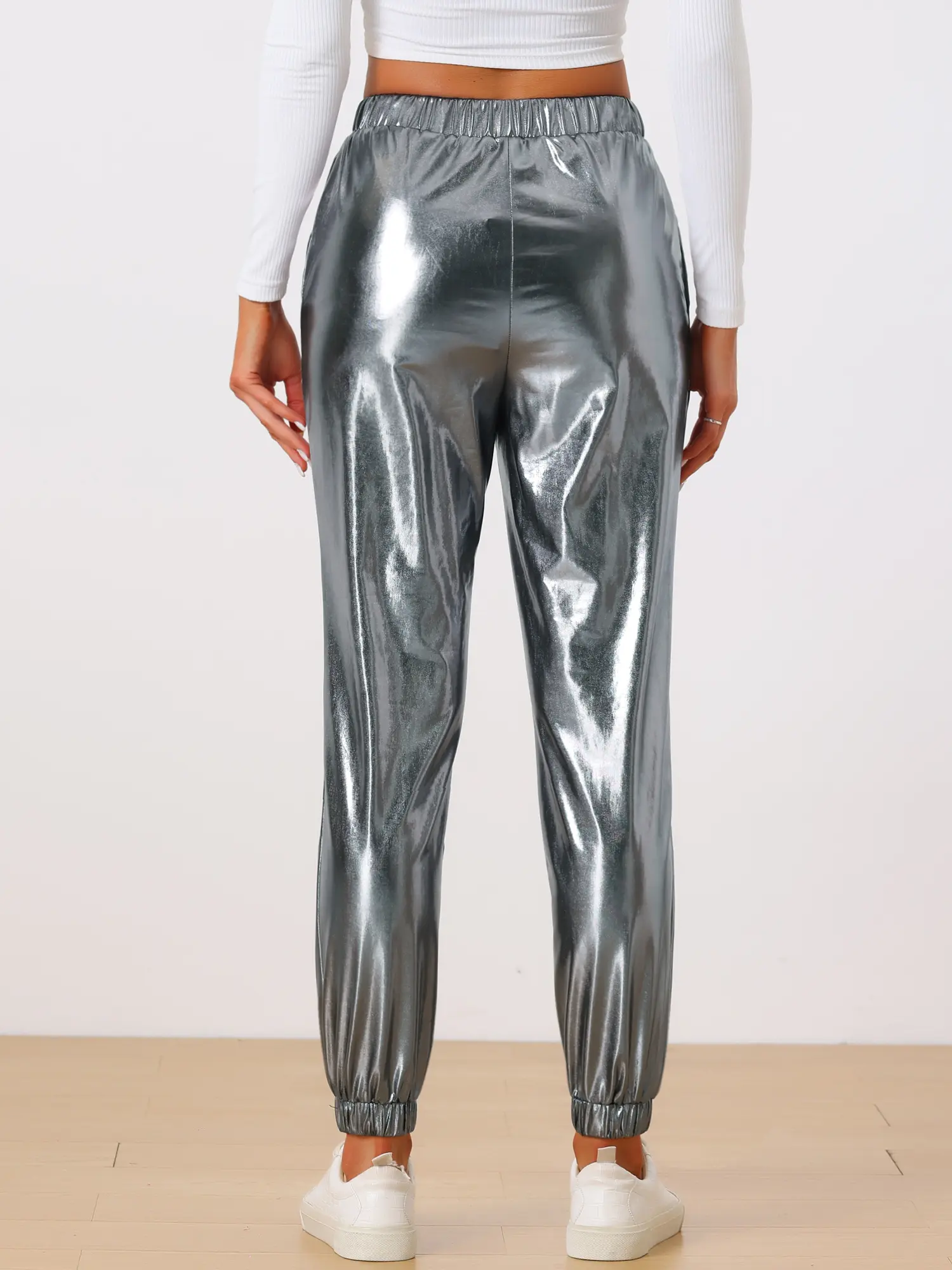 INSPIRE CHIC Metallic Trousers Christmas Shiny Sparkle Elastic Waist Holographic Pants Silver Grey