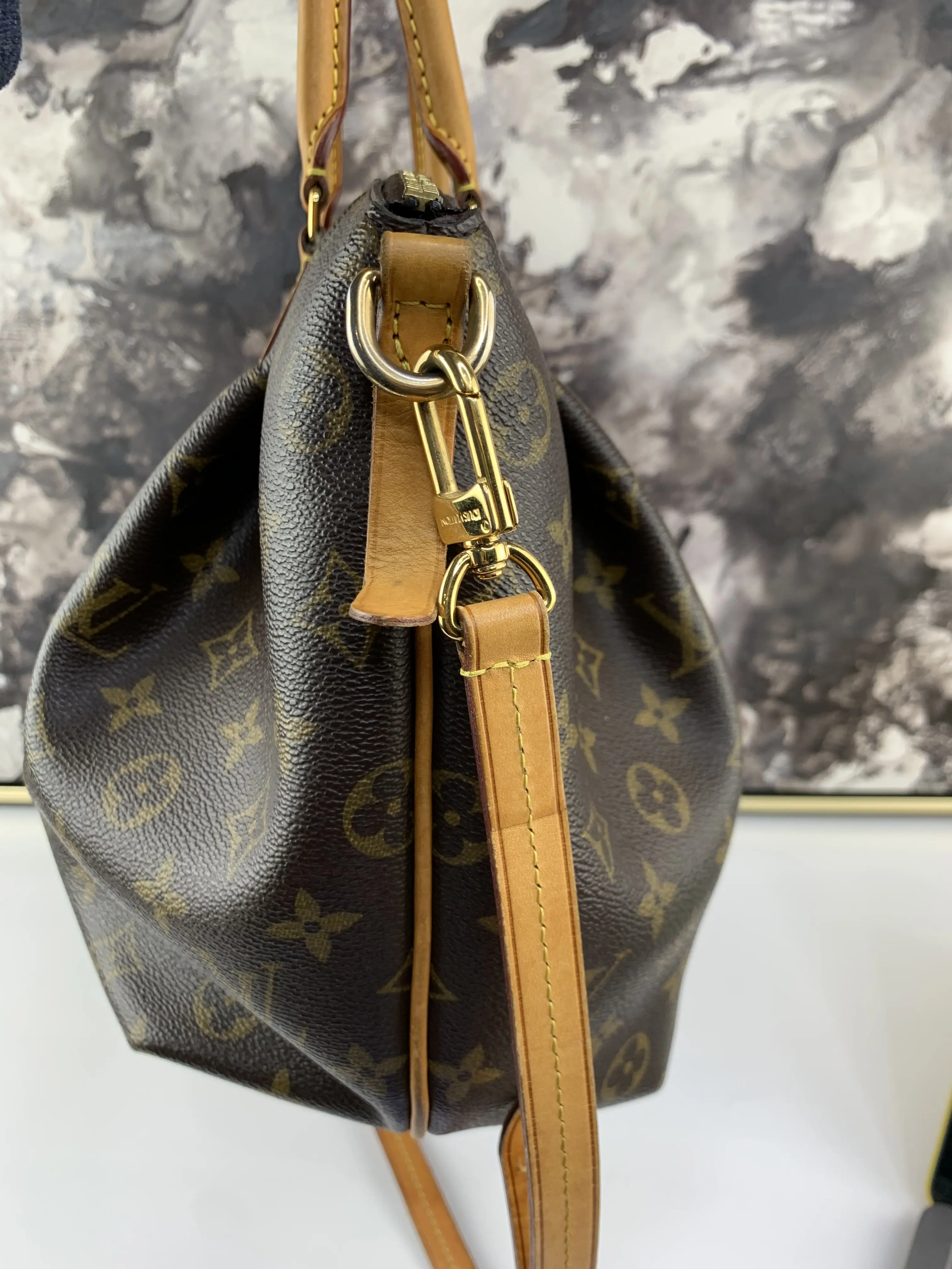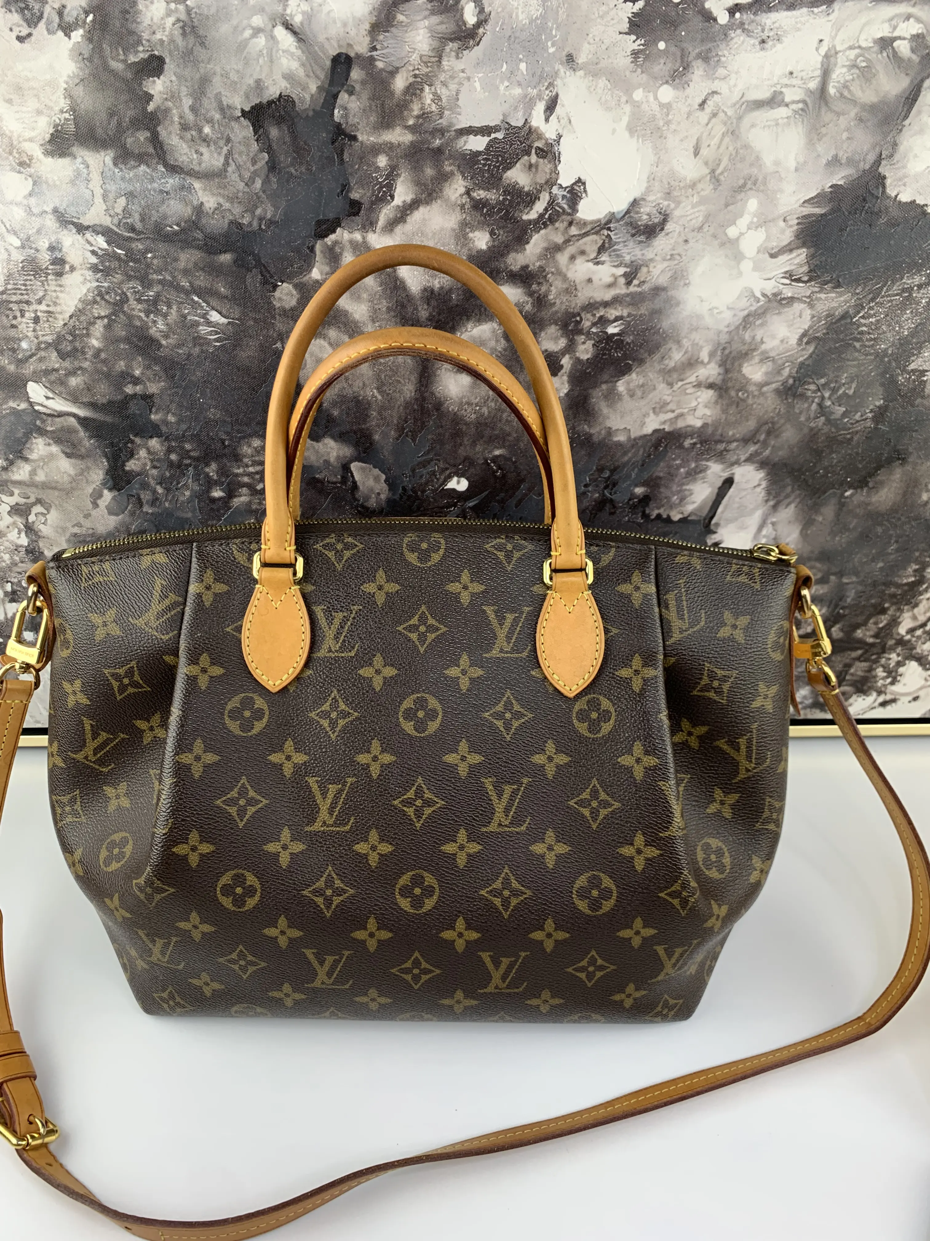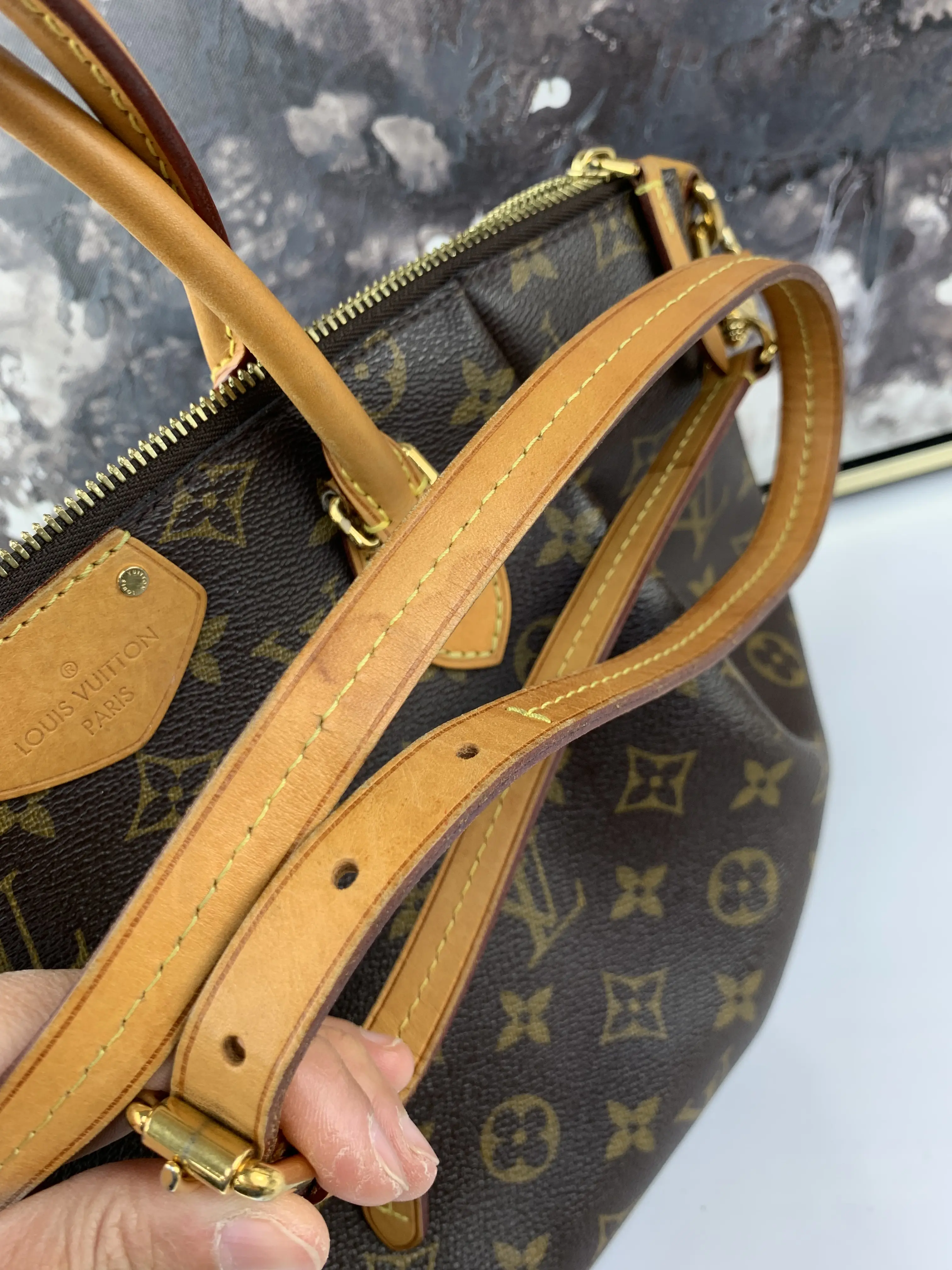 The Turenne MM Crossbody is a pre-owned bag that is perfect for everyday use. This crossbody bag has a honey to caramel patina on vachetta leather with minimal marks and minor darkening on the strap. The canvas is clean and bright with no cracks or tears, making it an excellent choice for those who want to carry their essentials in style.