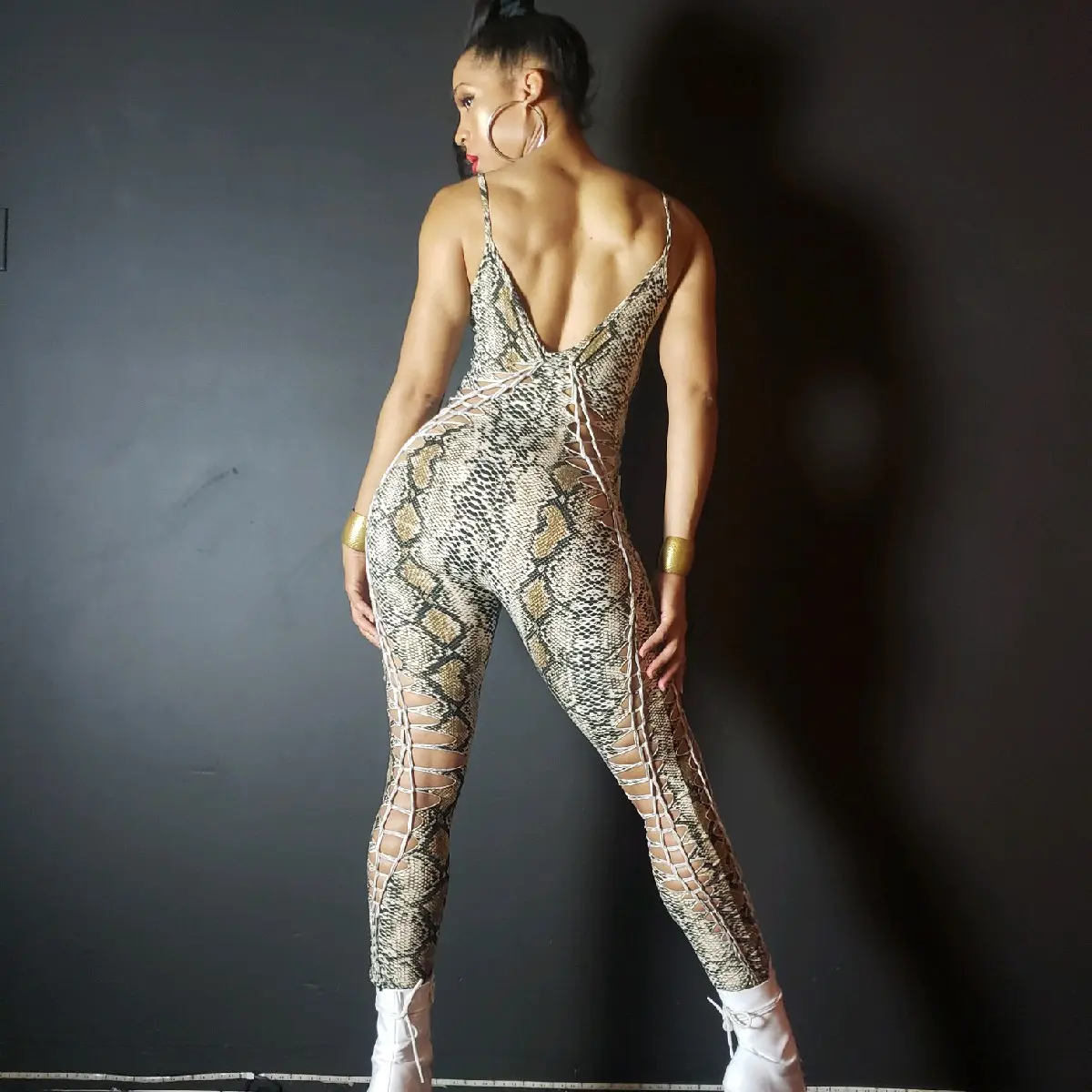 In summary, this Snakeskin Catsuit Handcut Spaghetti Strap Unique Festival Fashion Performance Wear Costume Bodysuit Tops Underwear Womenswear will leave heads turning at any event you attend!