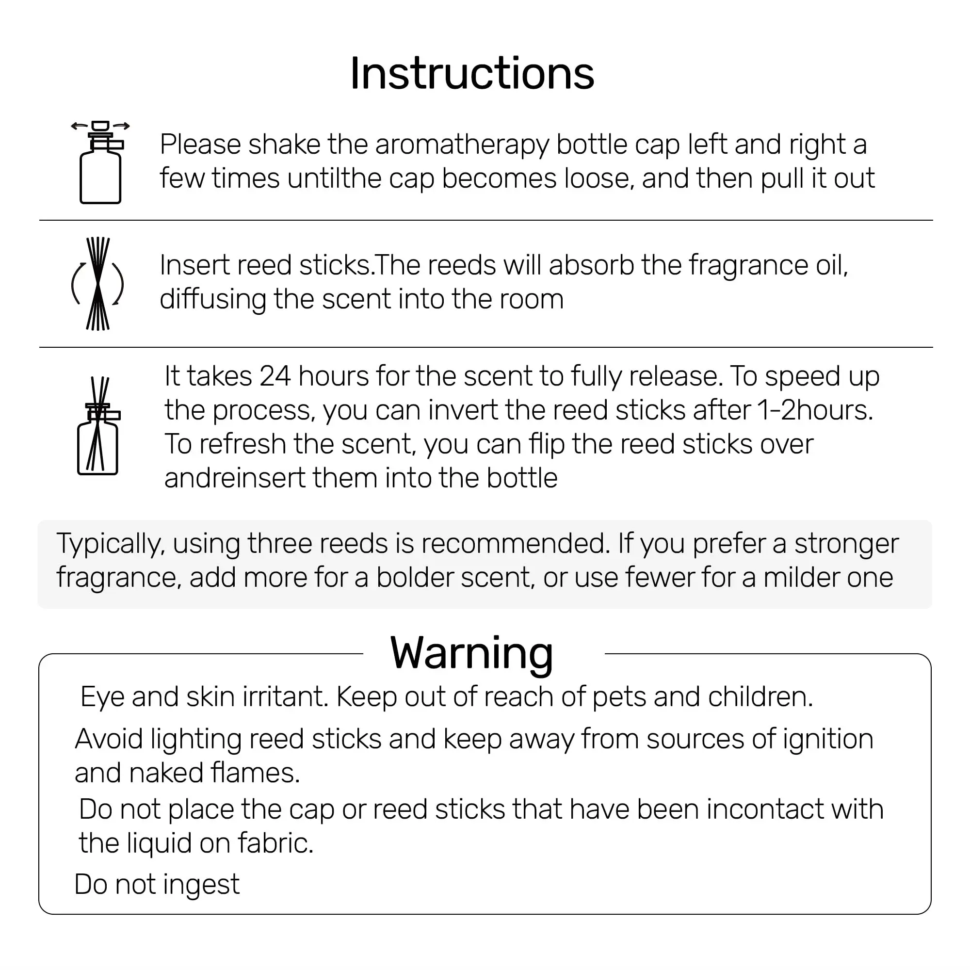 A: Generally, using 3-4 reed sticks is suitable for achieving the appropriate concentration of fragrance. However, if you feel the scent is too weak, you can increase the number of reed sticks, and decrease it if it is too strong.