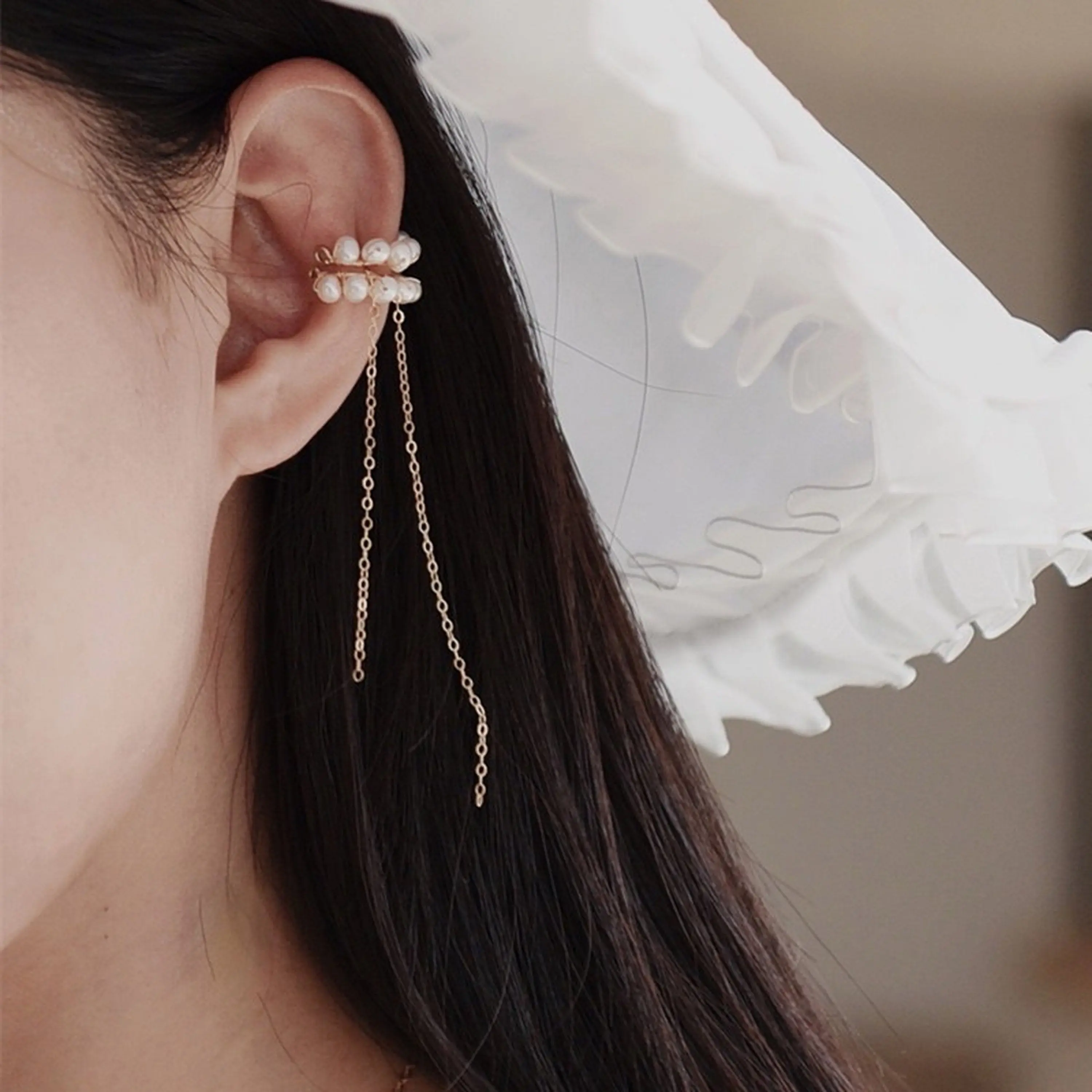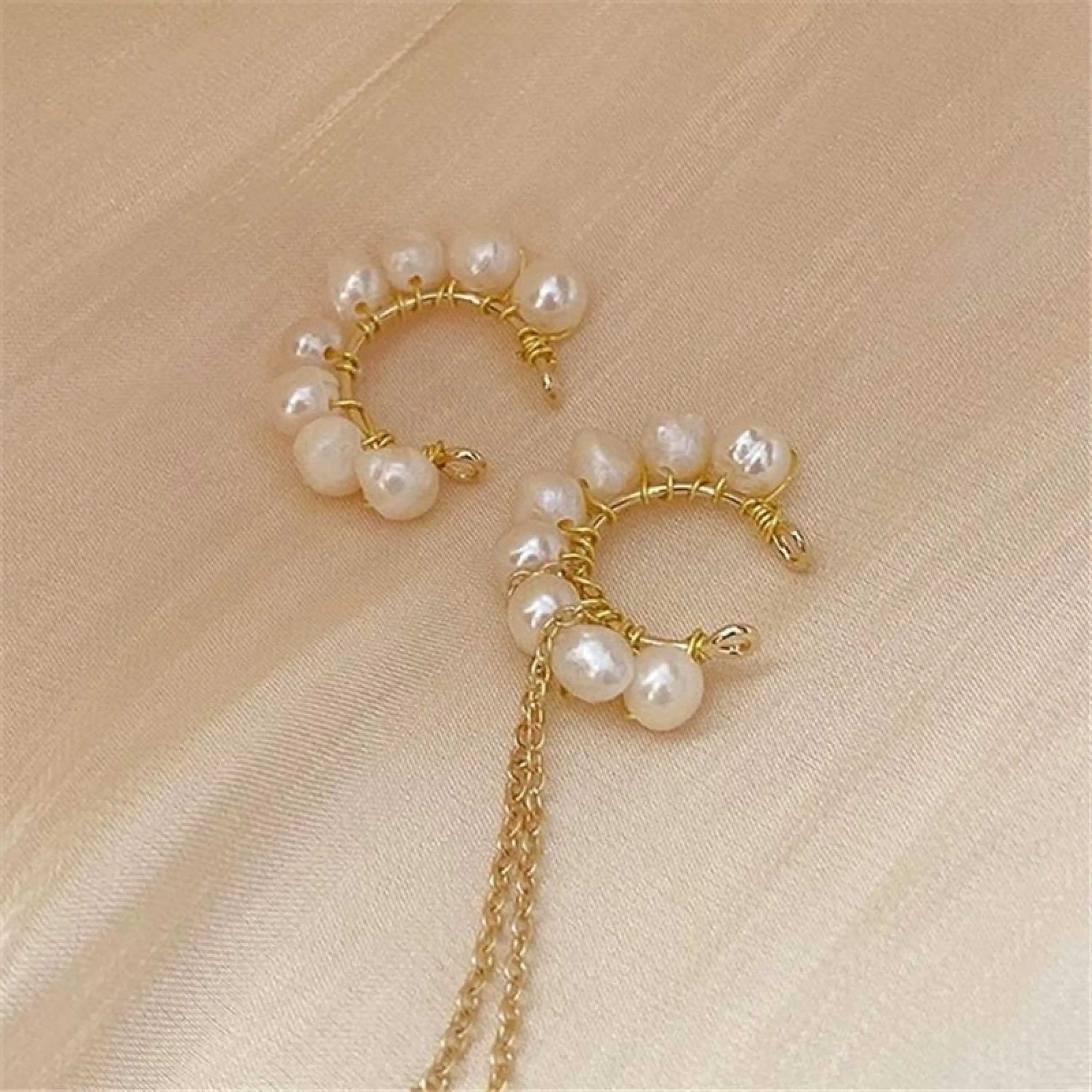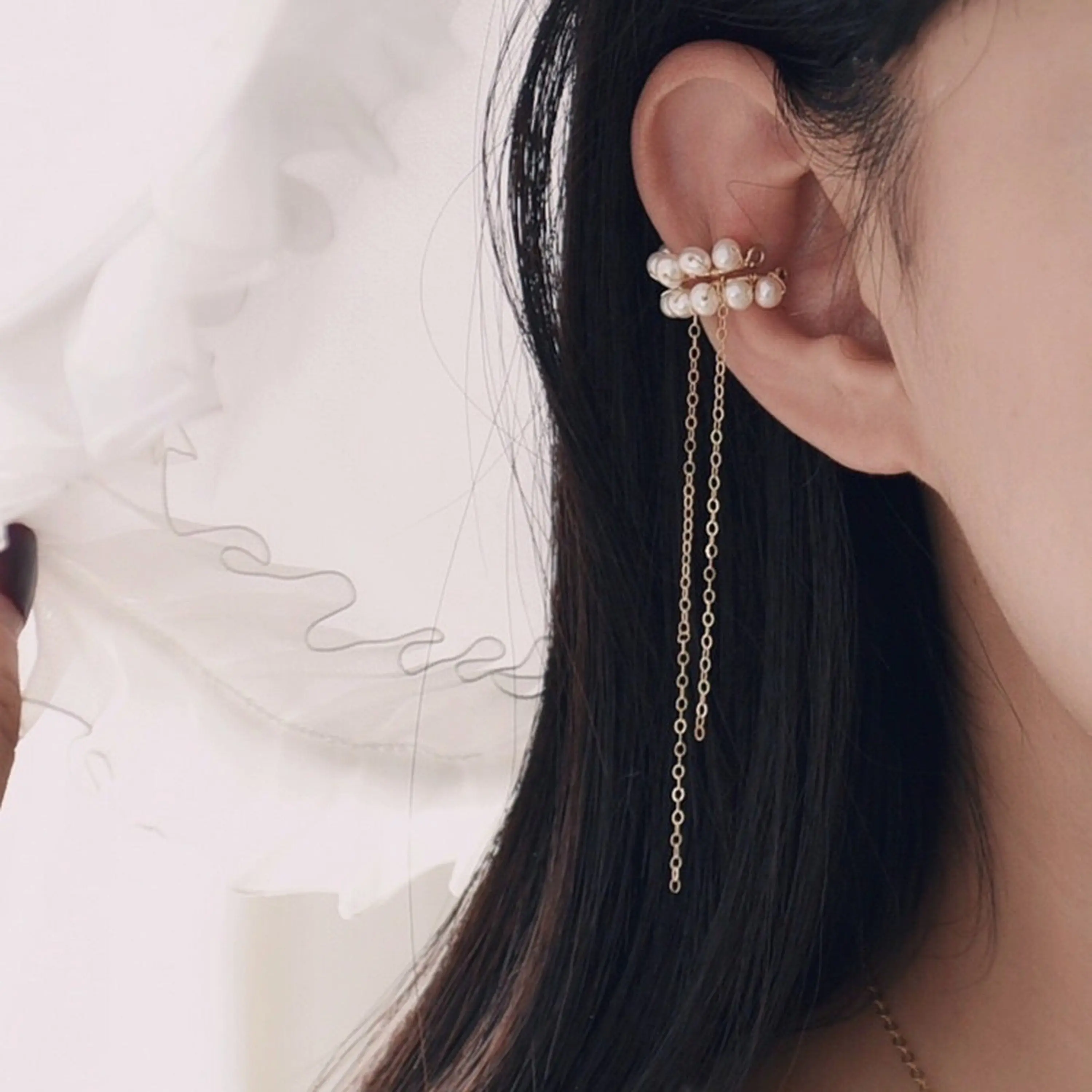 Handmade natural pearl beaded no piercing ear cuffs, with/without gold chain dangles. Carefully selected freshwater pearls, every pearl is in unique shape with beautiful shimmer. Twisted gold clustered with ivory pearl beads, exquisite and delicate, looks luxurious elegance. No ear hole necessary, easy to wear and adjust. Sold as 1 piece.