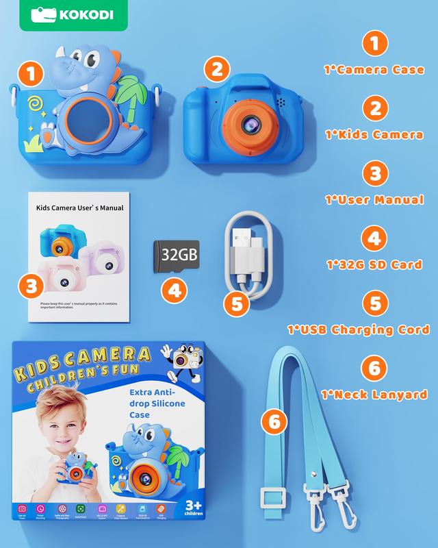 Capture fun moments with the Dinosaur Fun Camera Toy! This 1080P dual-camera captures 48MP images with 8x digital zoom. The 2.0" IPS HD screen ensures eye protection. It includes a 32GB SD card for 4,500 photos. Perfect for kids aged 3-9, it's an ideal Christmas or birthday gift.