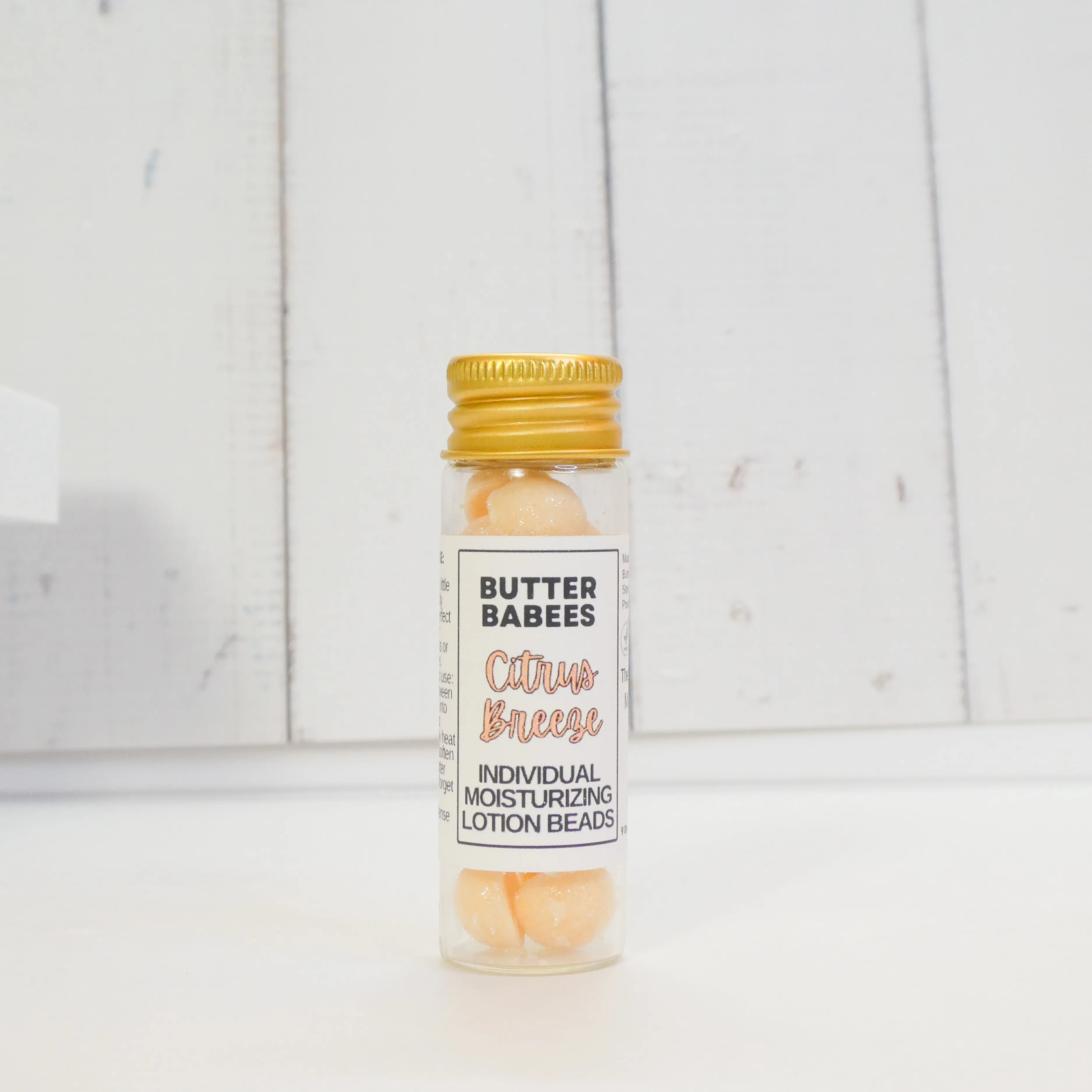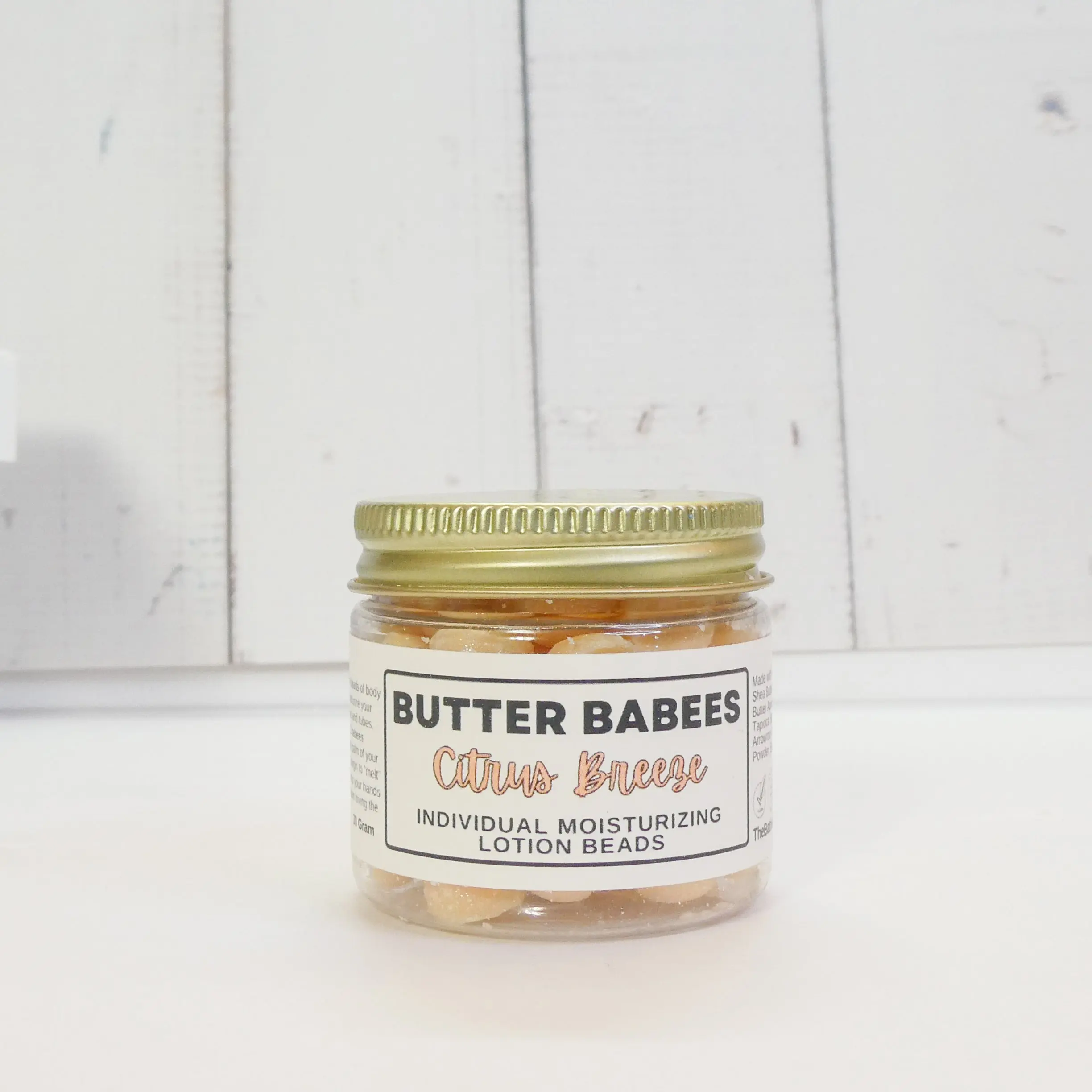 Refresh your skin with the zesty aroma of Citrus Breeze Butter Babees. These all-natural lotion beads are designed to provide deep hydration, leaving your skin feeling soft and energized. Infused with the bright and tangy scents of sweet orange and grapefruit, complemented by the herbal notes of rosemary and the calming aroma of lavender, each bead offers a rejuvenating skincare experience.