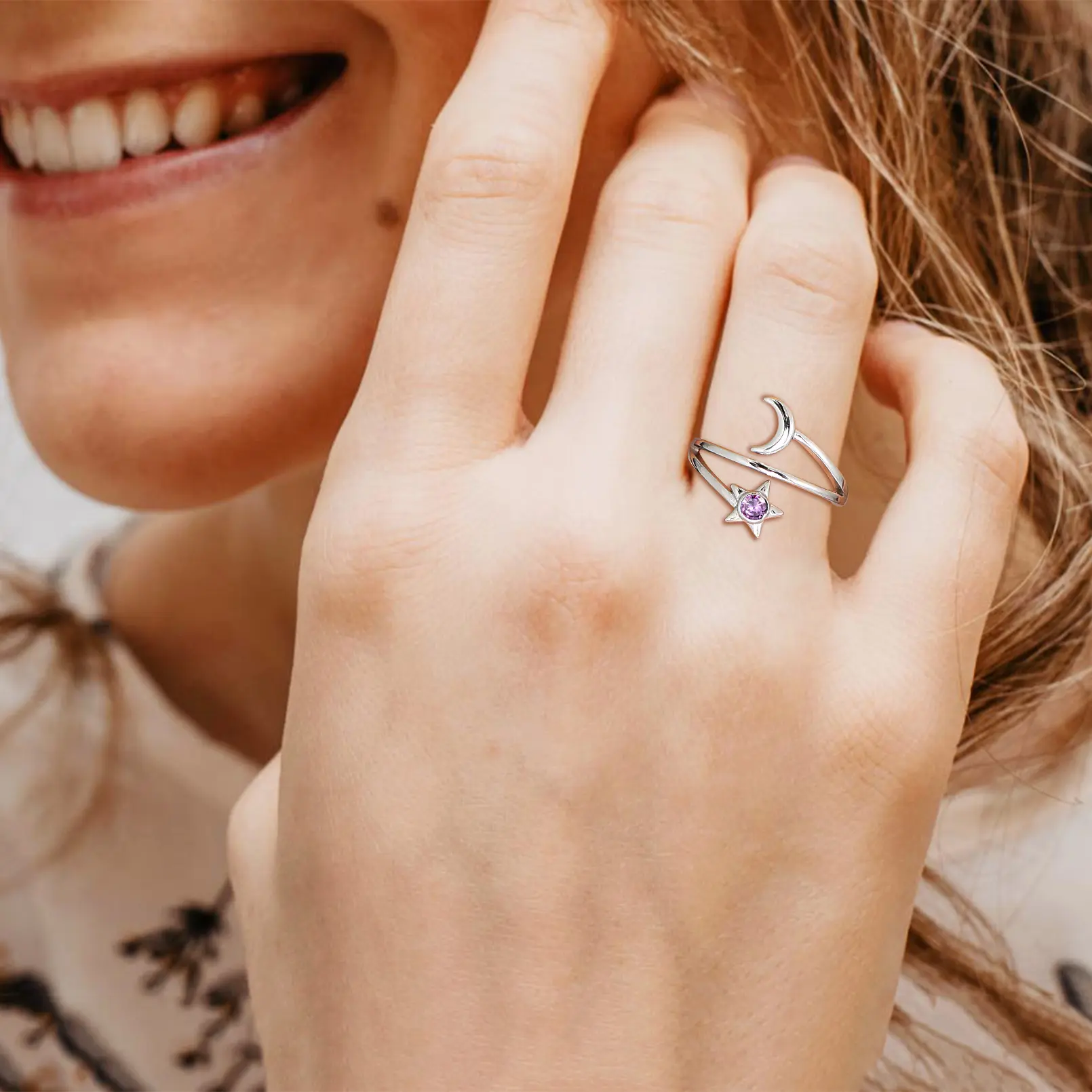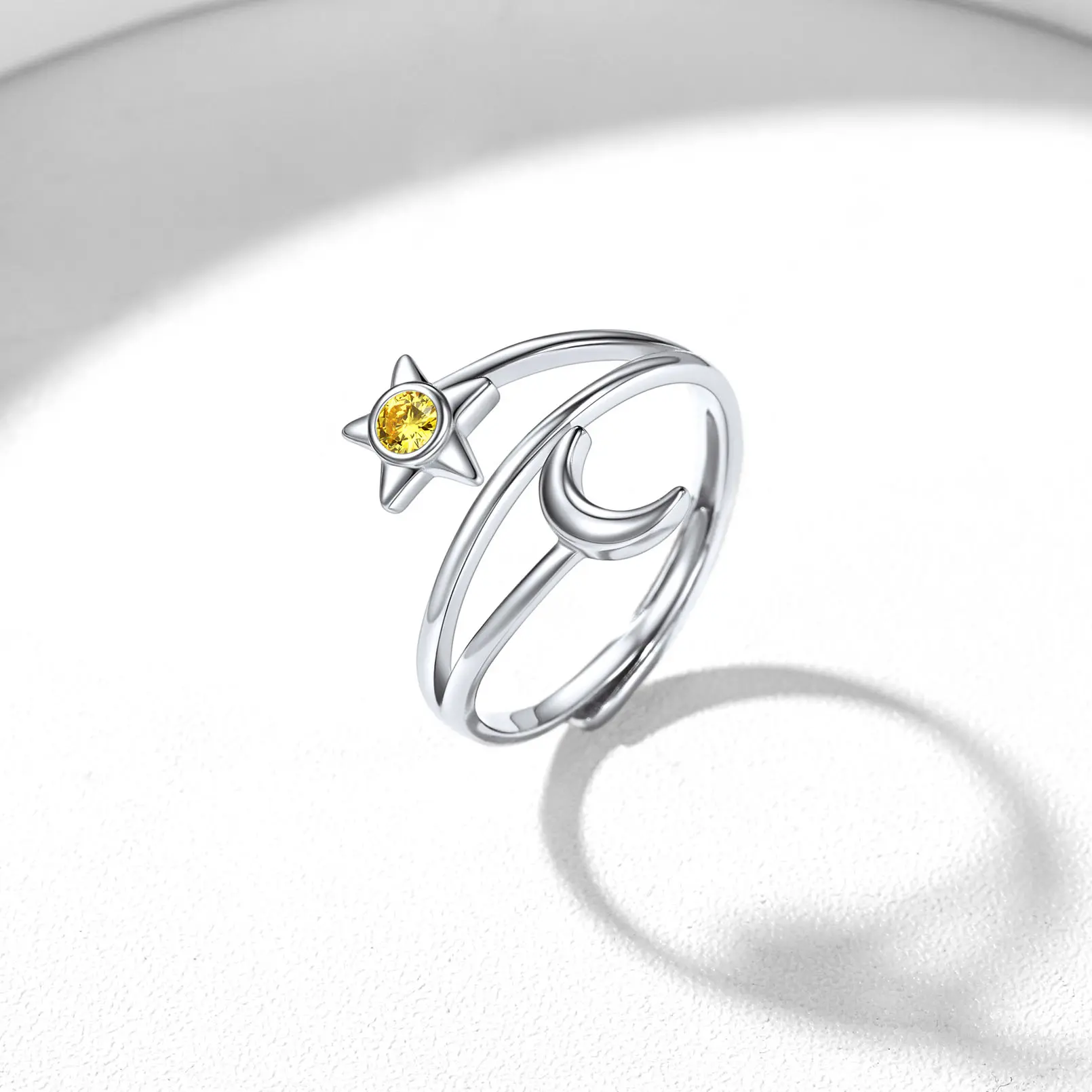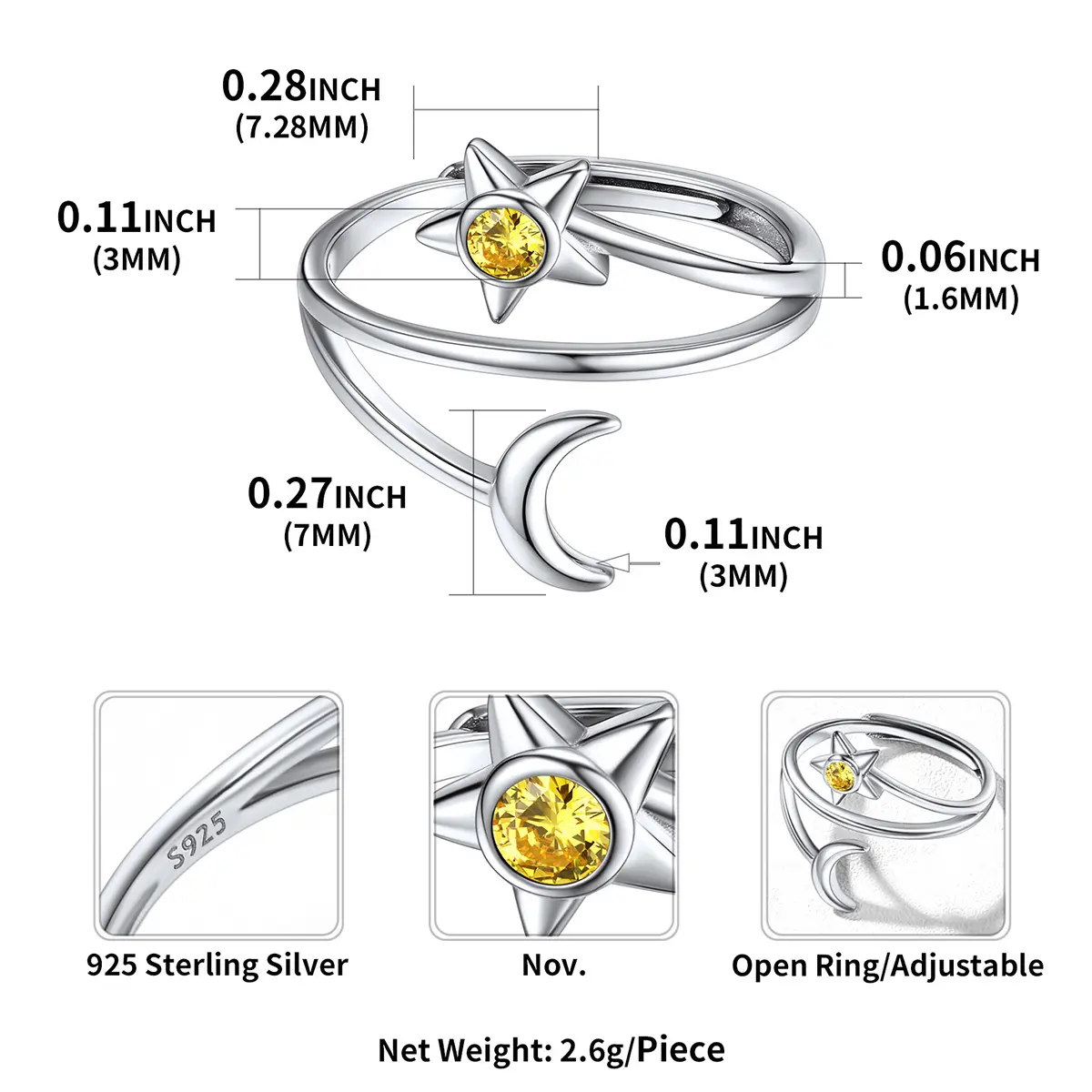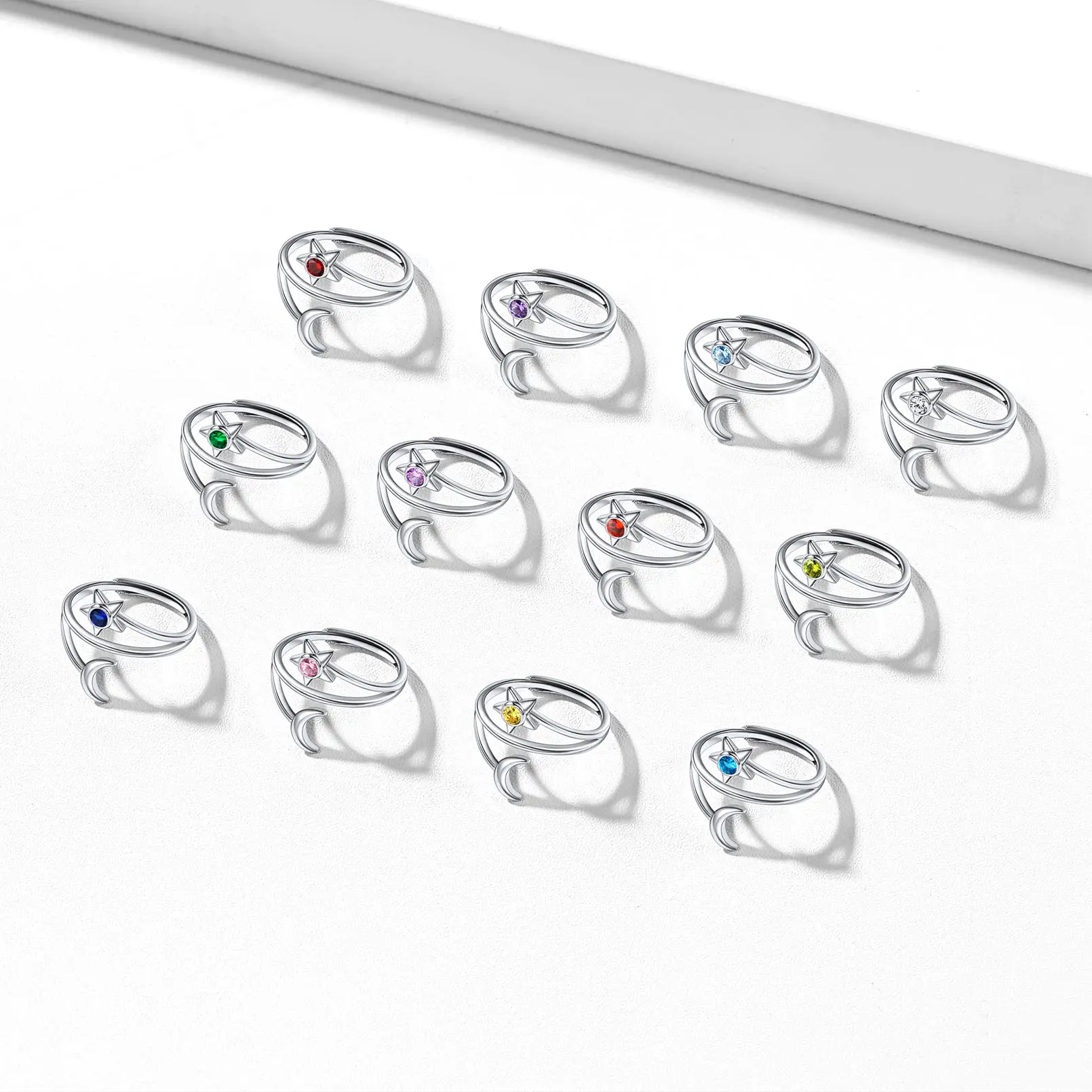 ChicSilver Stackable Dainty Daily Simple Casual Sparkling Shiny Crescent Moon and Star Birthstone 925 Sterling Silver Cubic Zirconia Adjustable Wrap Open Band Rings Birthday Gift for Women