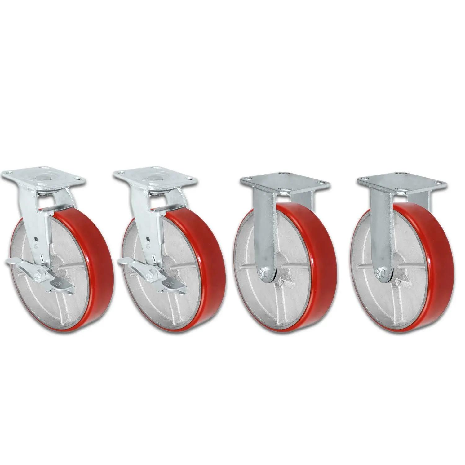 8" X 2" Swivel Caster Heavy Duty Red Polyurethane Wheel on Steel Hub with Brakes (2) and Fixed (2) 5,000 lbs Per Set of 4 Tool Box Casters - CasterHQ Brand (8")