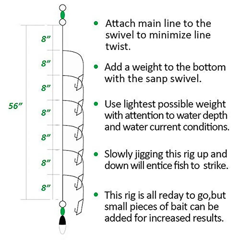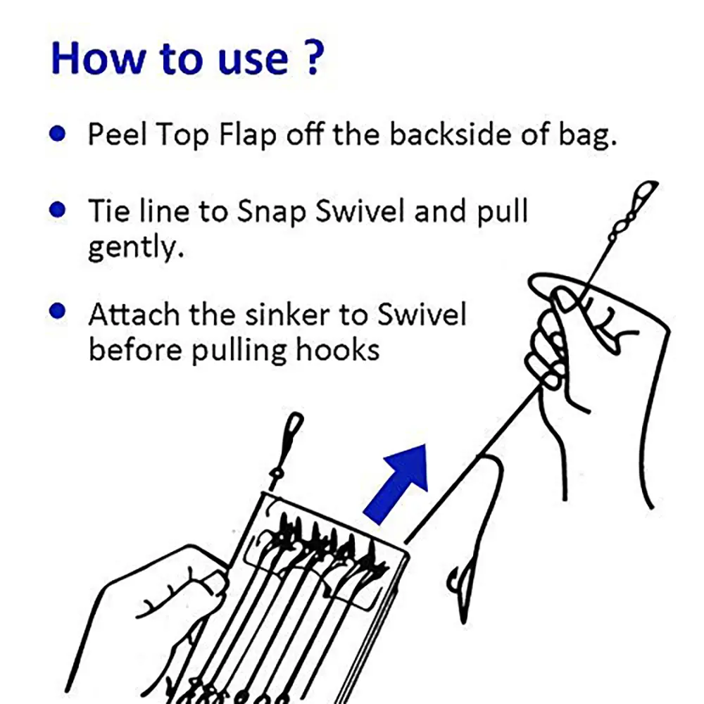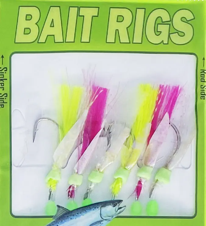 Here are 10 packs of live bait catching rigs in USA Size #10 with a 15 lbs main line and 10 lbs branch line. These multi-hook jigging rigs are used for catching mackerel, small jacks, herring, smelt and other small bait fish. Our Bait Rigs vary in length depending on number of hooks, but generally, 10 inches of mail lines stretches between 4-inch drop lines. Snap swivel and barrel swivel attach at two ends of rig. Each rig has six gold finish hooks, plus varying strengths (lb.- test) of main line and branch lines.All rigs are supplied in a convenient "One-Pull" dispenser package.
