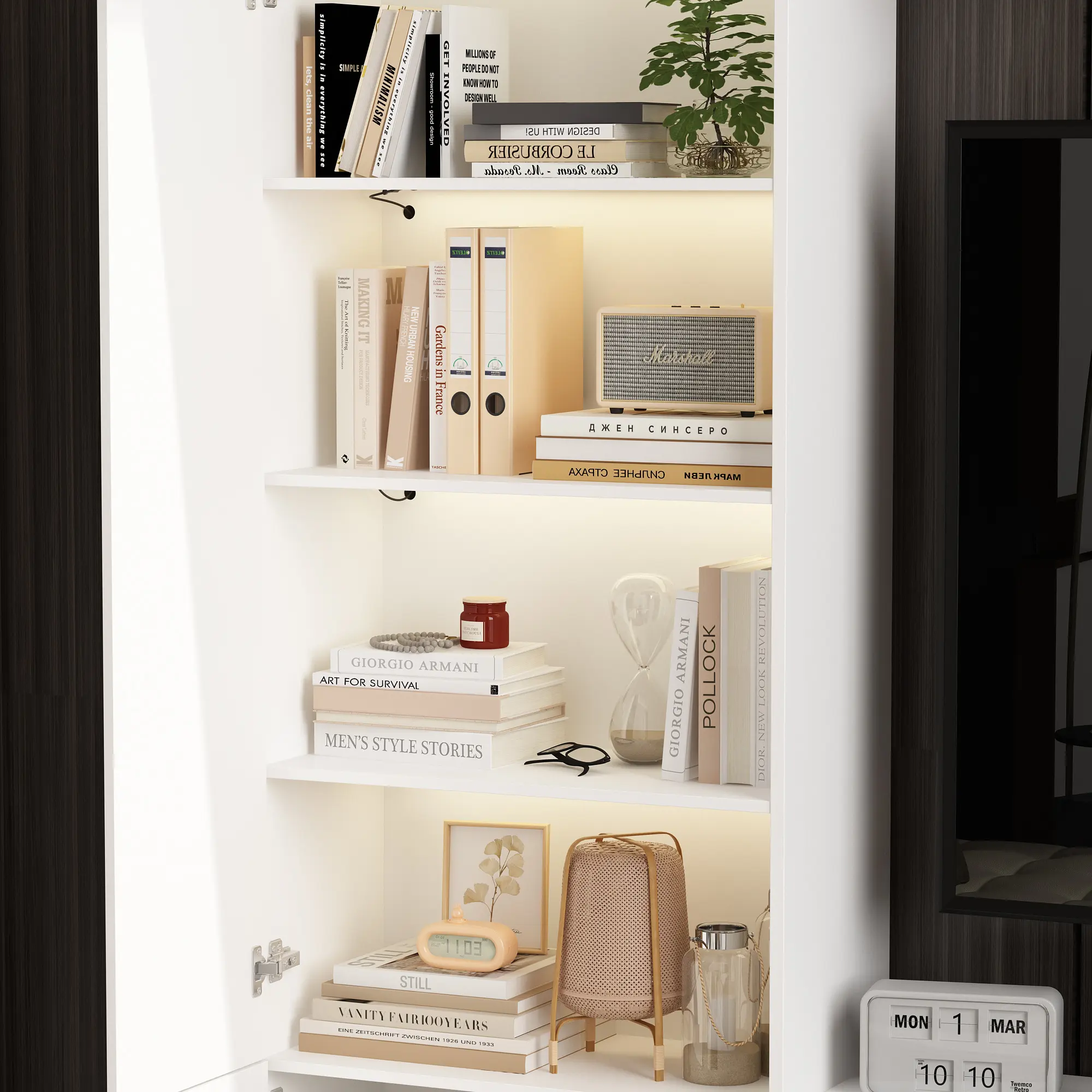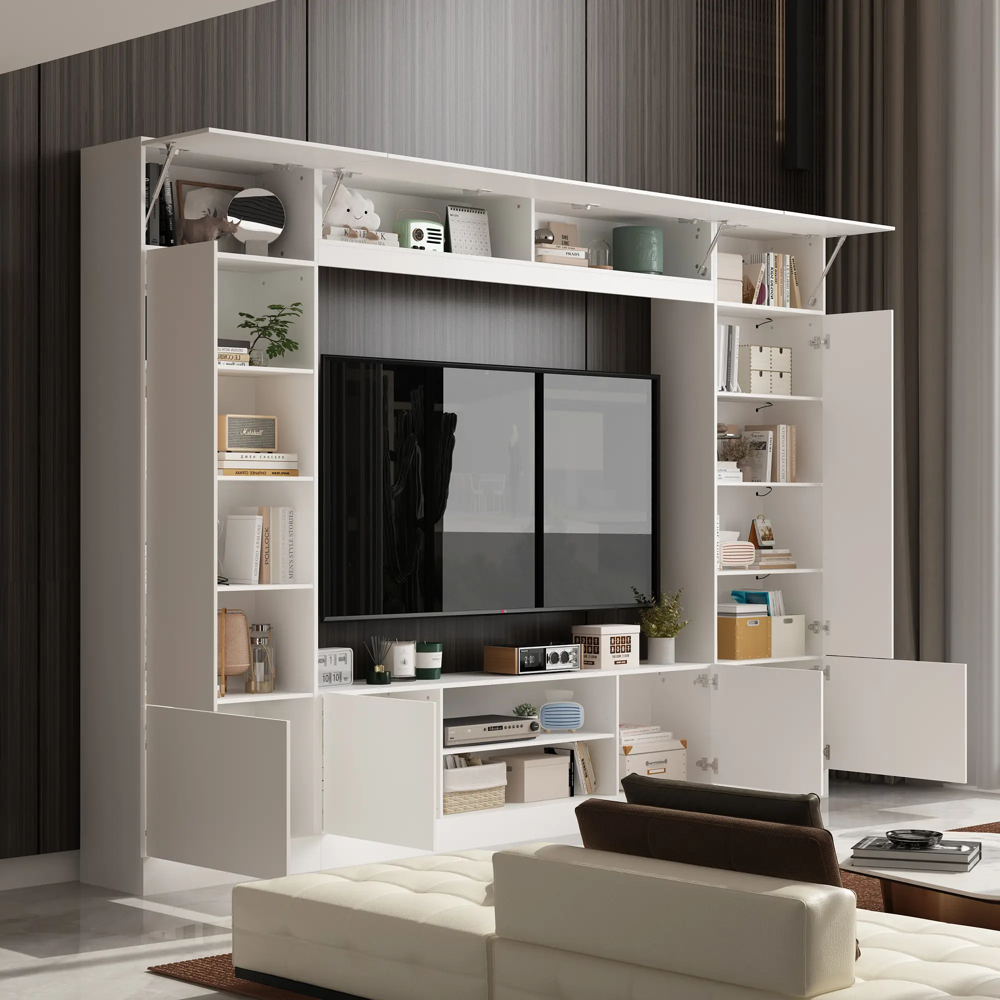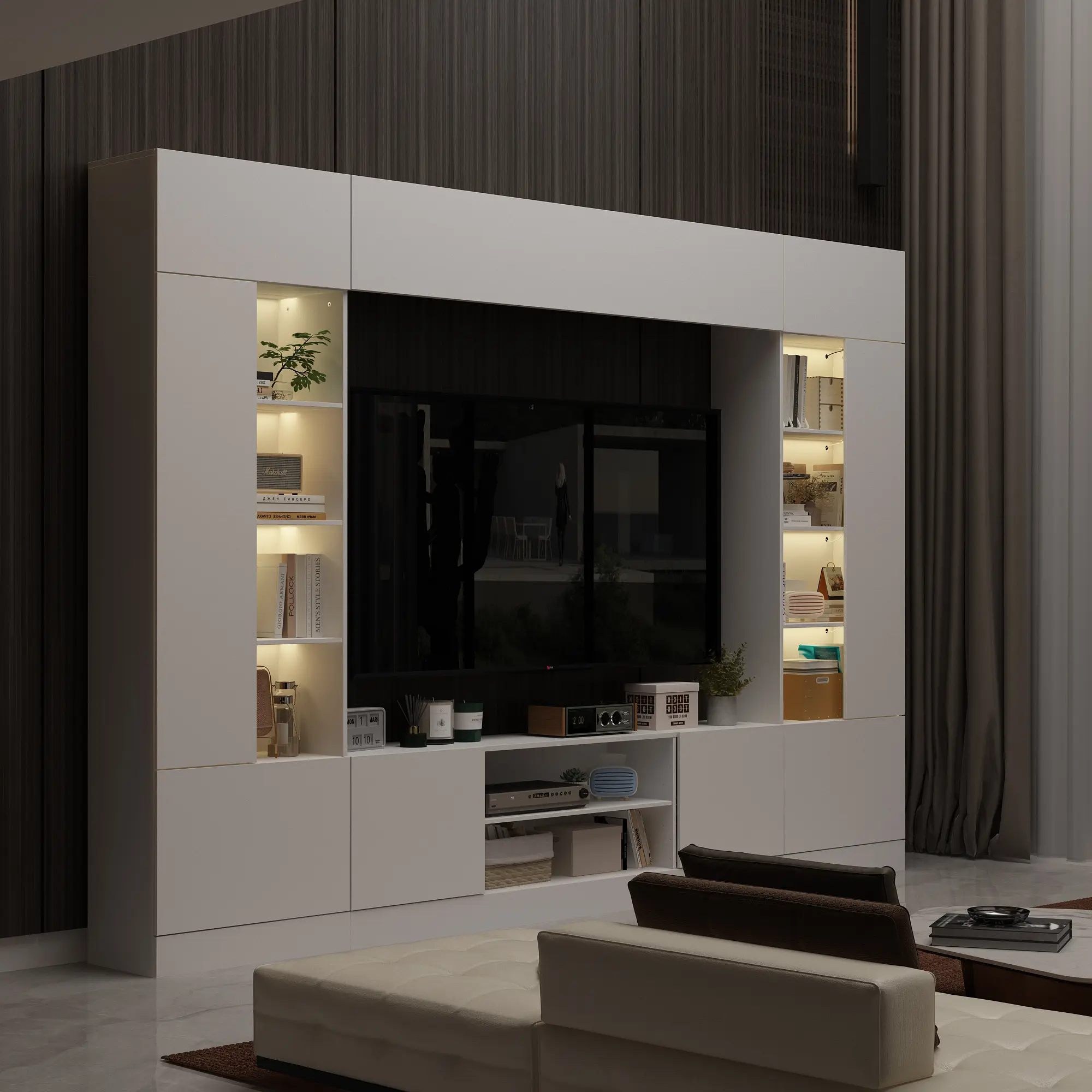 [Brings Neat to Your Living Room] - This white TV stand unit with LED lights has ample storage space, it comes with total 18 storage compartments, the shelves on the bookshelves are half-open to display the LED lights, the TV table with cord management hole will organize the wires in an orderly way. Sufficient space to accommodate your collection of DVDs, stereos, game machines, etc.