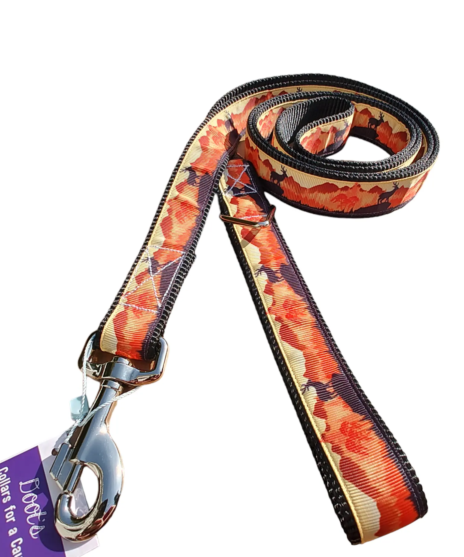 Doot's products are handmade and crafted in the USA using high quality materials. We are passionate about pets and proudly give back to help homeless pets in our community. Heavy Duty Sunset Forest dog collar on neon orange super heavy nylon webbingCollars: YKK side release plastic buckle with keeper and slide, welded triangle ring 1" super heavy nylon webbingMD- 12-17.5"LG- 13.5-21"XL- 17.5-28"Leashes: 6 ft long, 1" thick barrel swivel snap hook, welded triangle ring for hooking poop bags or keys, 1" super heavy nylon tensile strength 6,100 lbs