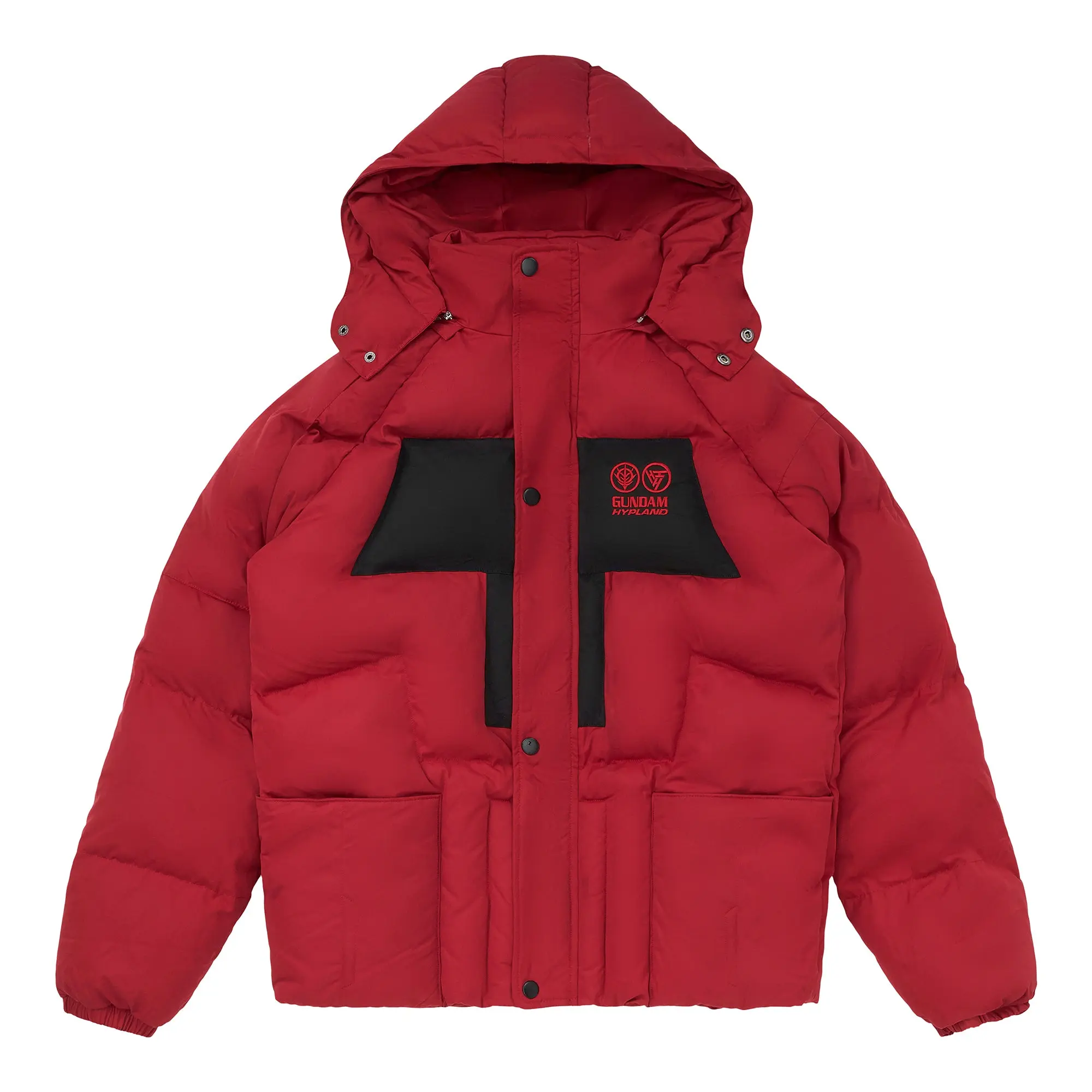 Hypland GUNDAM ZAKU Puffer Jacket Red with Hood, Front Pocket, and Button Closure, Suitable for Men, Casual Style, and Long Sleeve